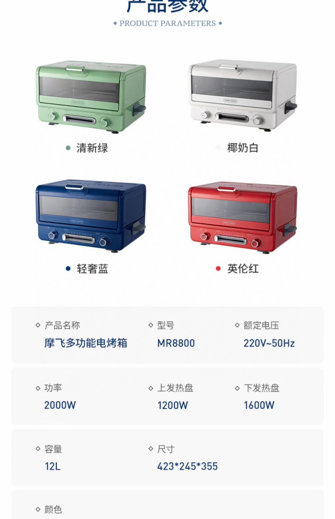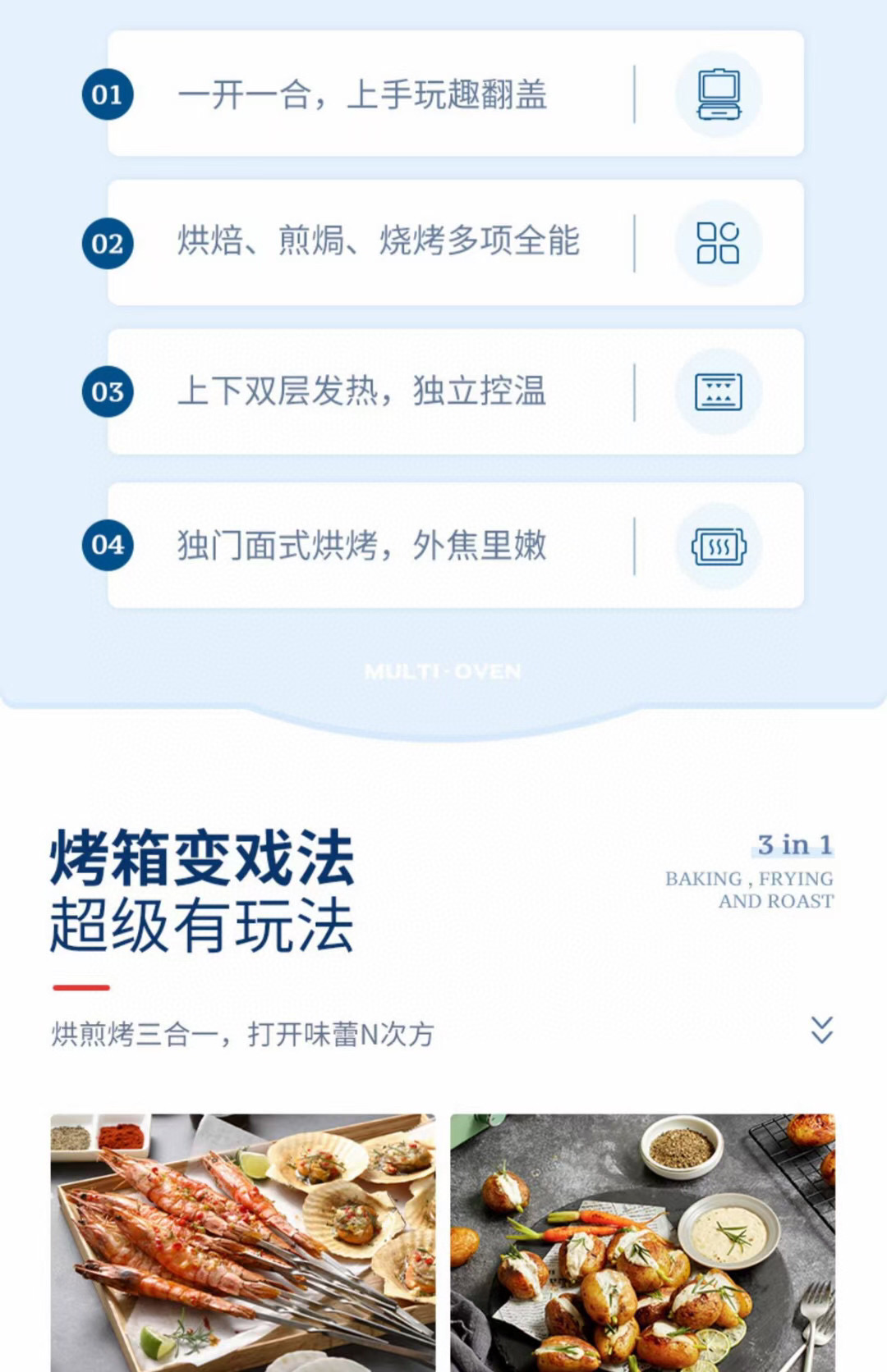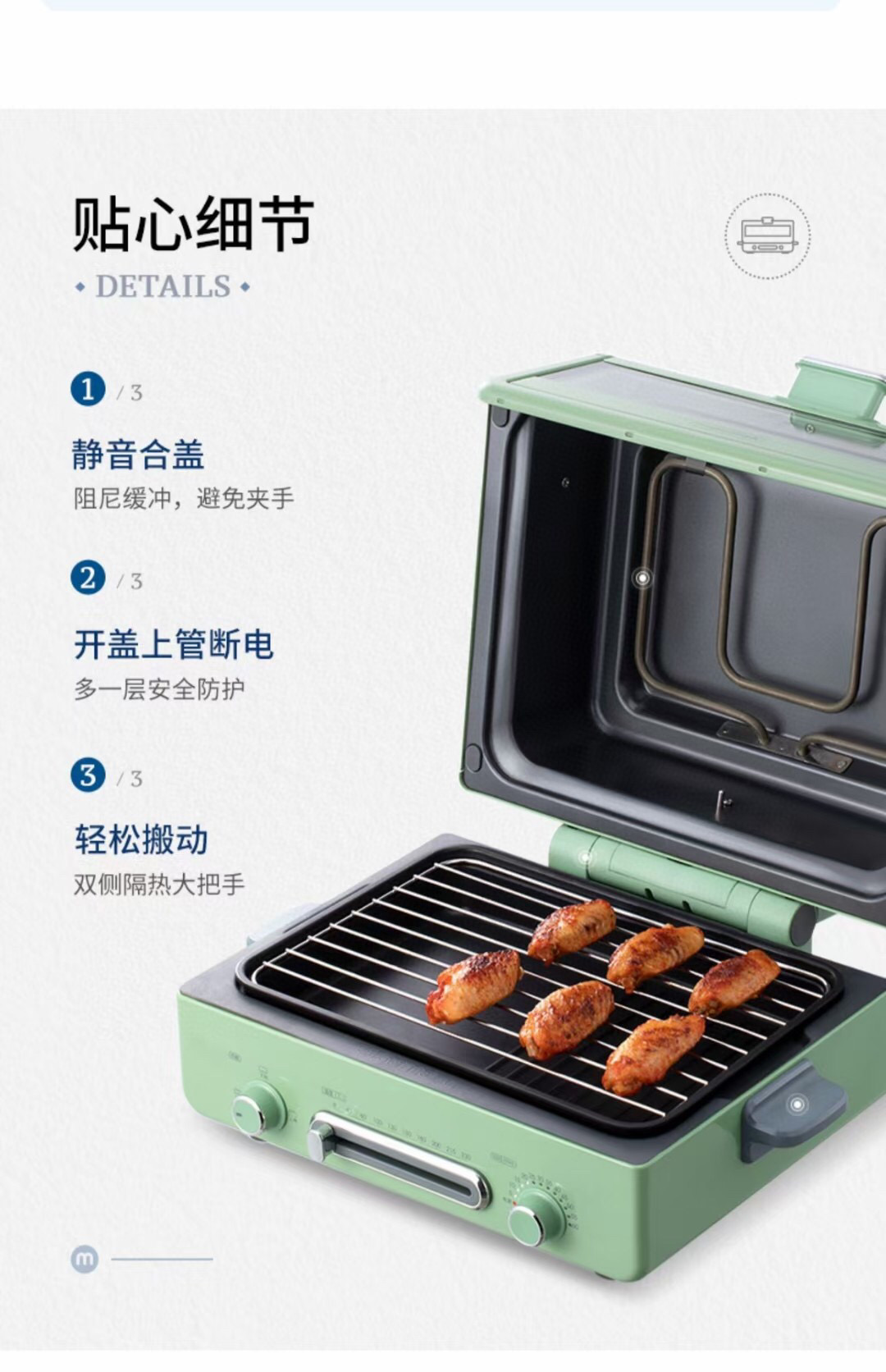 1静音合盖,阻尼缓冲,避免夹手。2开盖上管断电。3.轻松搬动。4创新上管下盘烘烤,2000W火力。5烤箱+煎锅二合一。6大容量12L,满足全家使用。