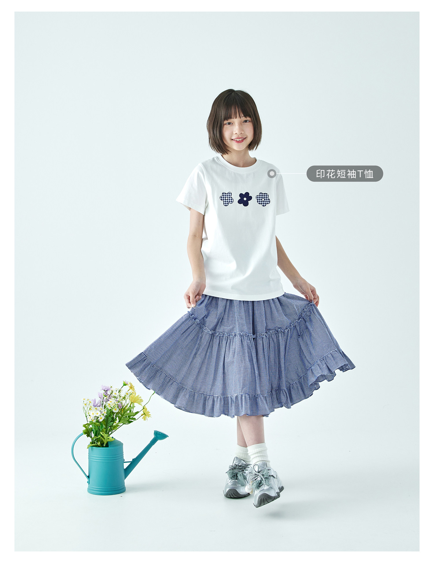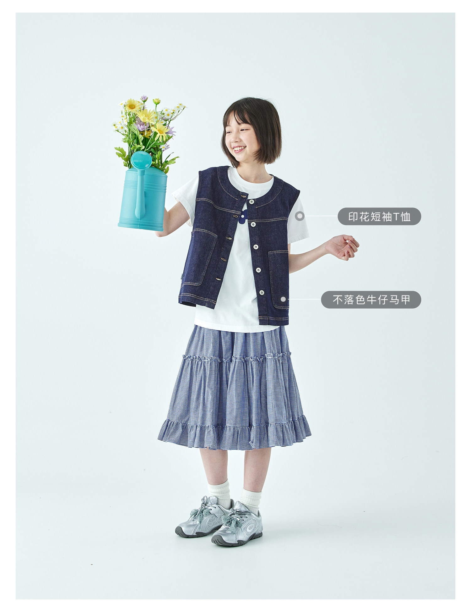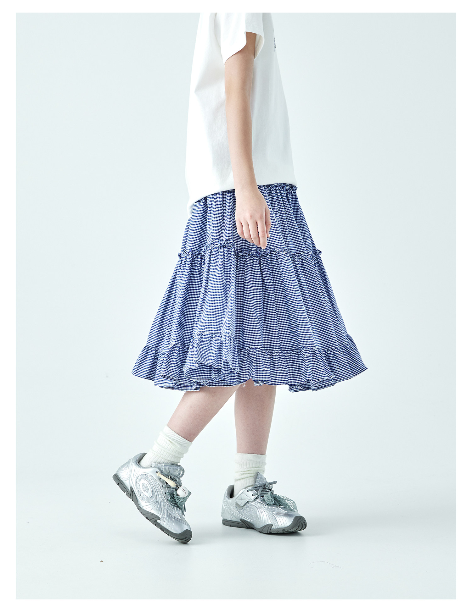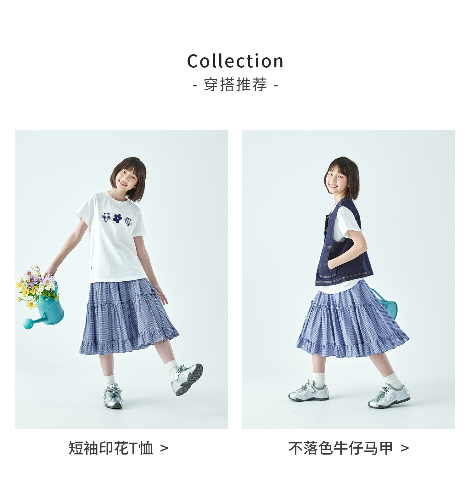 棵初2026年春季新款亲子中大女童深蓝格纹复古半裙宽松好搭A字裙