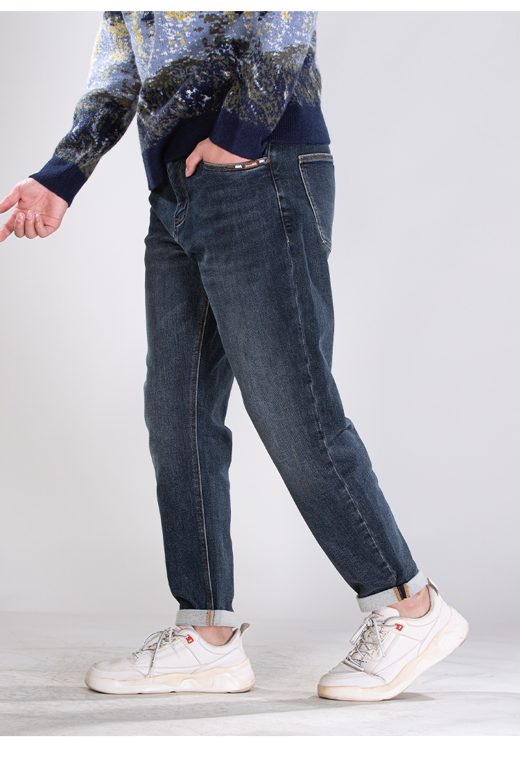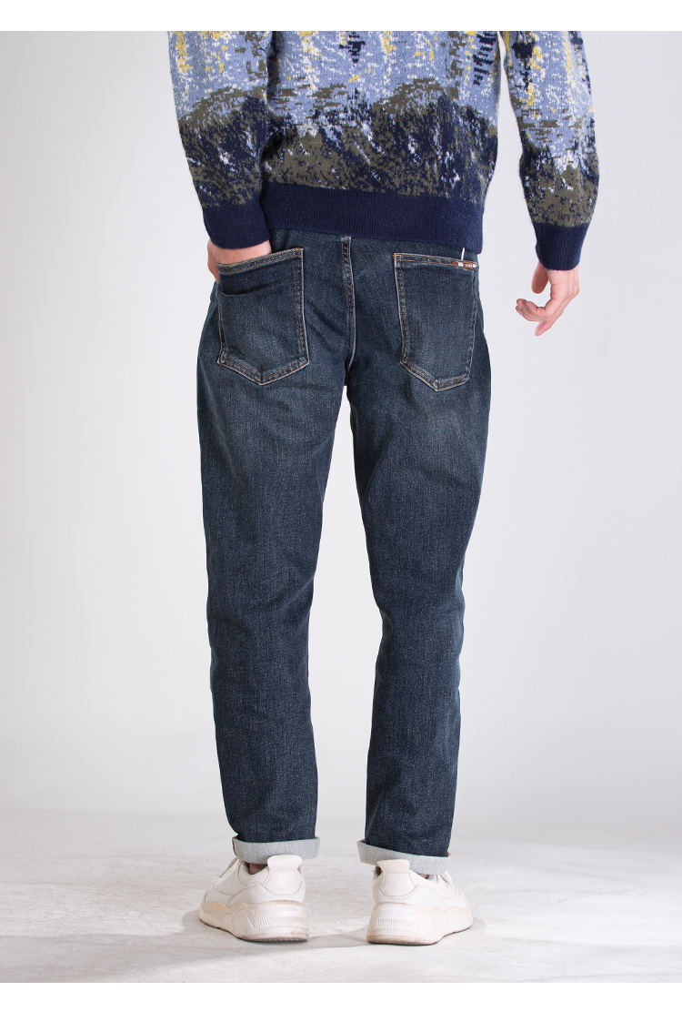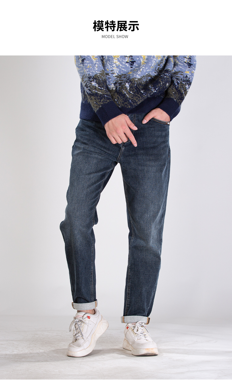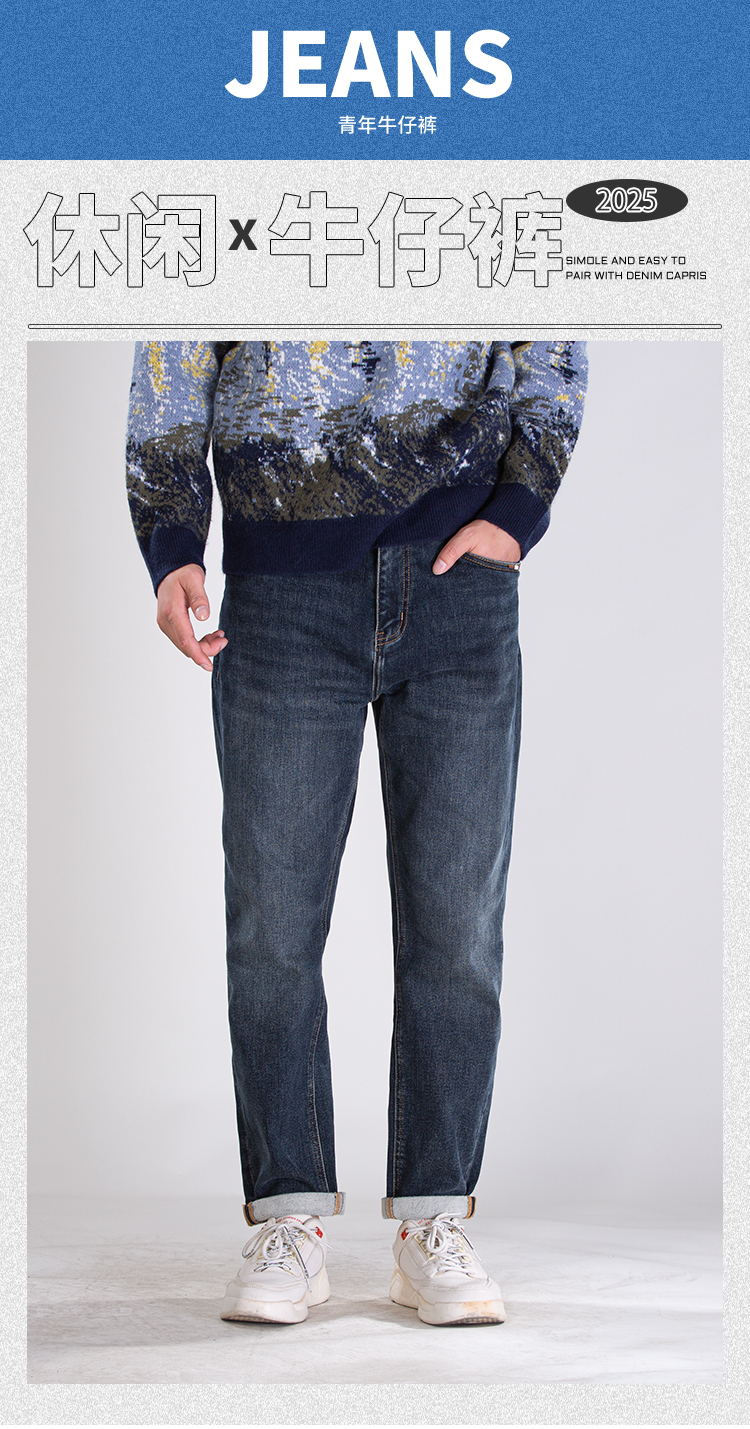 DRONKOO 2025 正常腰左袋绣线织唛底磨毛厚牛仔长裤
