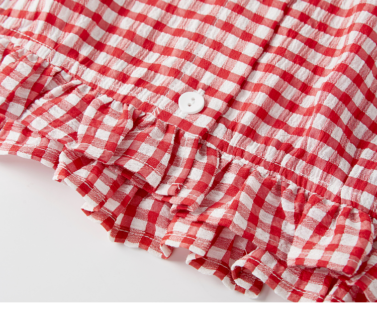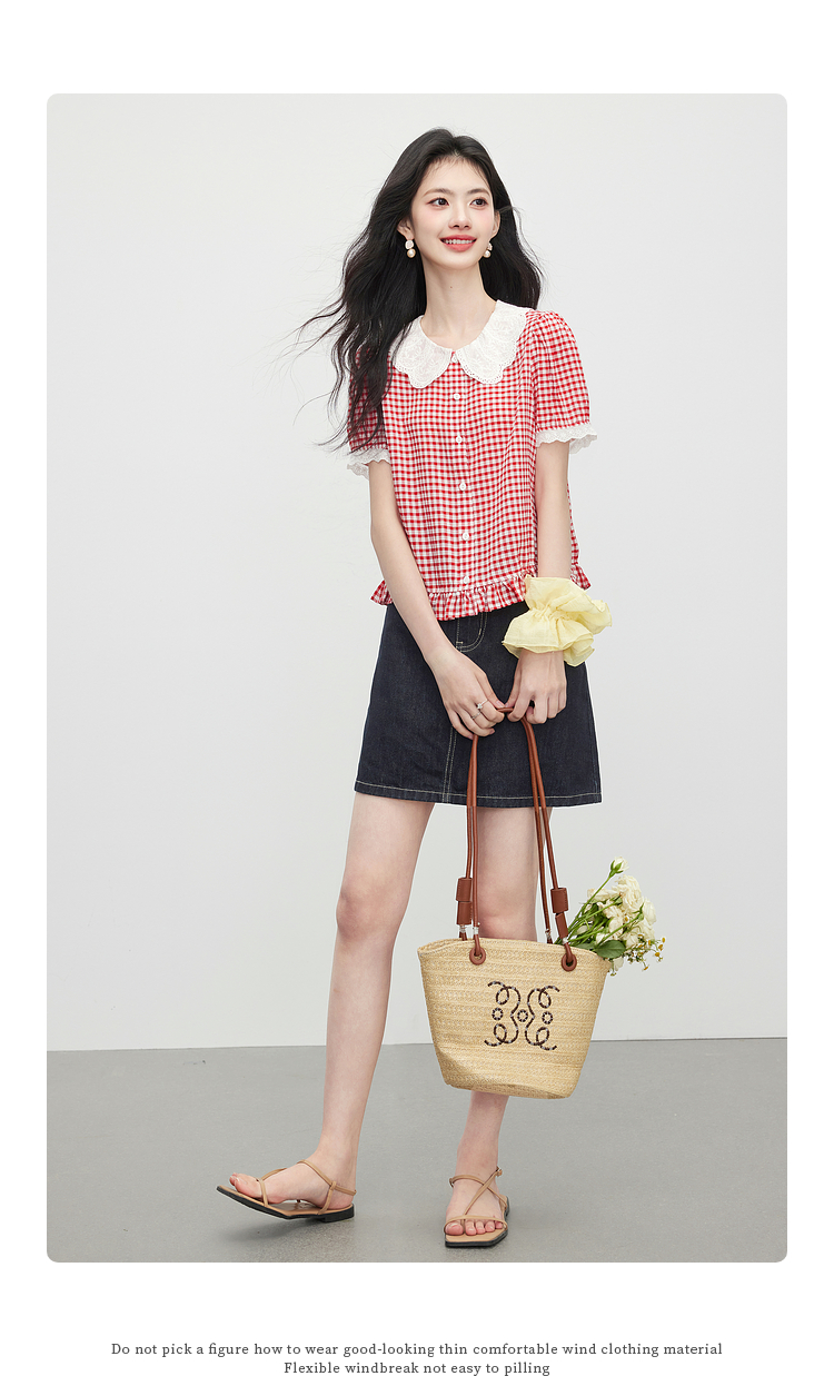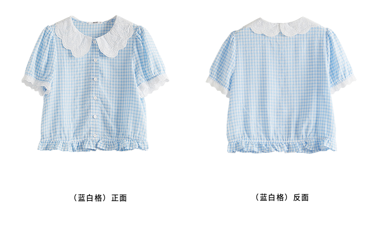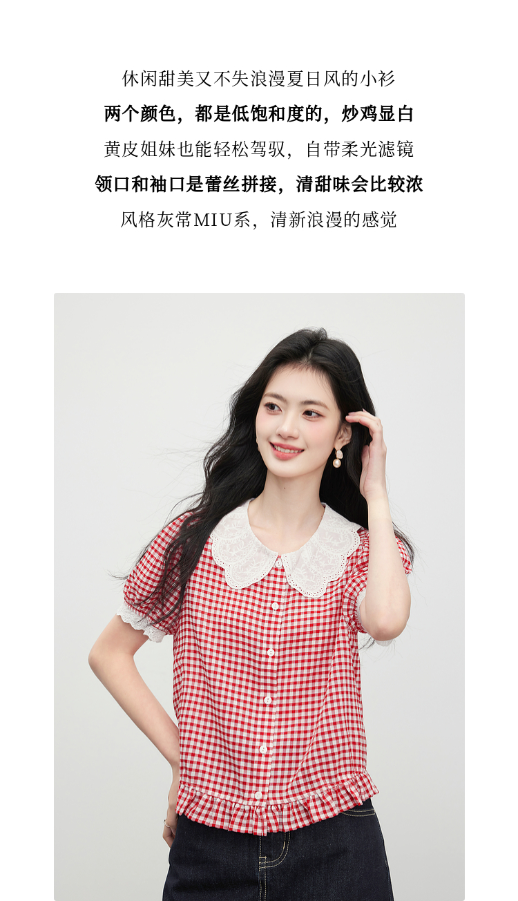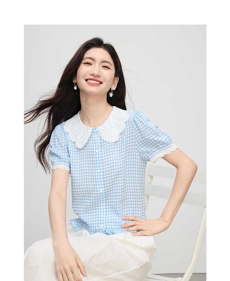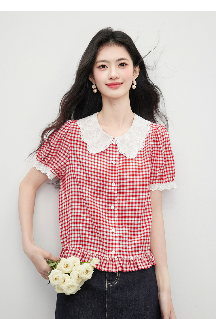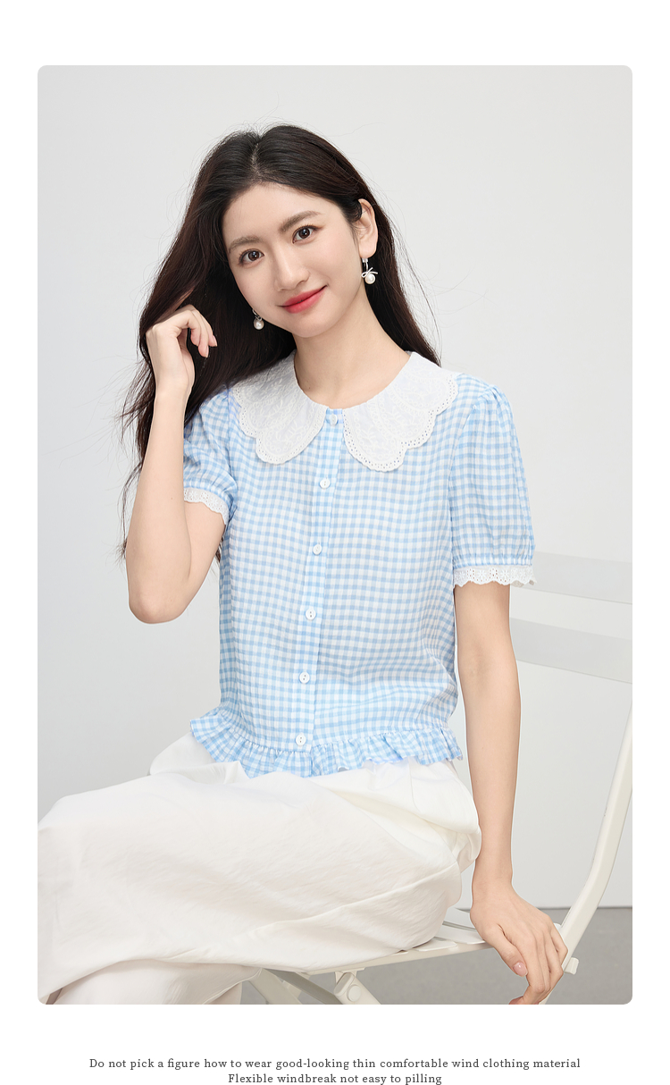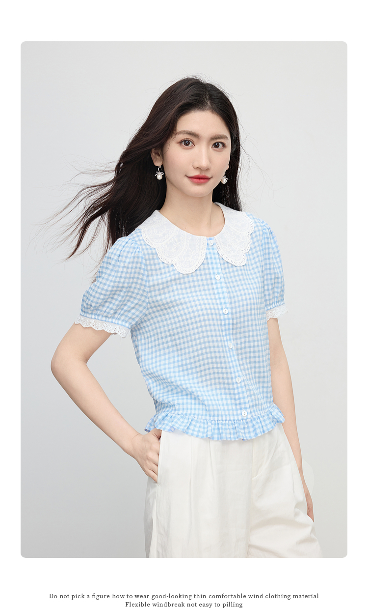 【07/09新品】熙世界蕾丝花边翻领格纹衬衫女设计感夏季短袖甜美减龄娃娃衫上衣