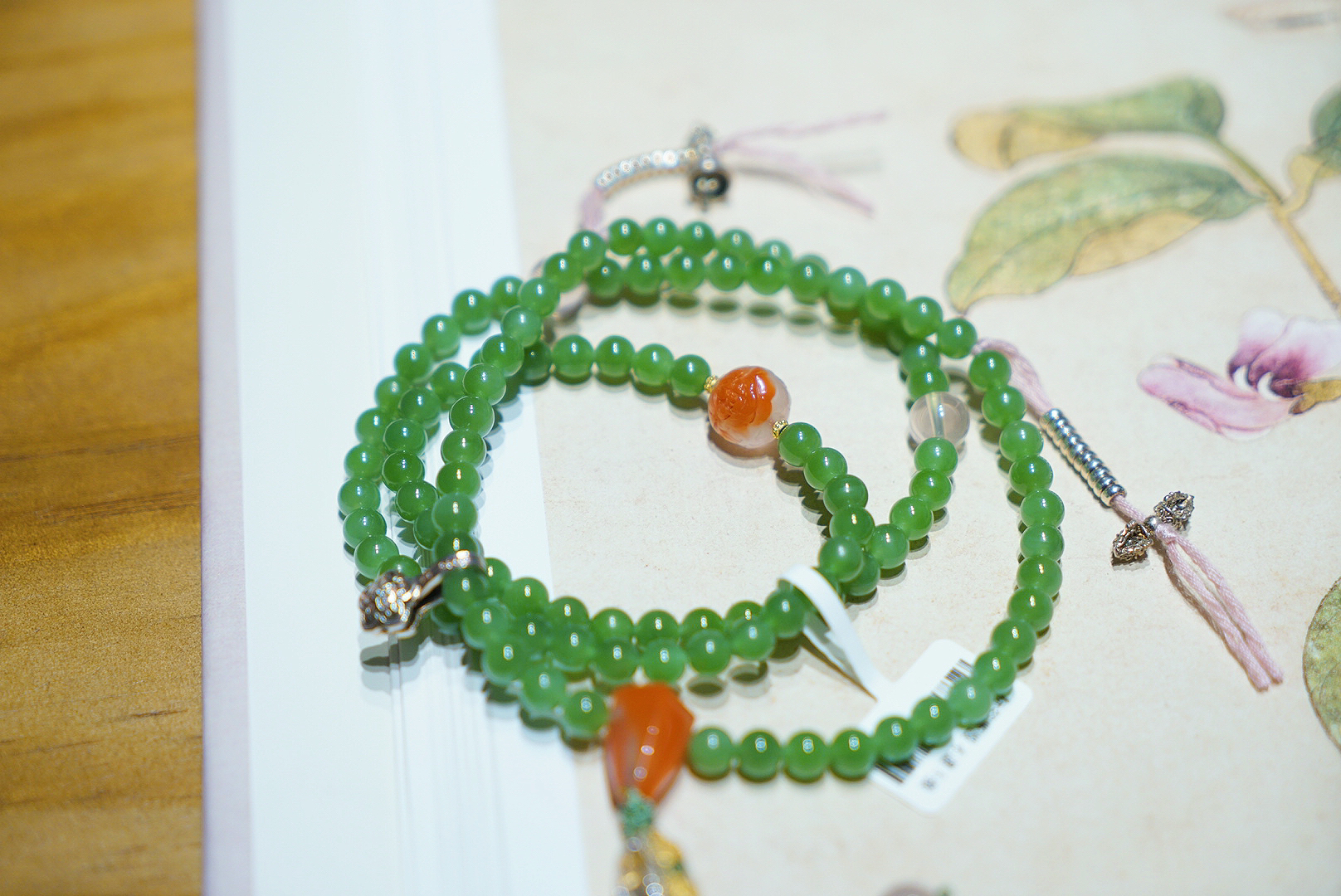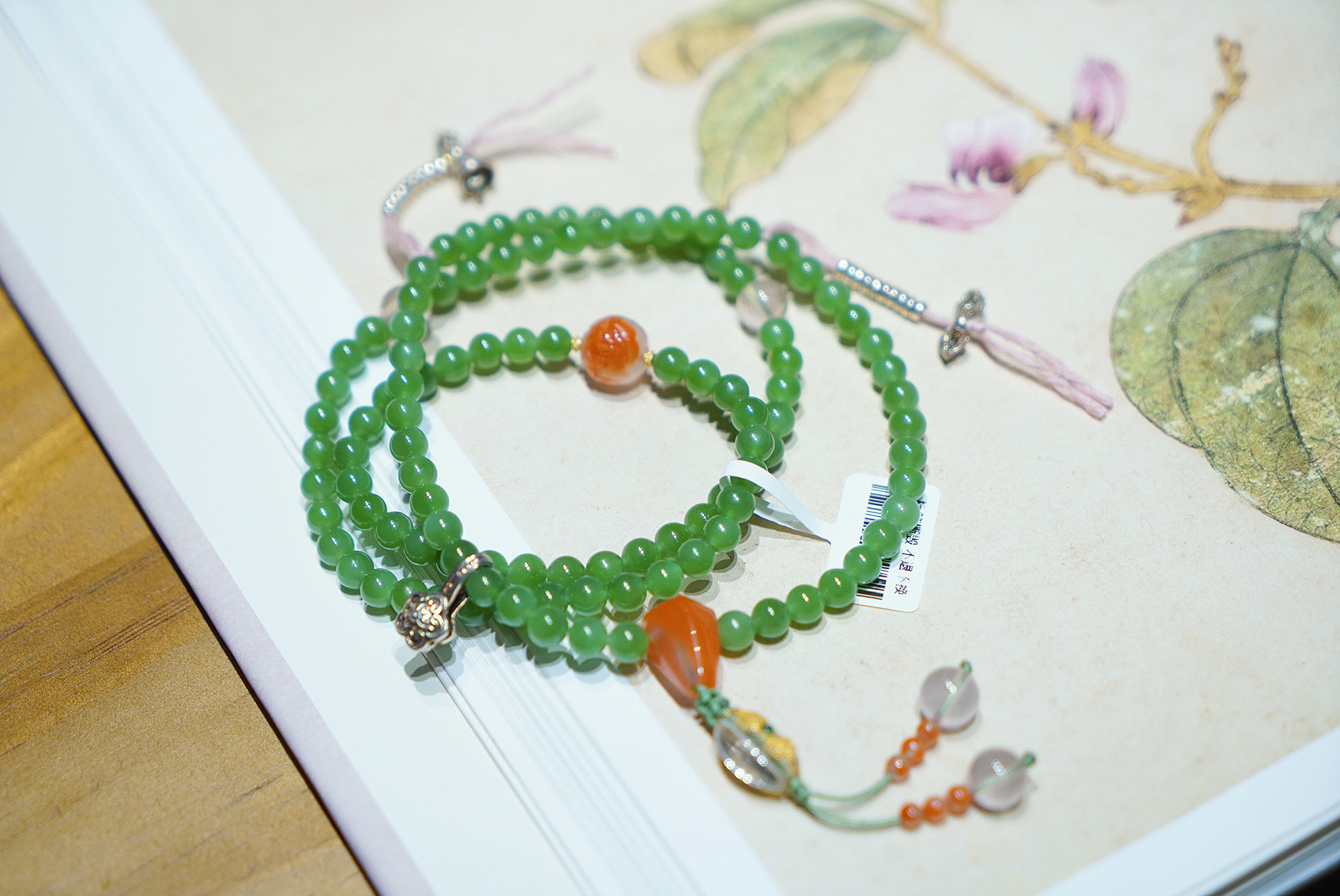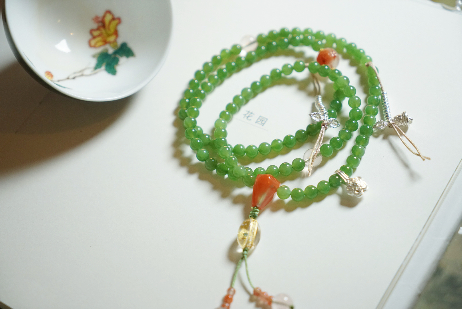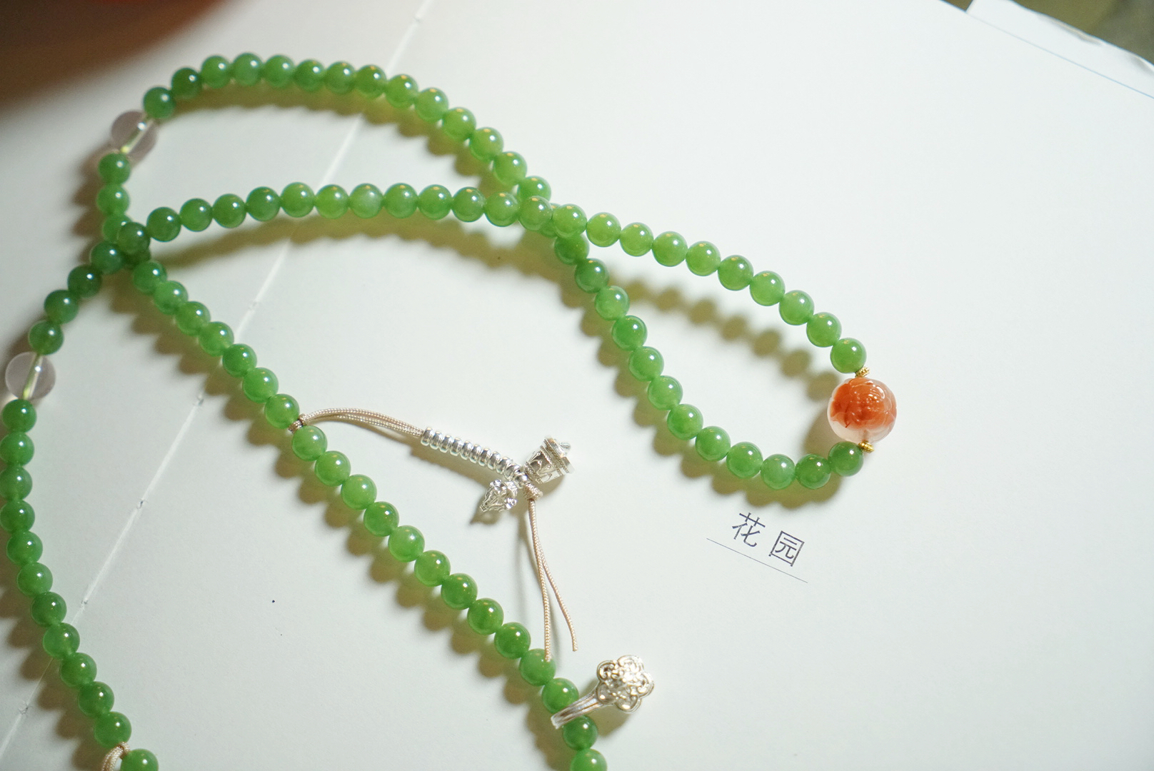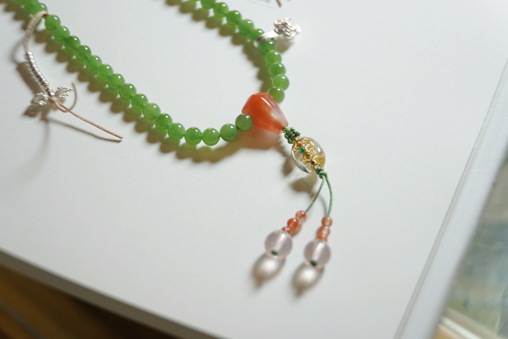 这条真的太适合文艺女主了,嘿嘿,顶珠也是强品控南红玛瑙花珠,俏色雕刻,又冰透又红润,微橘。配三通南红玛瑙,整体与果绿色相呼应,不仅清新还很有生命力的感觉,白水晶18k金镶嵌复古花丝,很有味道,腰珠选用粉晶,整体和谐又充满心轮之爱,这会怎么想起了绿度母呢。