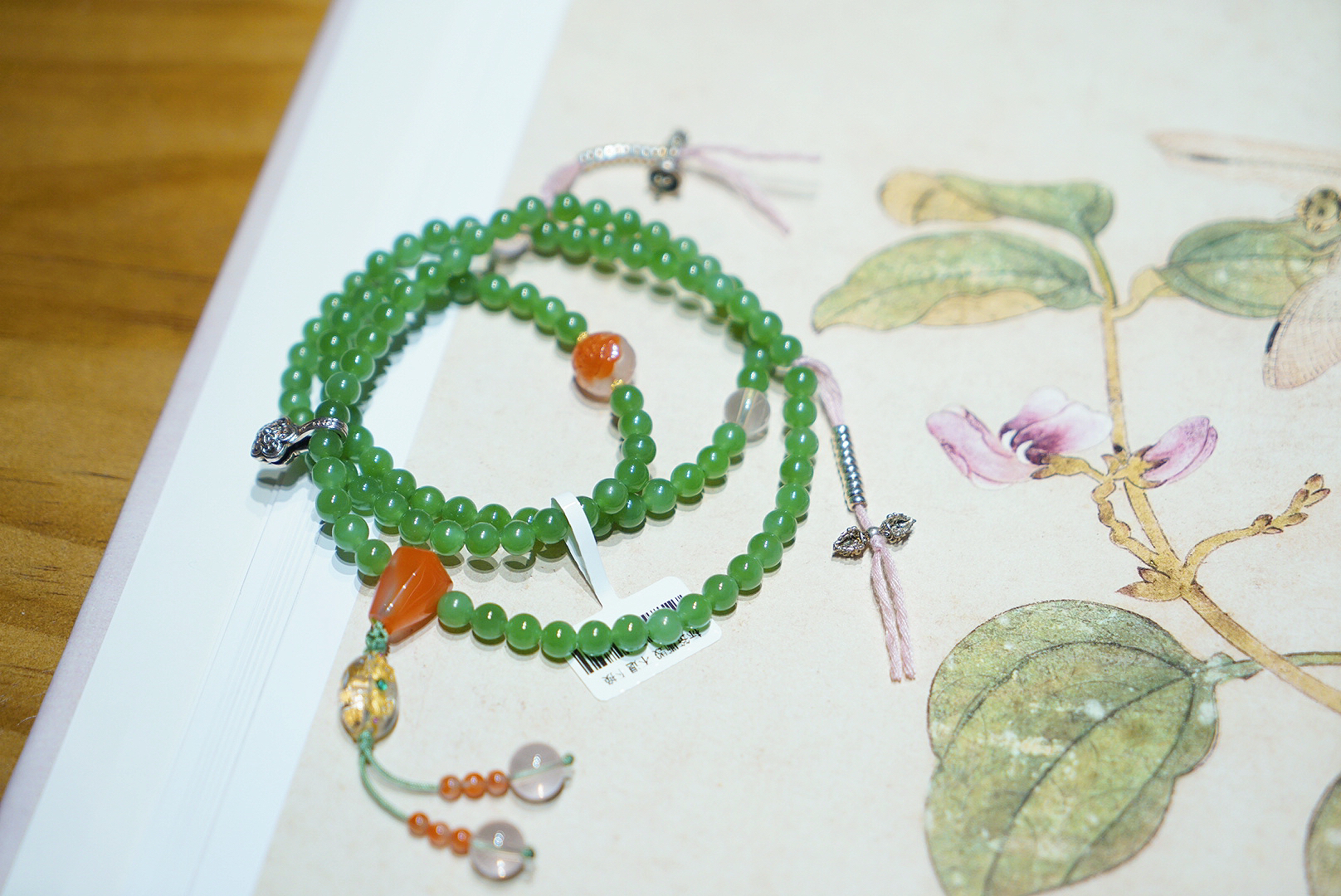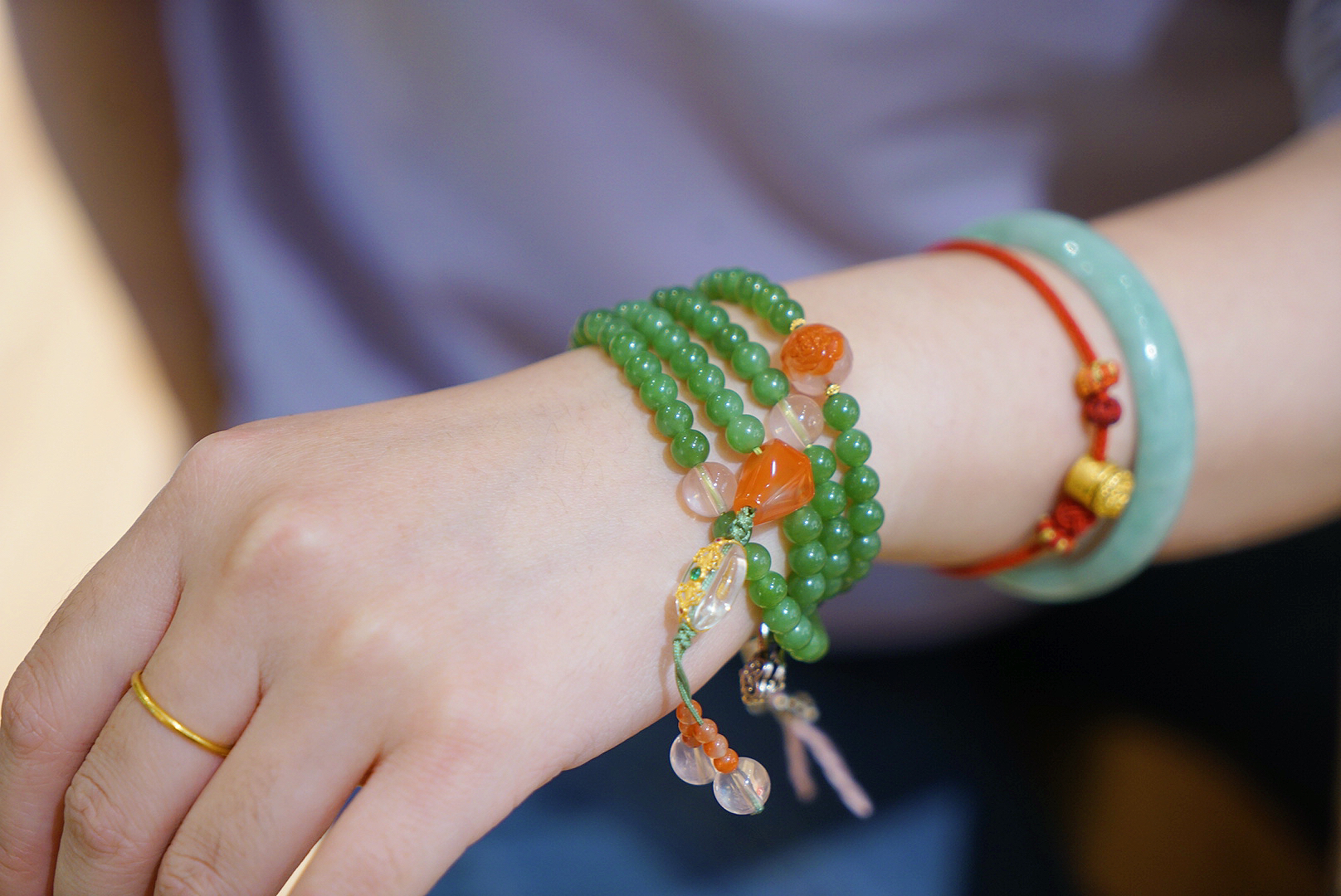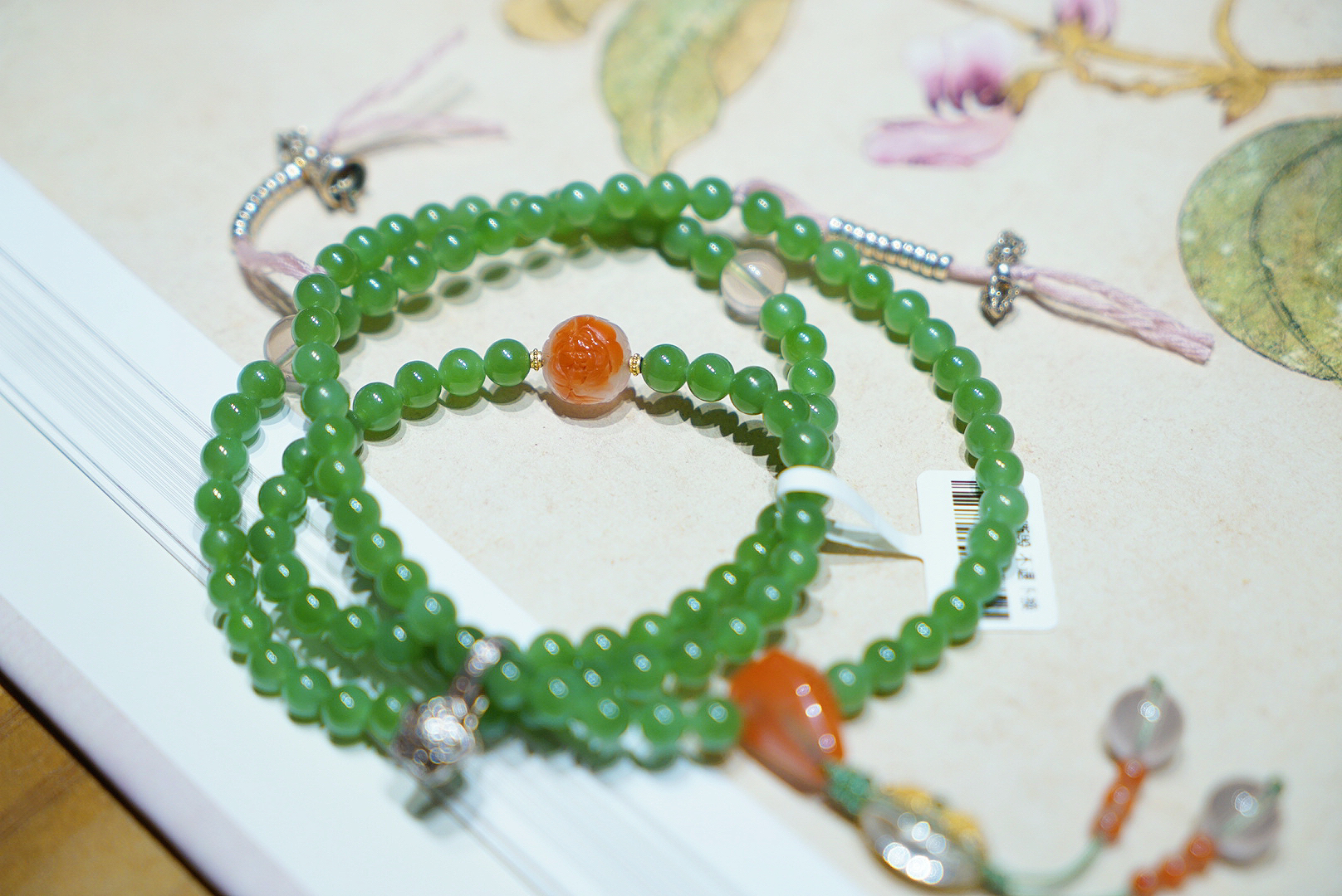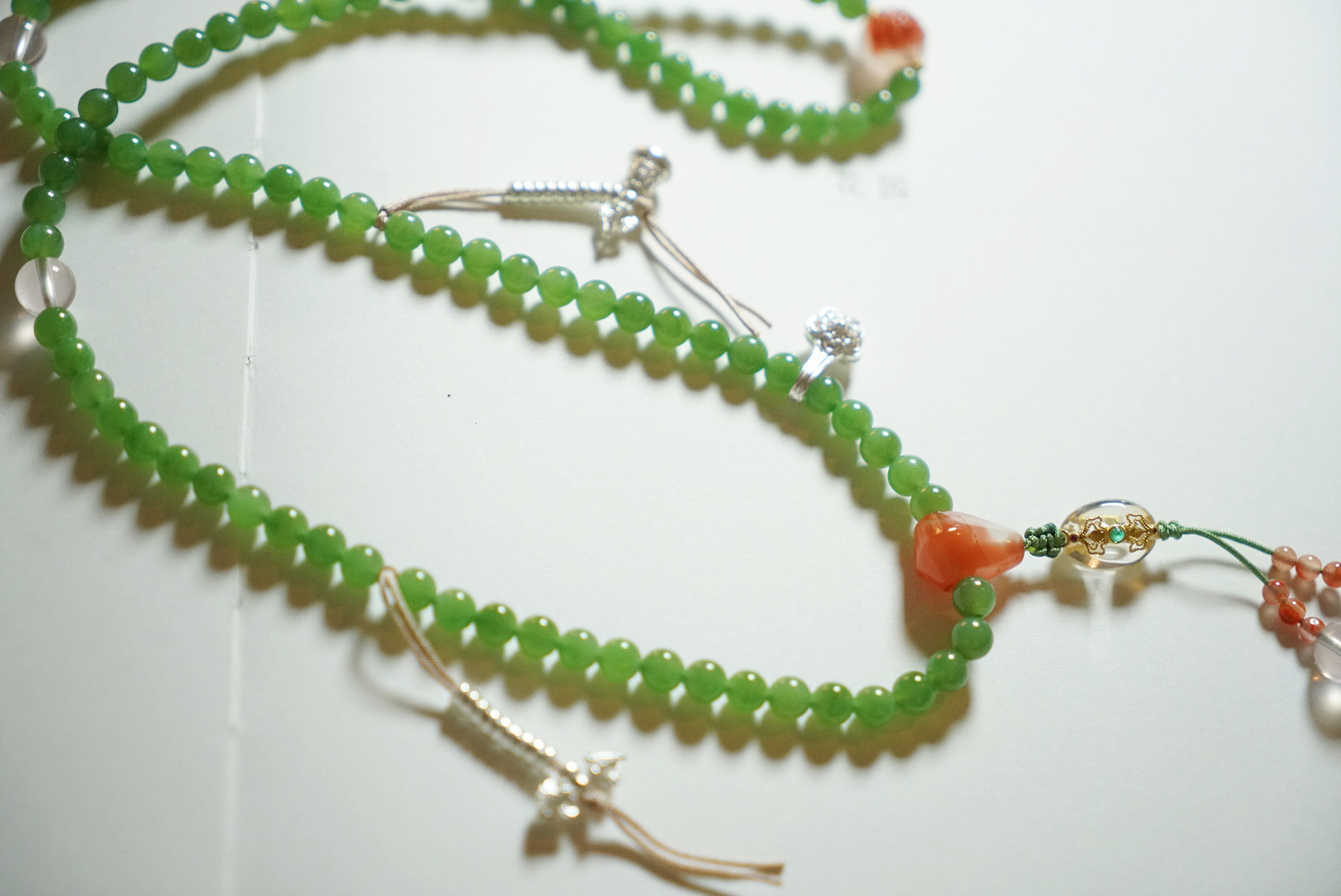这条真的太适合文艺女主了,嘿嘿,顶珠也是强品控南红玛瑙花珠,俏色雕刻,又冰透又红润,微橘。配三通南红玛瑙,整体与果绿色相呼应,不仅清新还很有生命力的感觉,白水晶18k金镶嵌复古花丝,很有味道,腰珠选用粉晶,整体和谐又充满心轮之爱,这会怎么想起了绿度母呢。