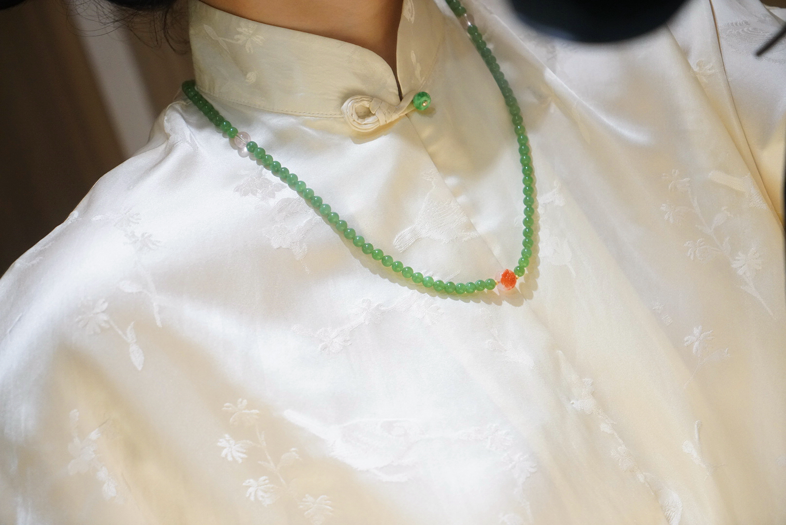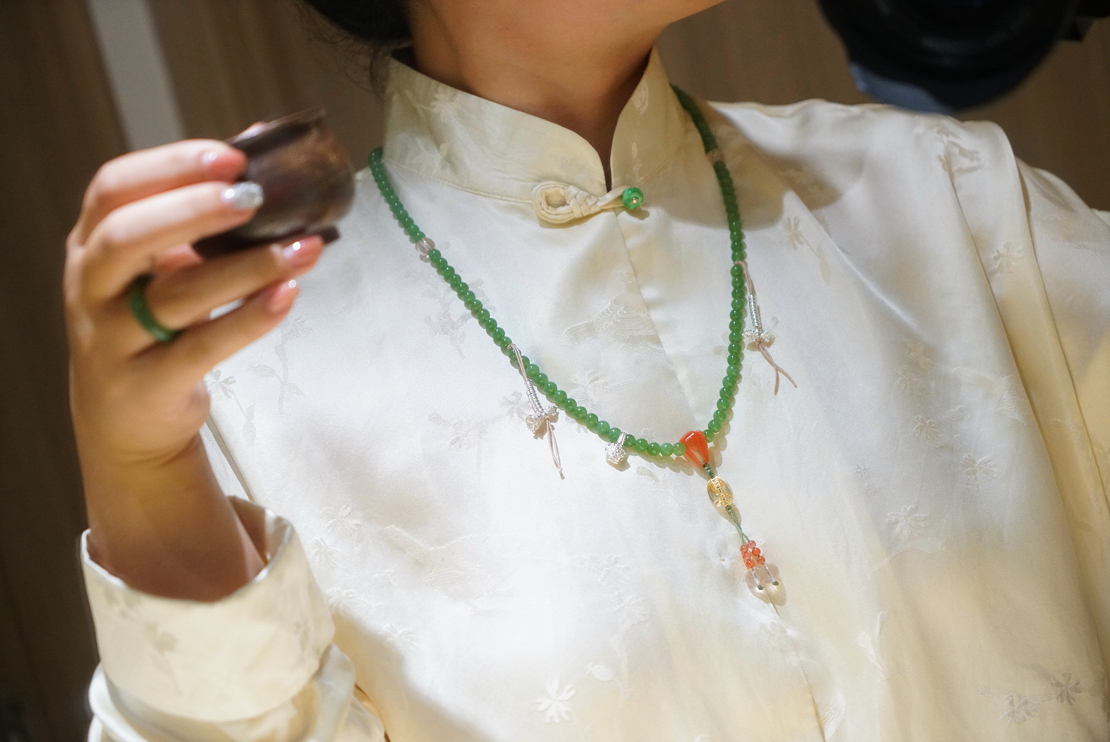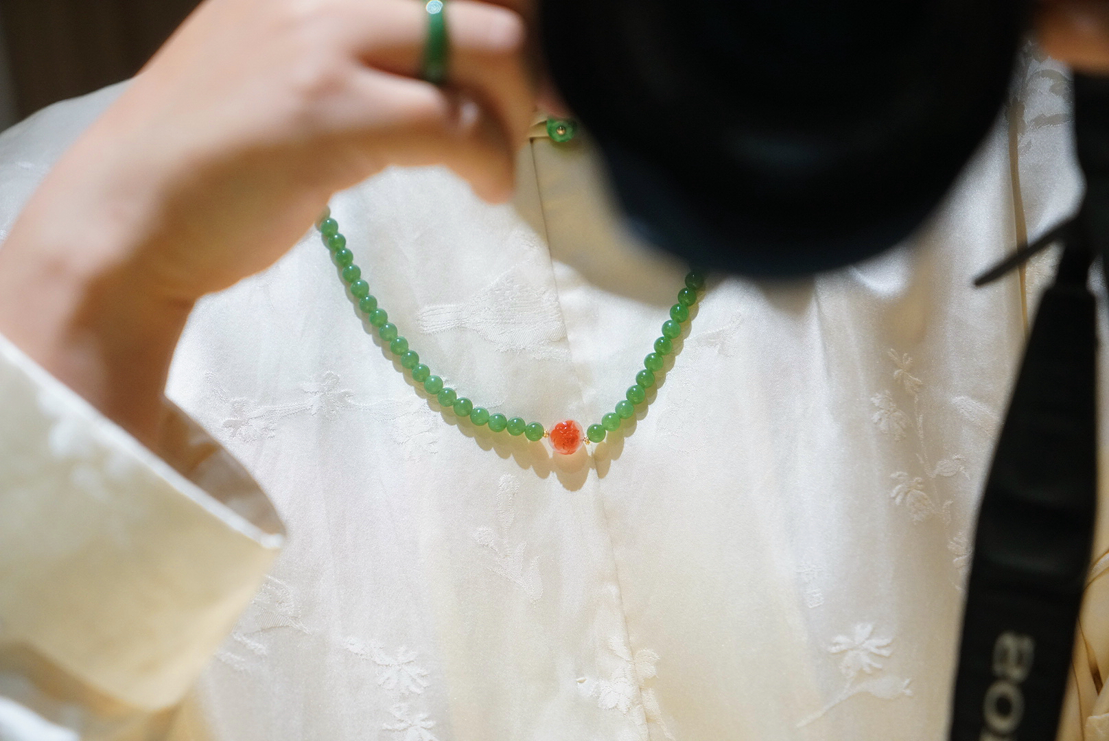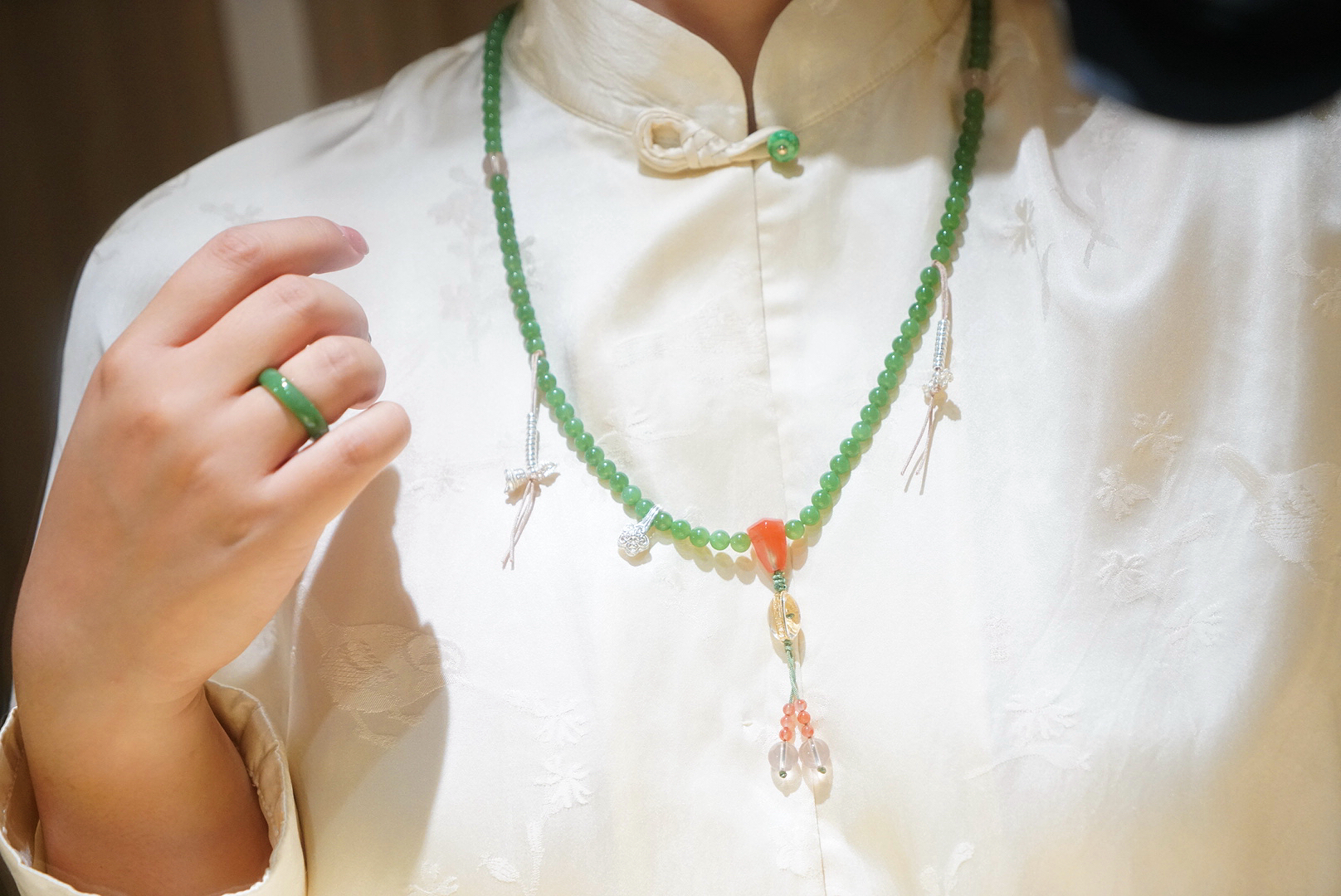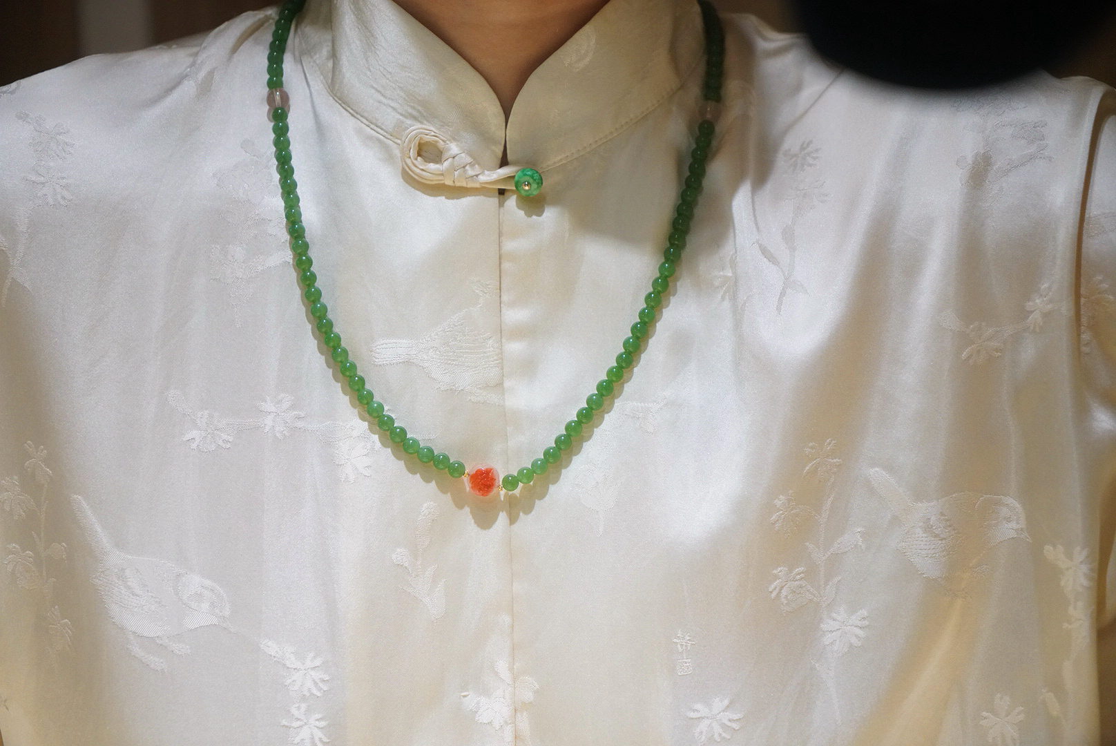 这条真的太适合文艺女主了,嘿嘿,顶珠也是强品控南红玛瑙花珠,俏色雕刻,又冰透又红润,微橘。配三通南红玛瑙,整体与果绿色相呼应,不仅清新还很有生命力的感觉,白水晶18k金镶嵌复古花丝,很有味道,腰珠选用粉晶,整体和谐又充满心轮之爱,这会怎么想起了绿度母呢。