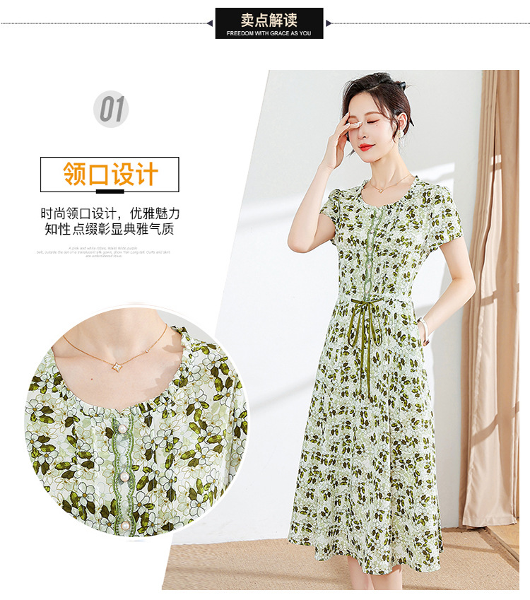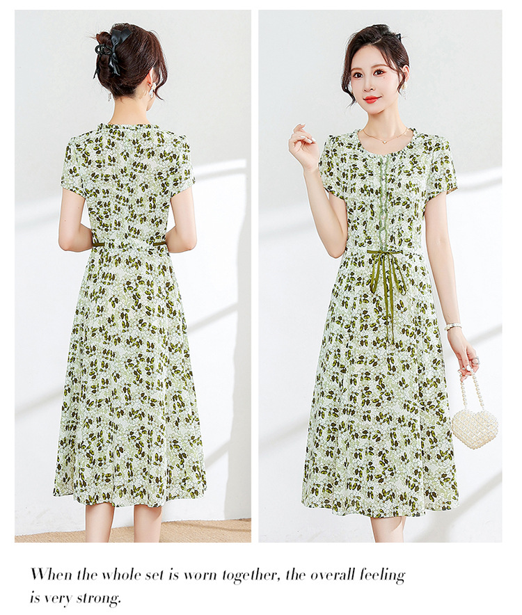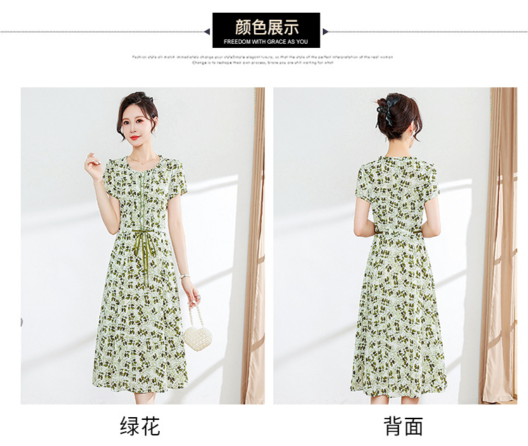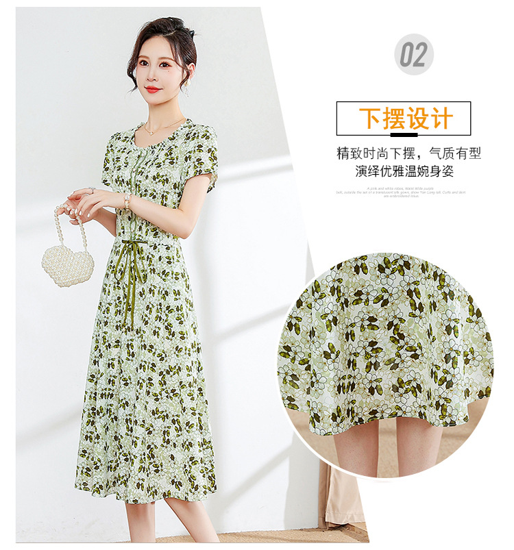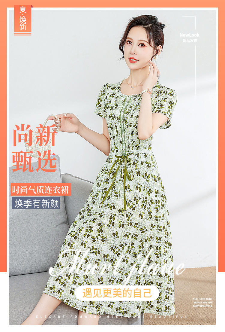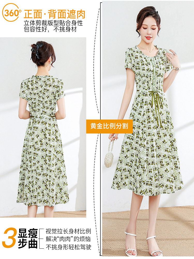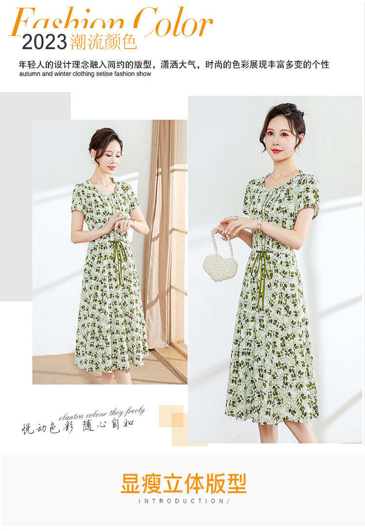 夏款修身,印花中长款大码系带时尚雪纺裙圆领短袖连衣裙QYM-FL-23778-L
