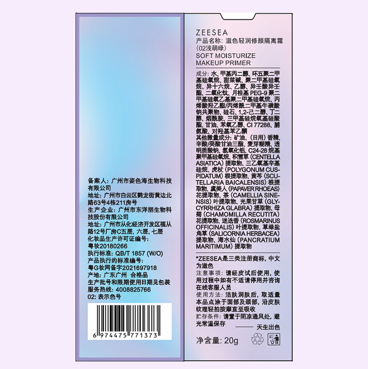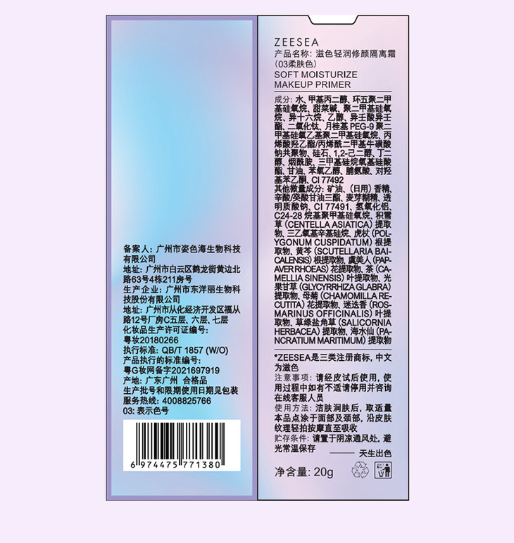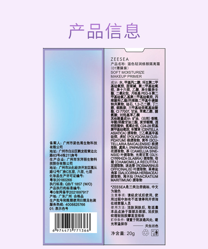 [隔离霜]【2件5折 | 满3件送水桶包】ZEESEA滋色轻润修颜隔离霜20g-爱丽丝圆管隔离