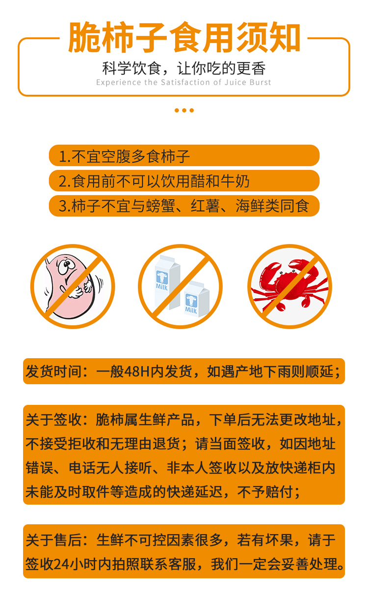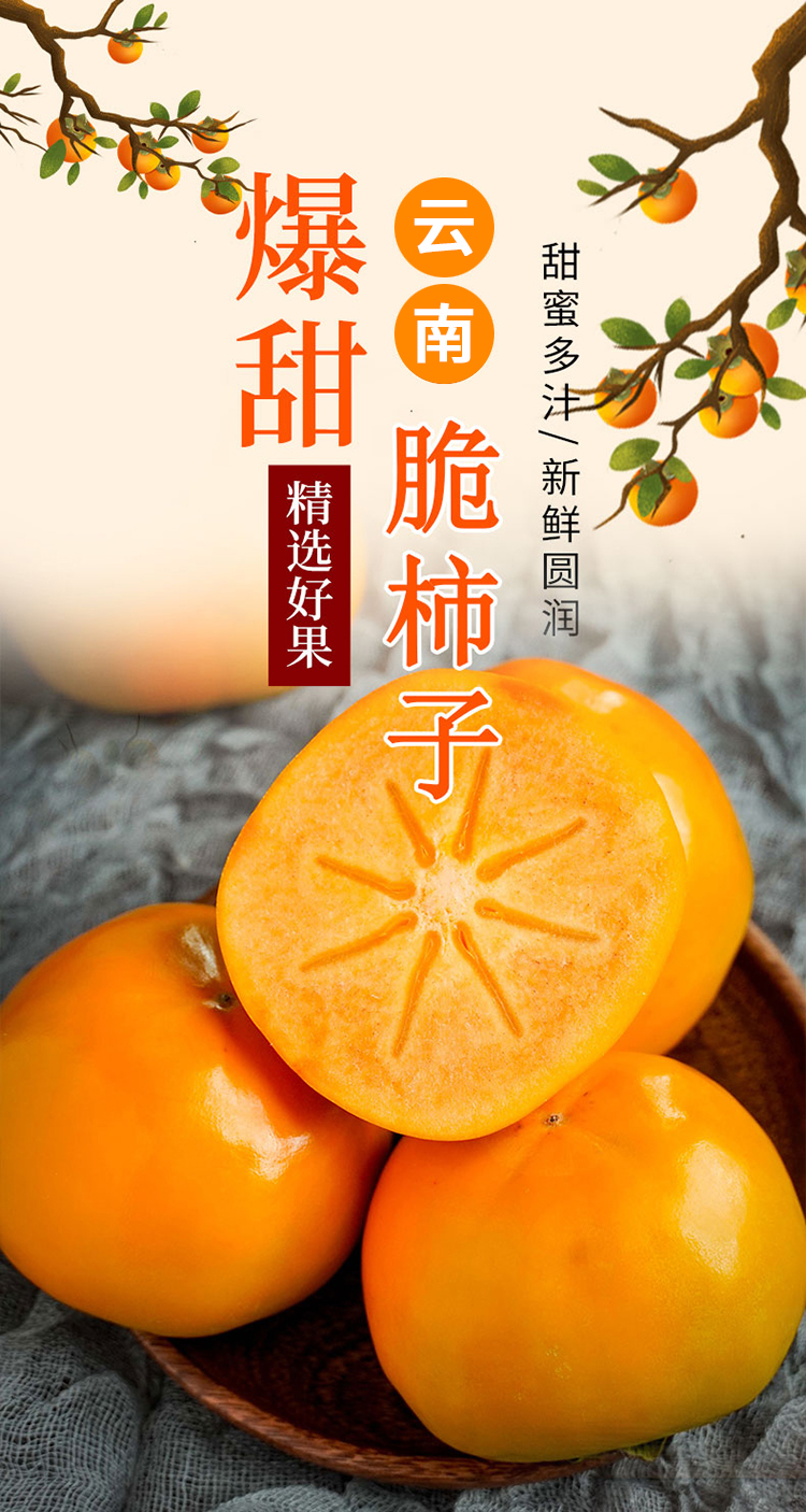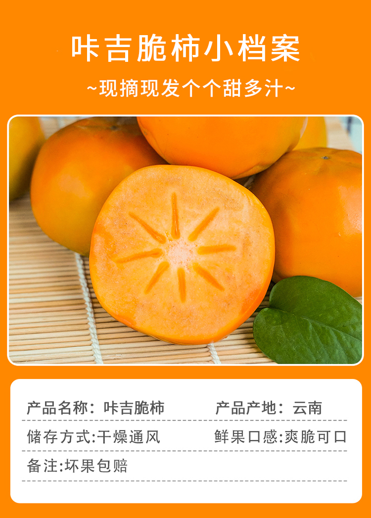 品名:脆柿规格:宝宝果(5斤约15-18枚),大果(5斤约13-17枚),特大果发货地/产地:云南/云南保质期: 初级农产品,建议收到后尽快食用。包装方式:箱装物流信息:四通一达或其它快递随机发货,不接受指定快递。不发货区域:新疆、西藏、海南、内蒙、青甘宁、港澳台、疫情管控区。 |