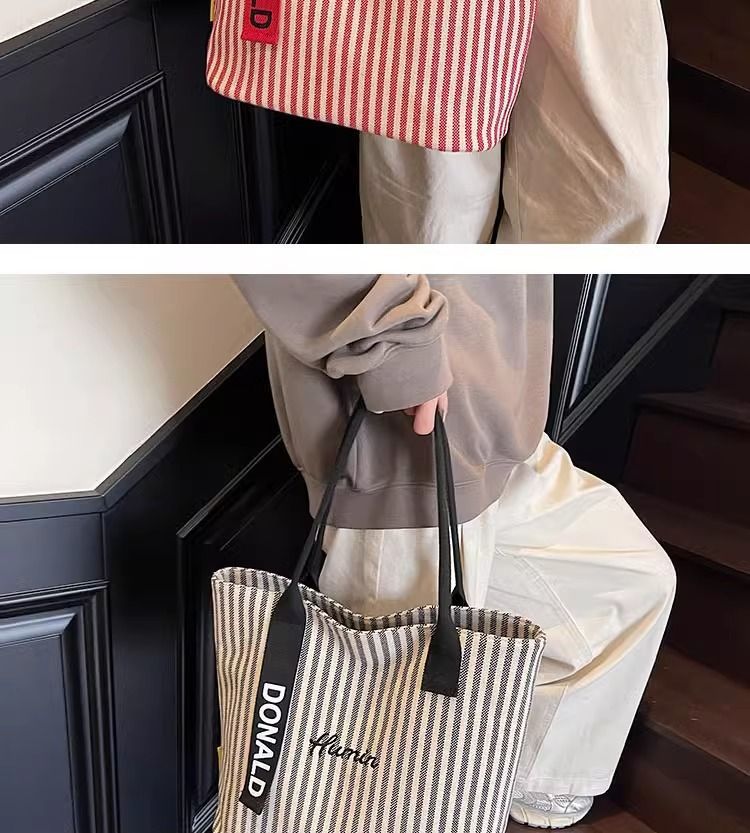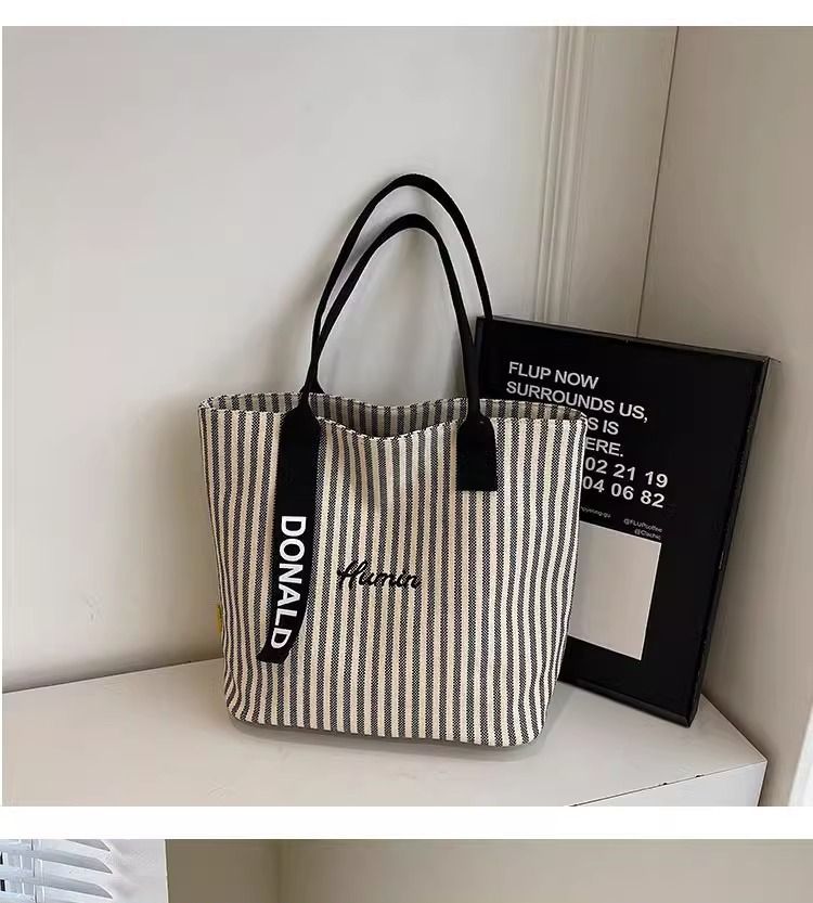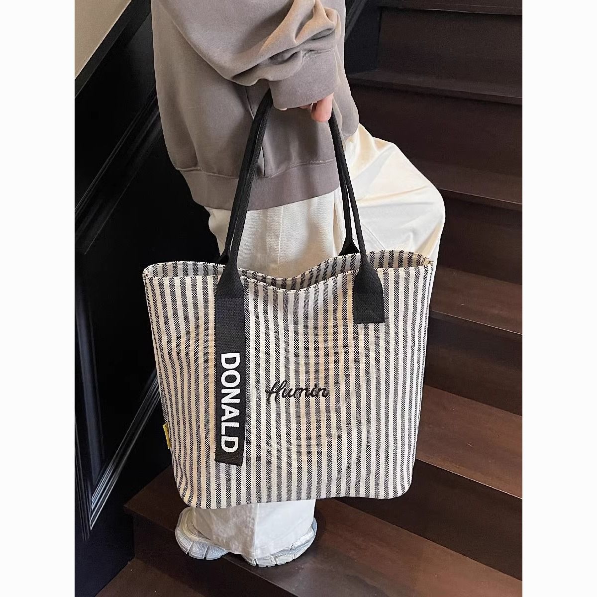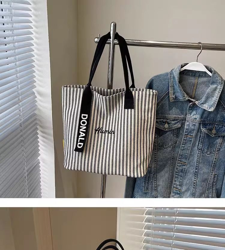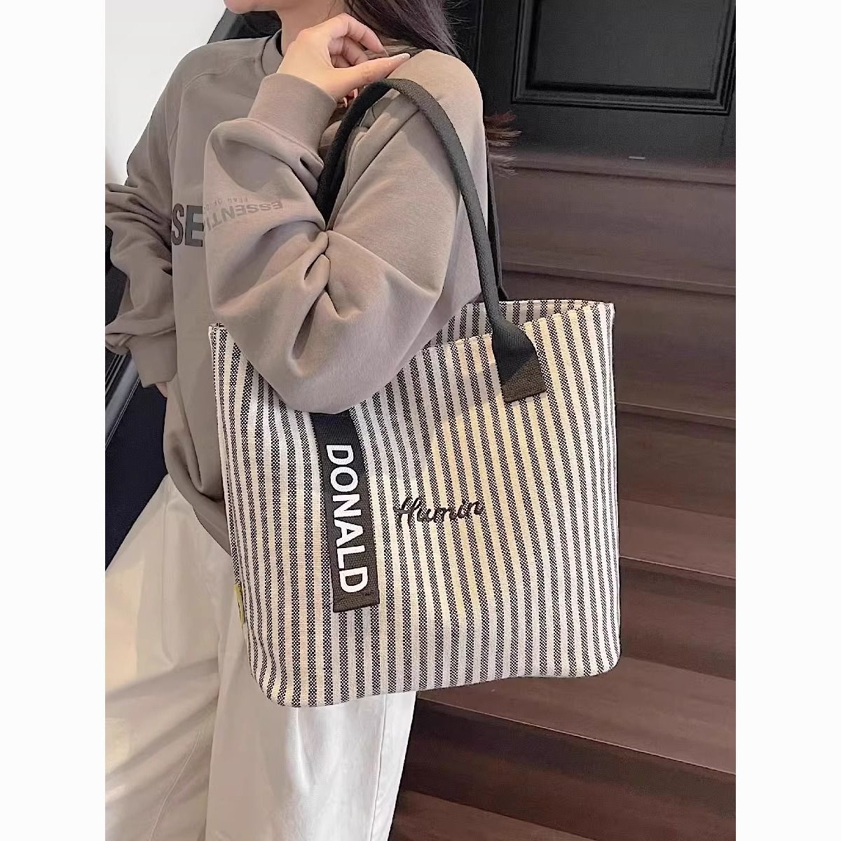 【百搭休闲】大容量帆布包包女百搭条纹单肩包学生上课通勤手提托特包。ya