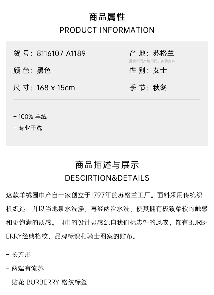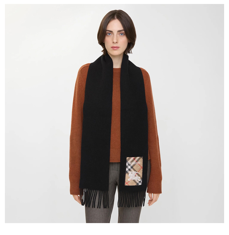BURBERRY 巴宝莉 女士马术骑士徽标格子标签羊绒围巾 黑色 8116107 A1189