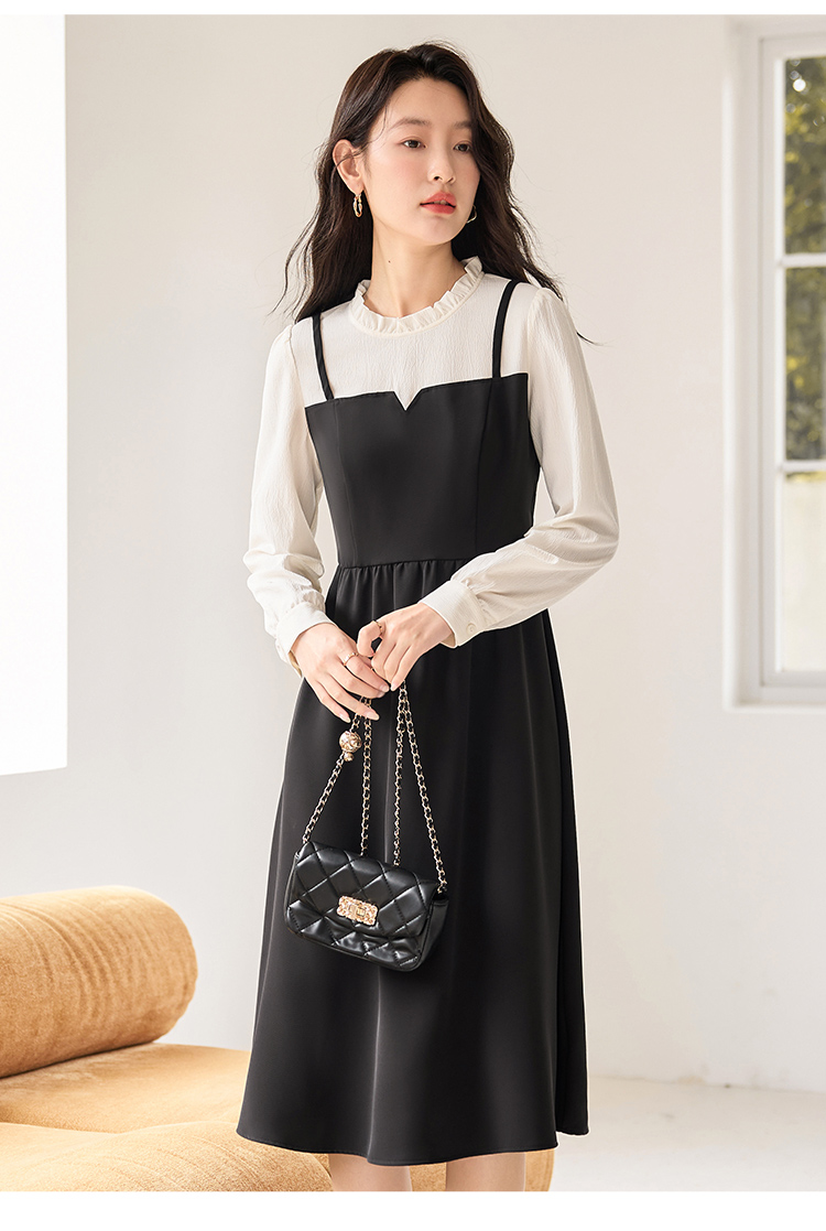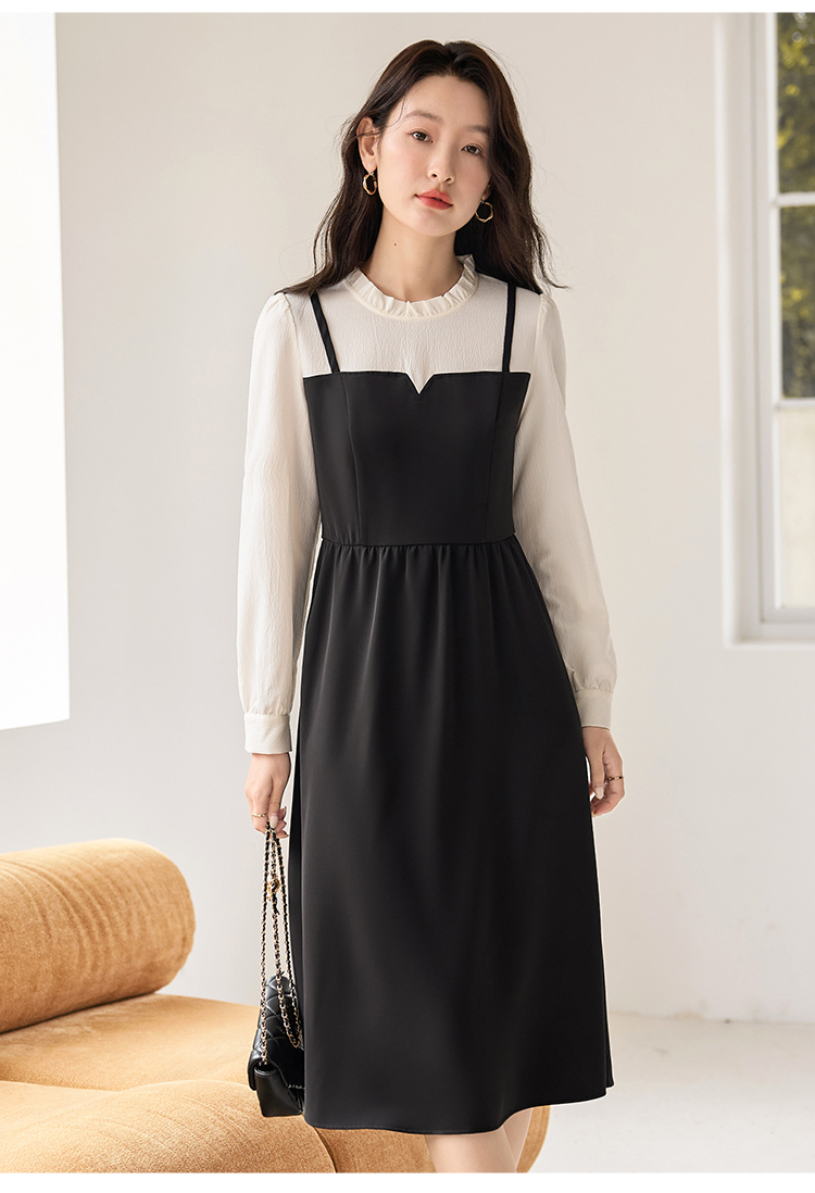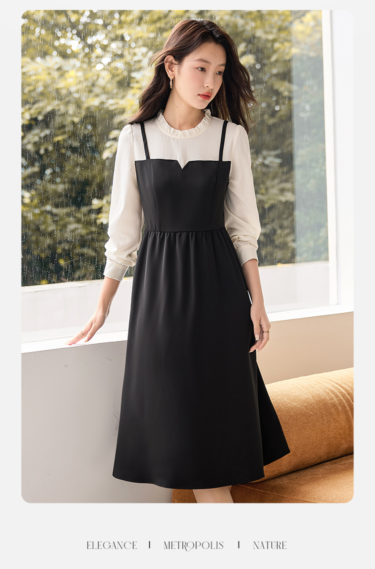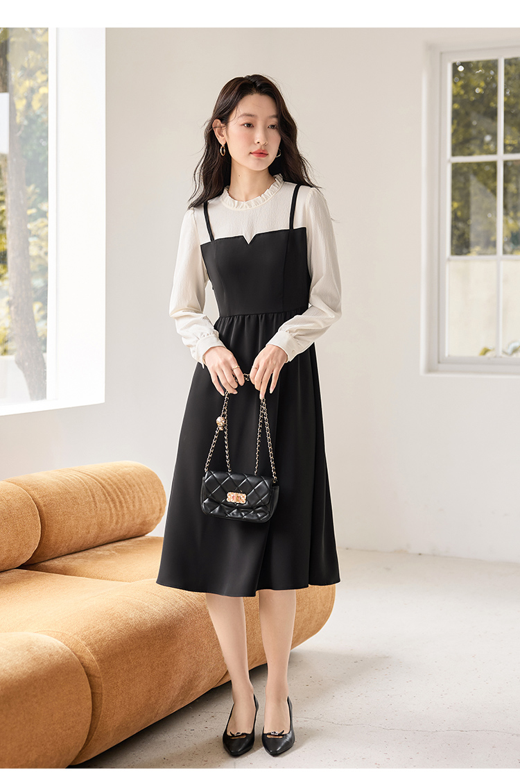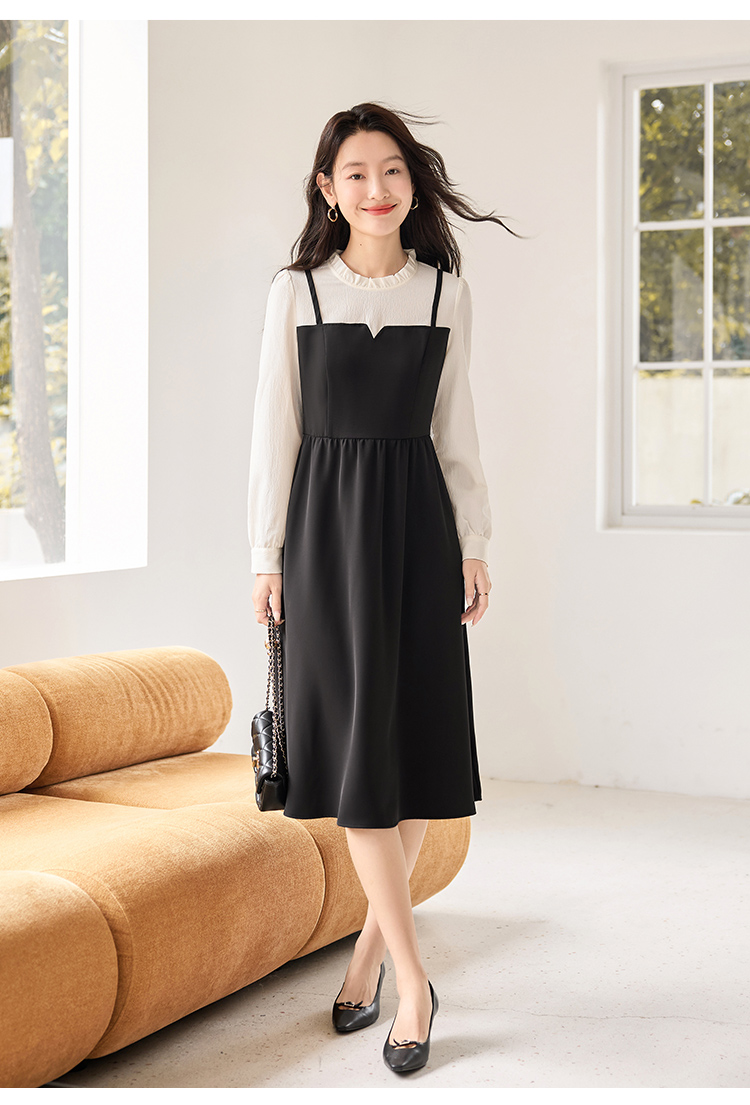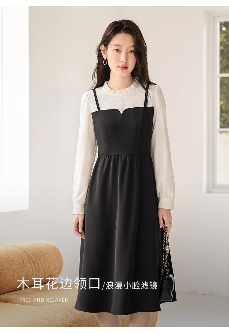 【年终特卖】熙世界拼接假两件连衣裙2025年秋季新款优雅气质减龄显瘦小黑裙