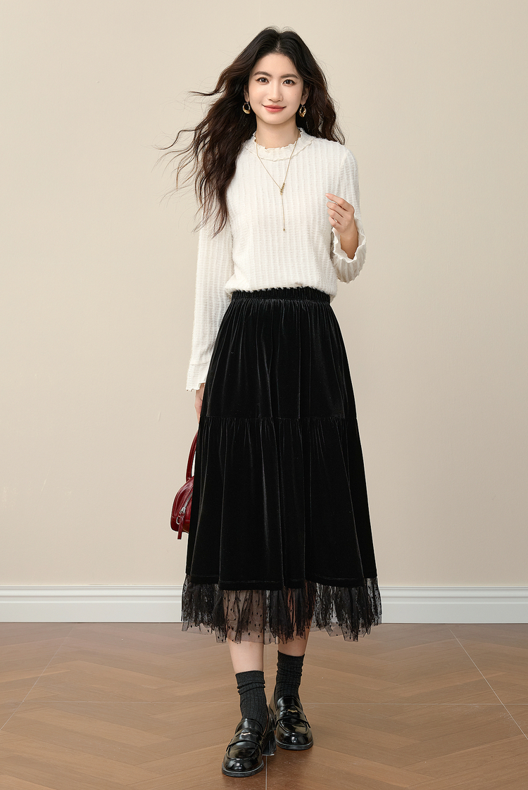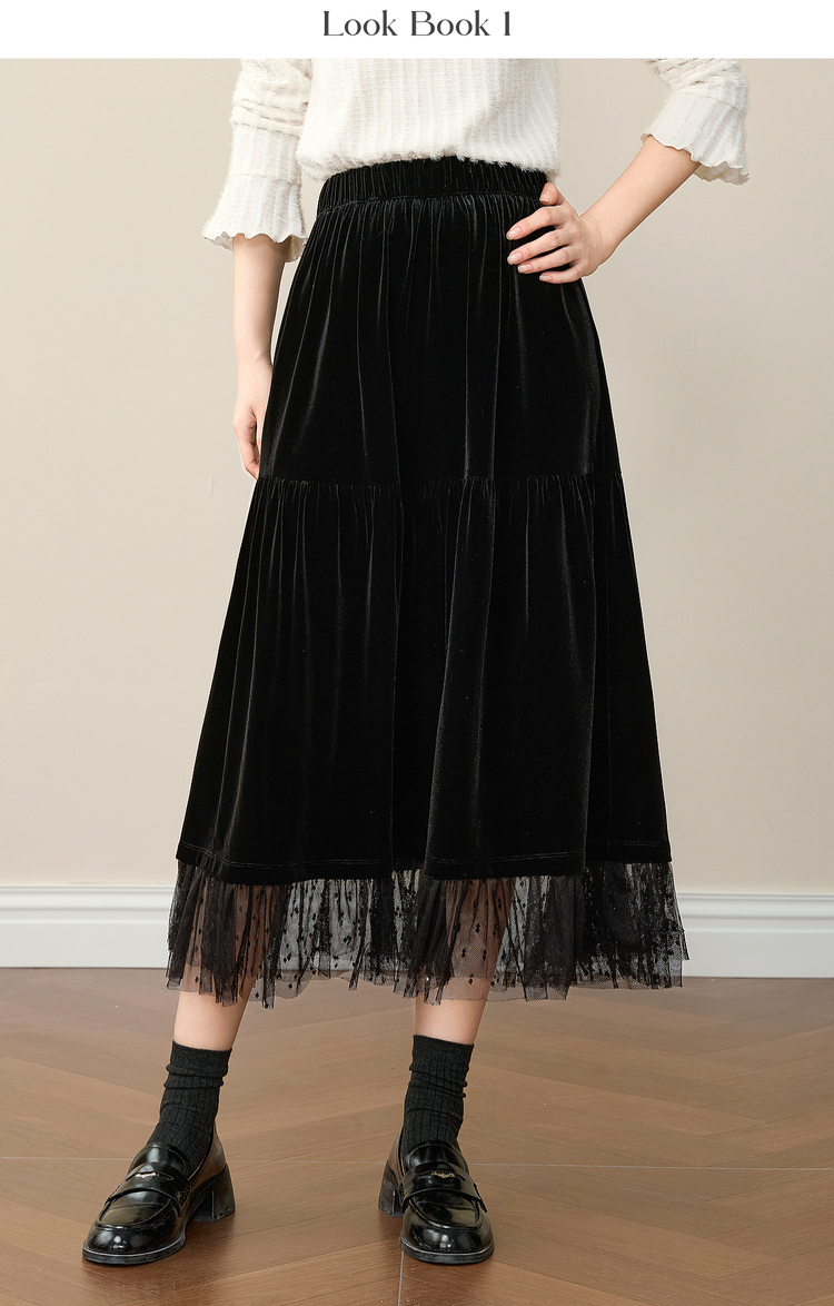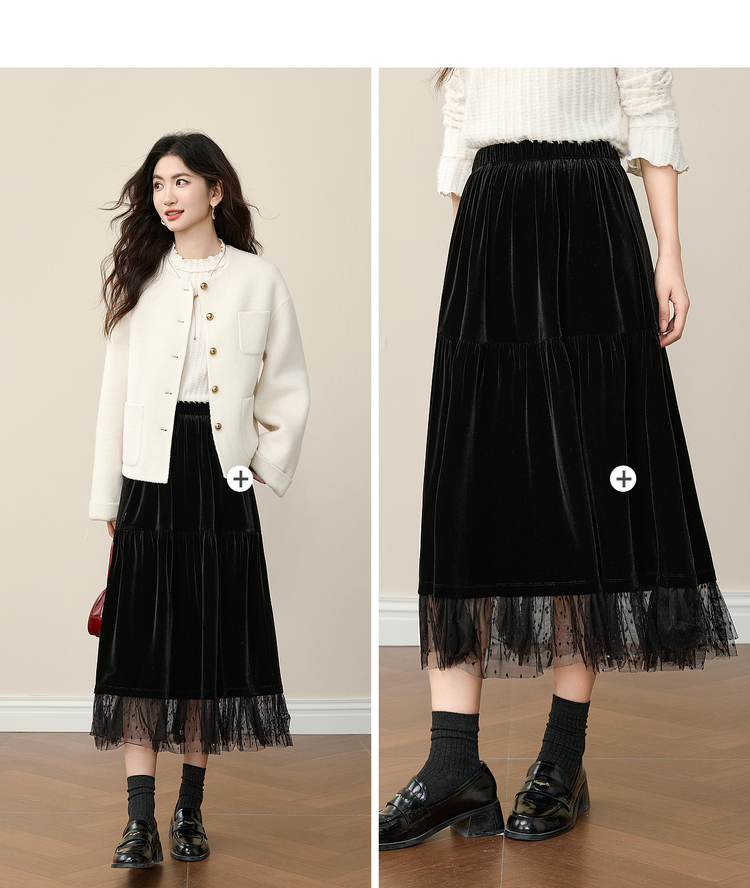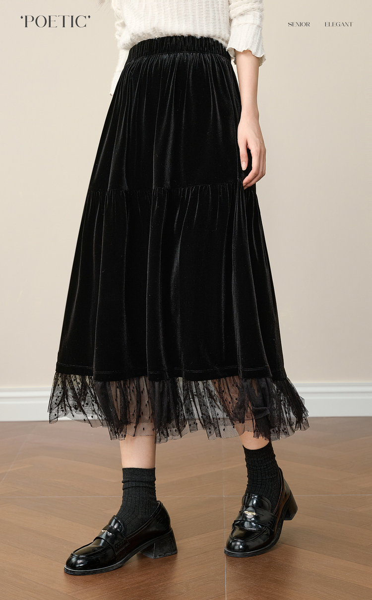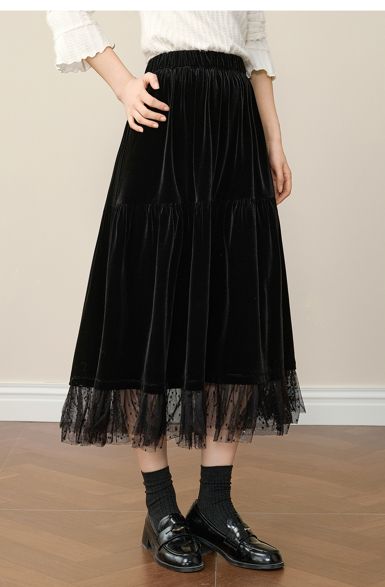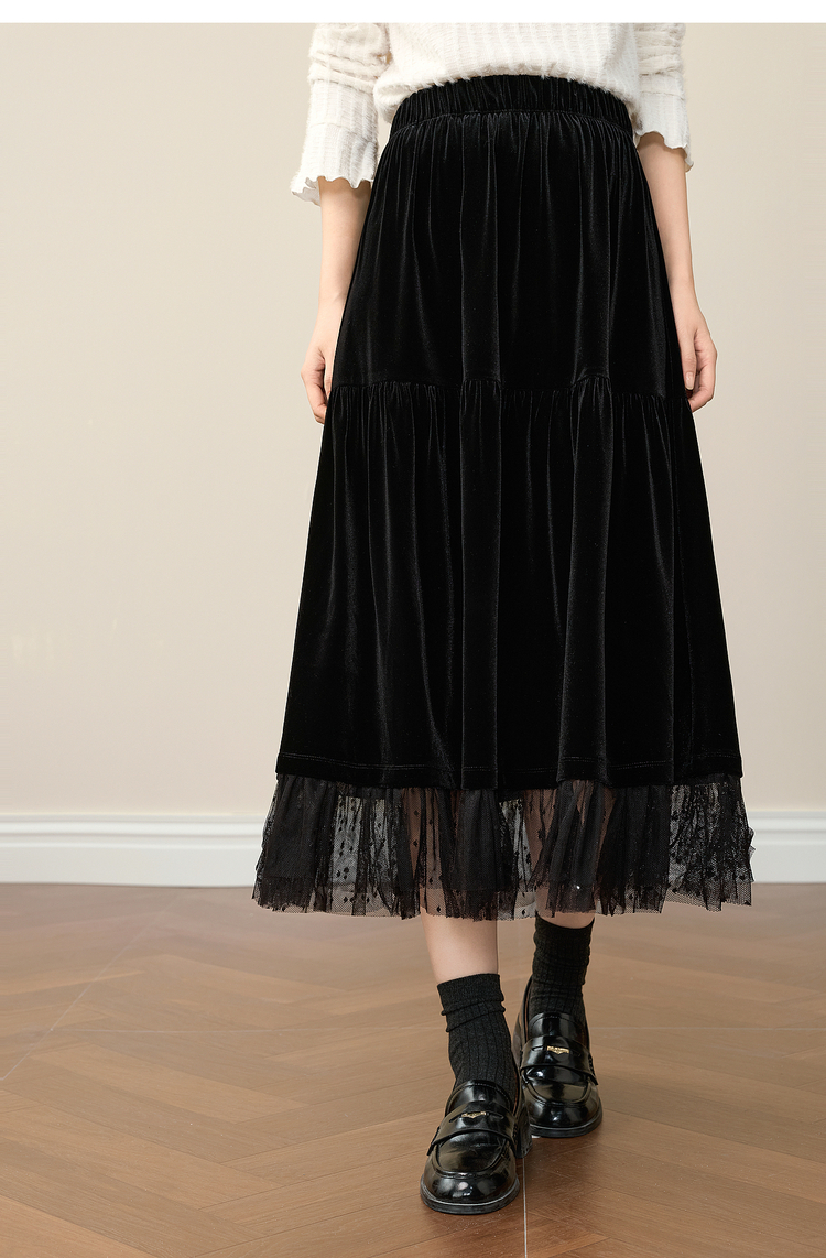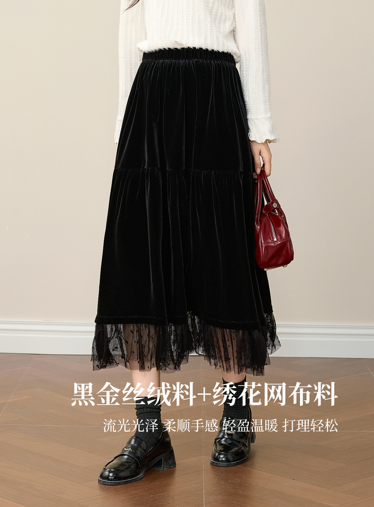【12/10新品6折】熙世界赫本风黑金丝绒半身裙女秋冬高腰优雅气质网纱拼接a字长裙