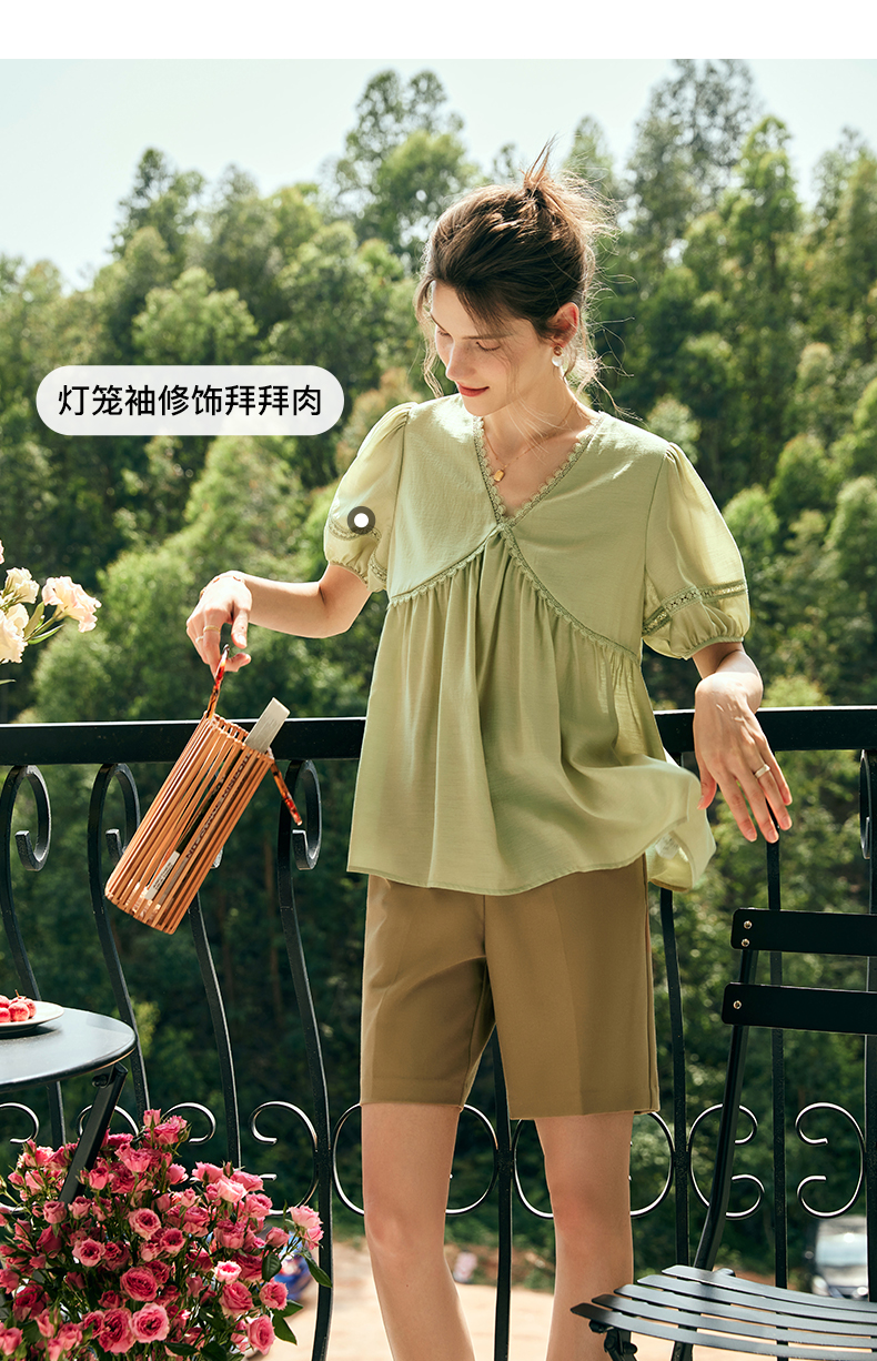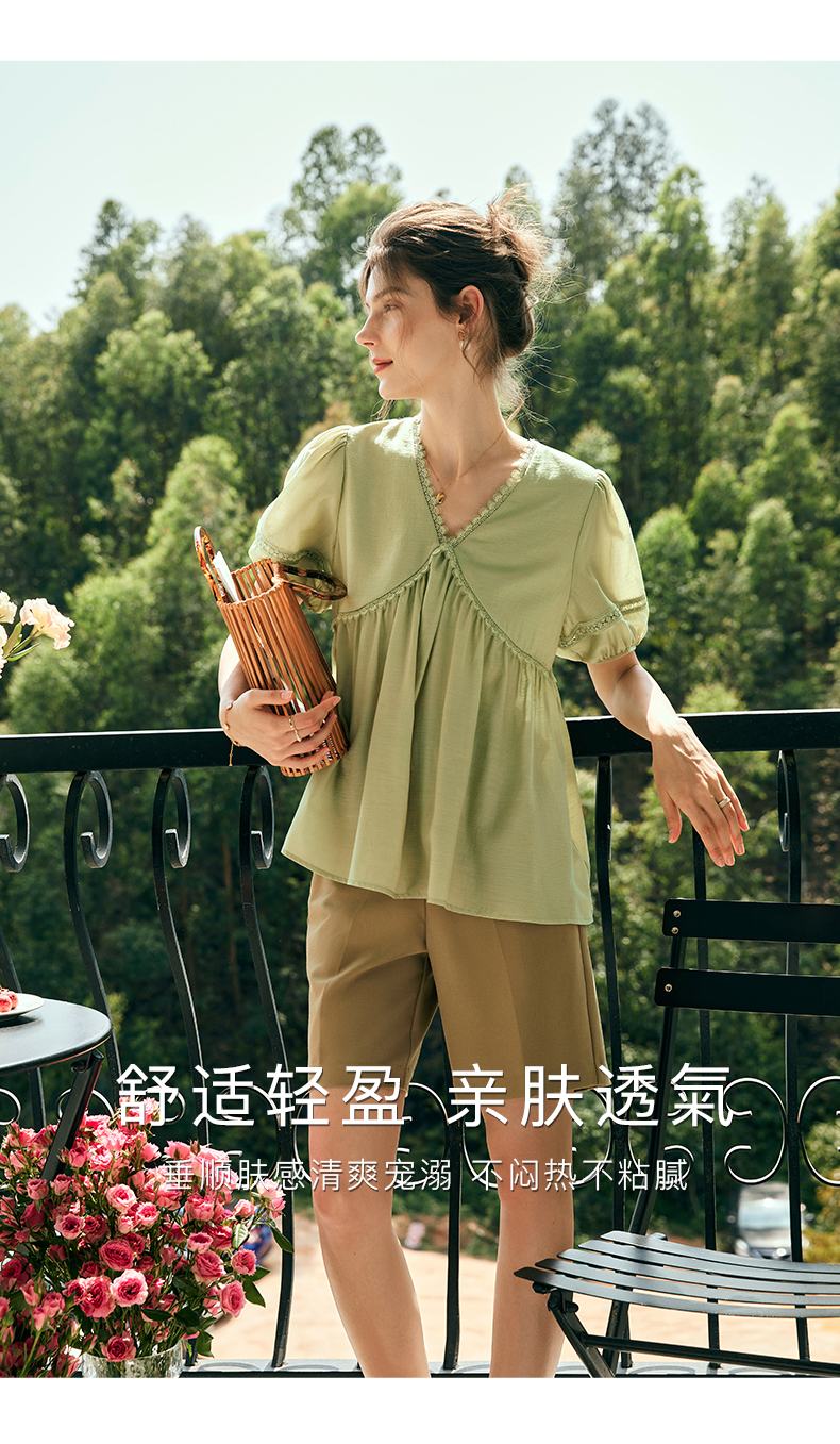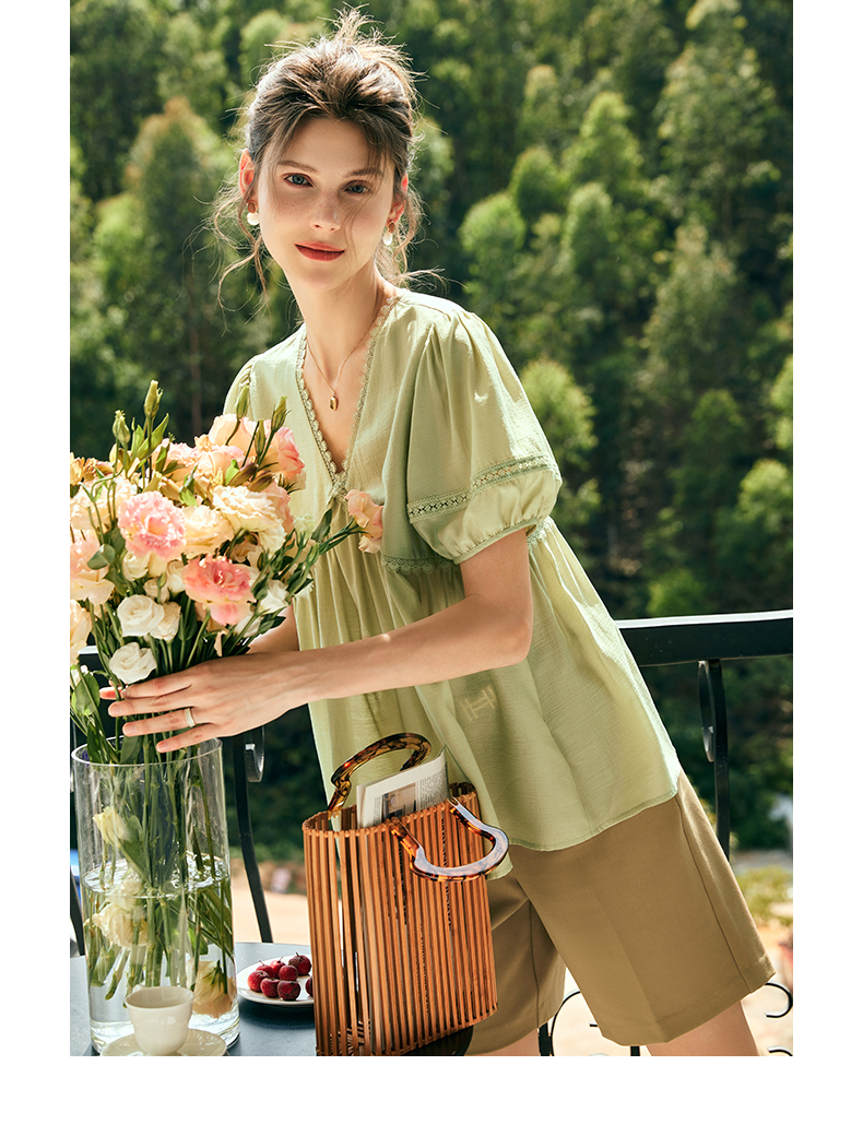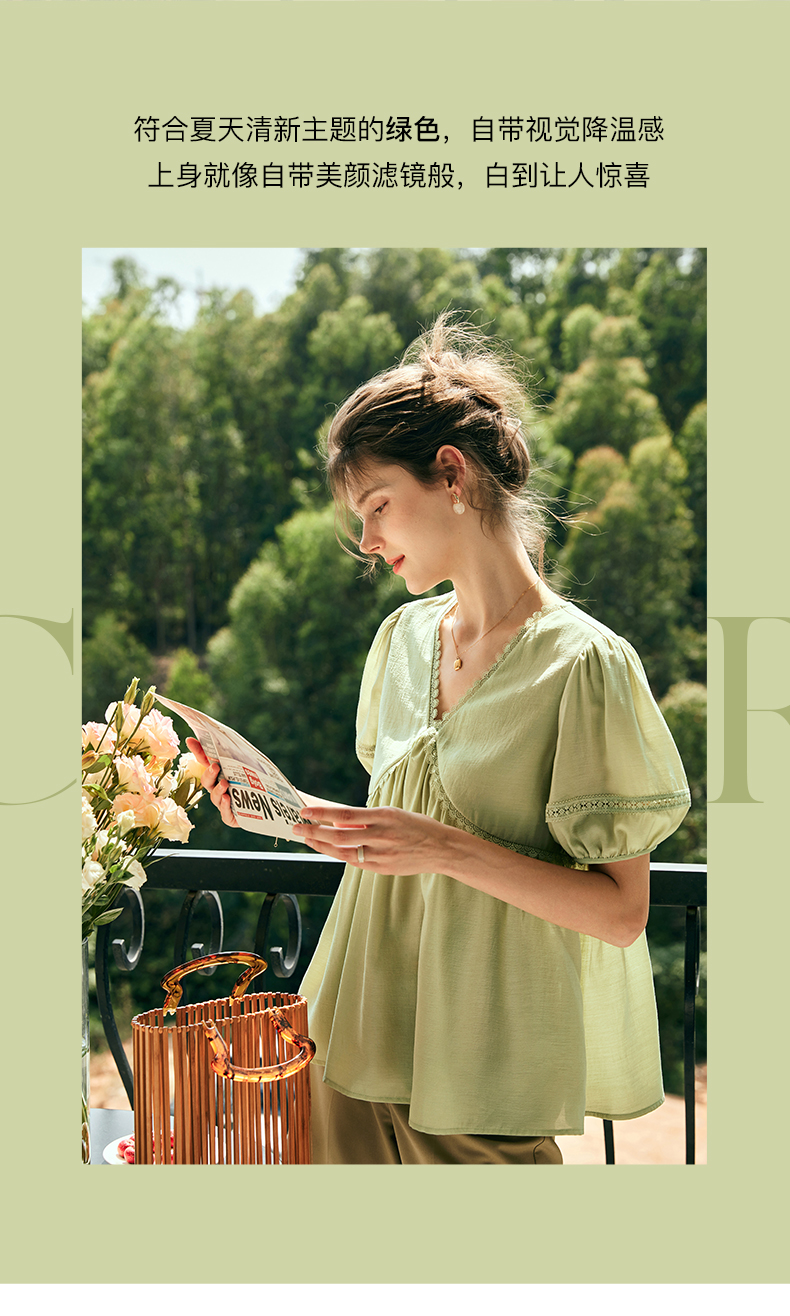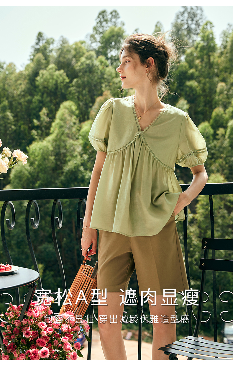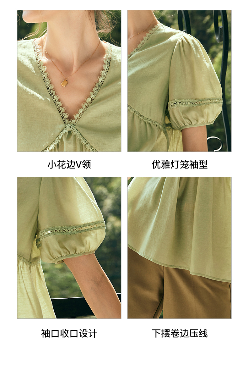 OLrain欧芮儿法式绿色V领雪纺蕾丝衫女夏季2023新款宽松别致小衫