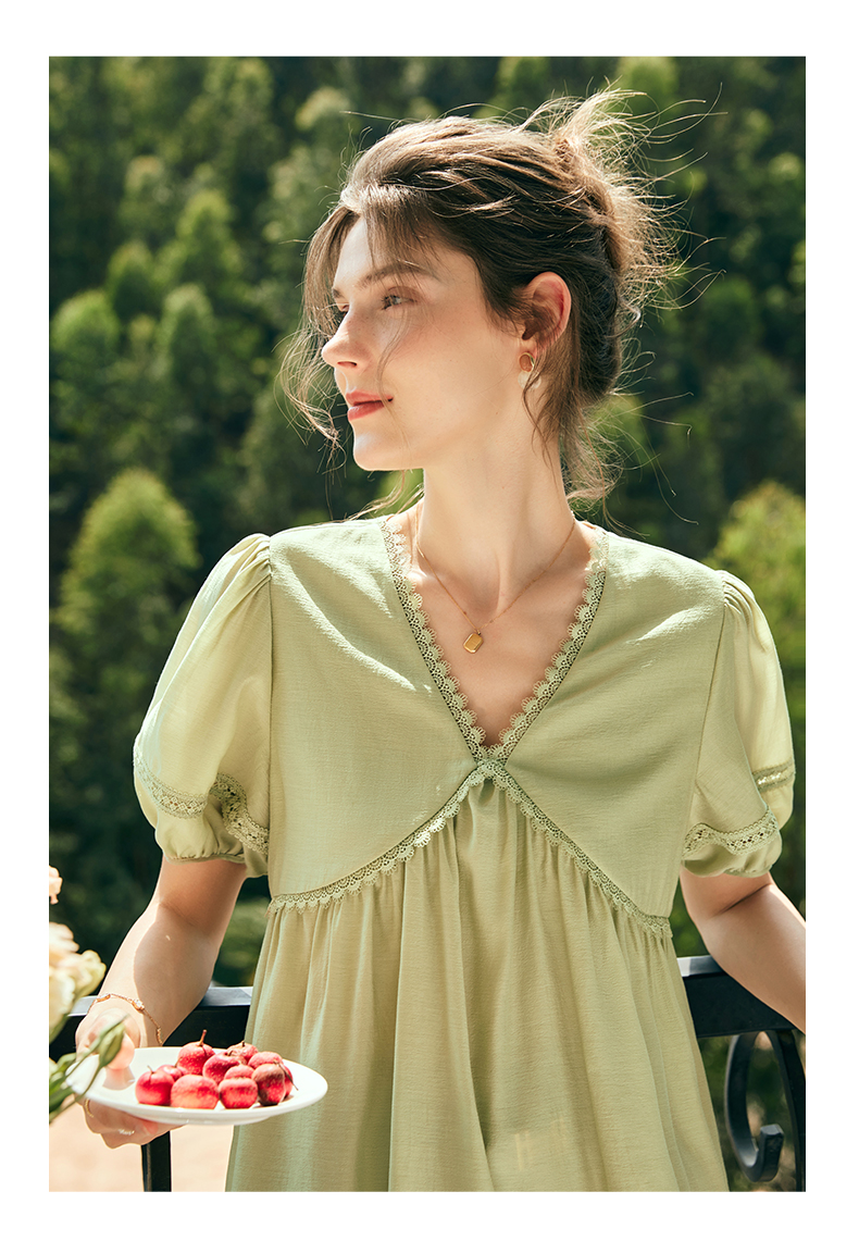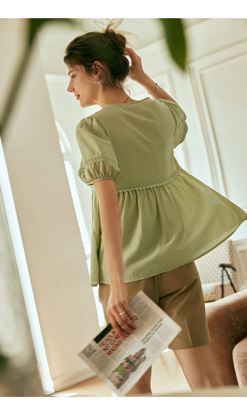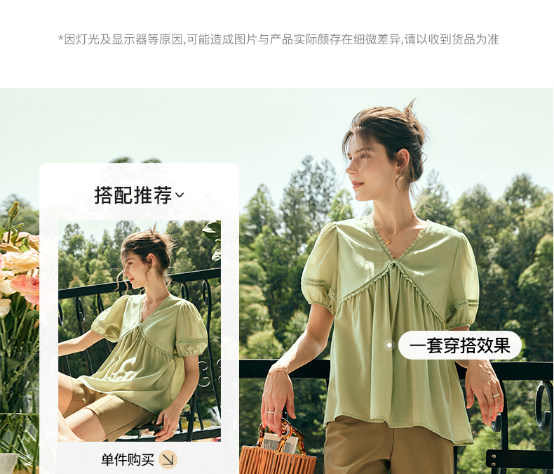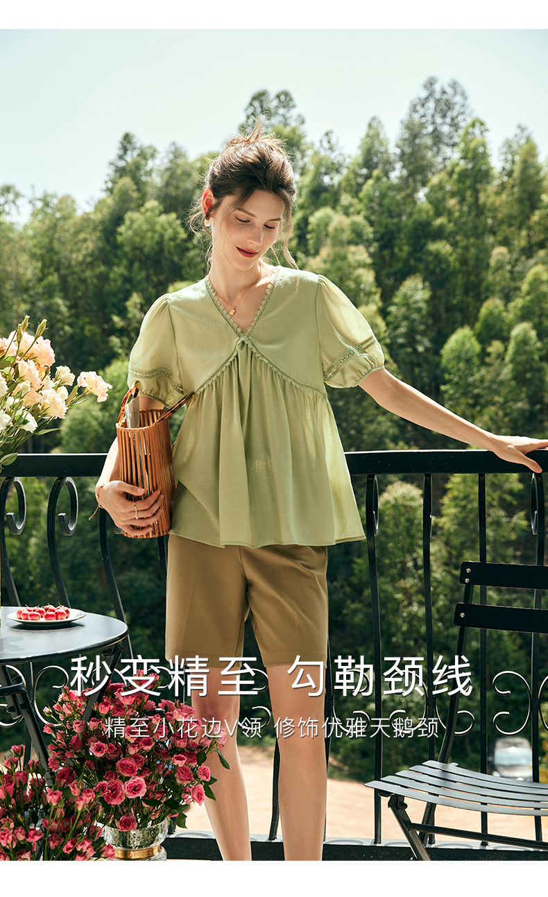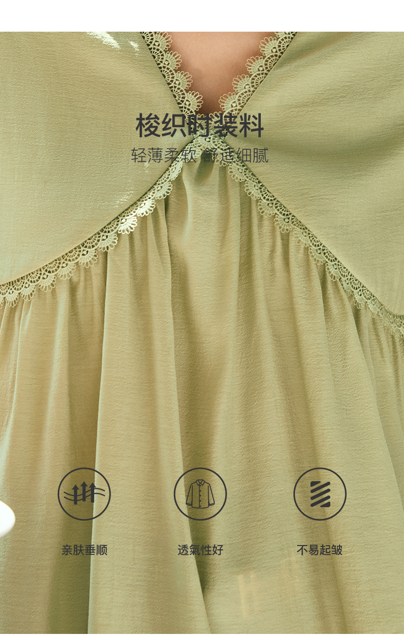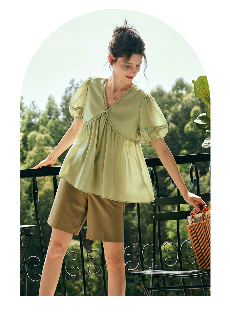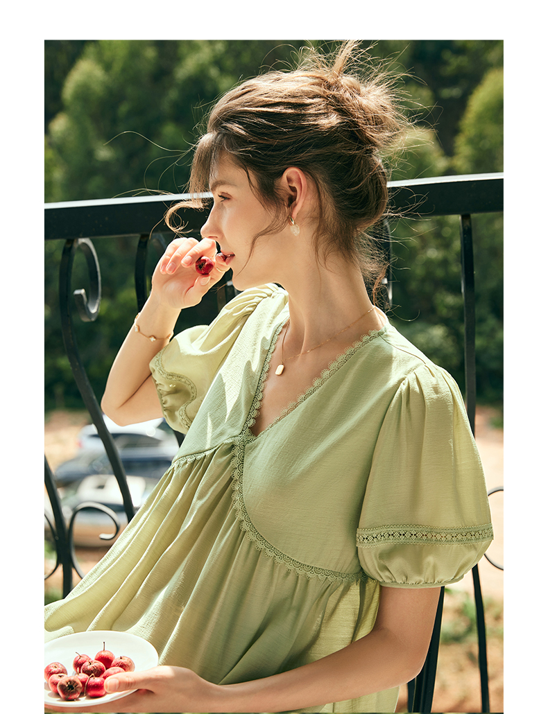OLrain欧芮儿法式绿色V领雪纺蕾丝衫女夏季2023新款宽松别致小衫
