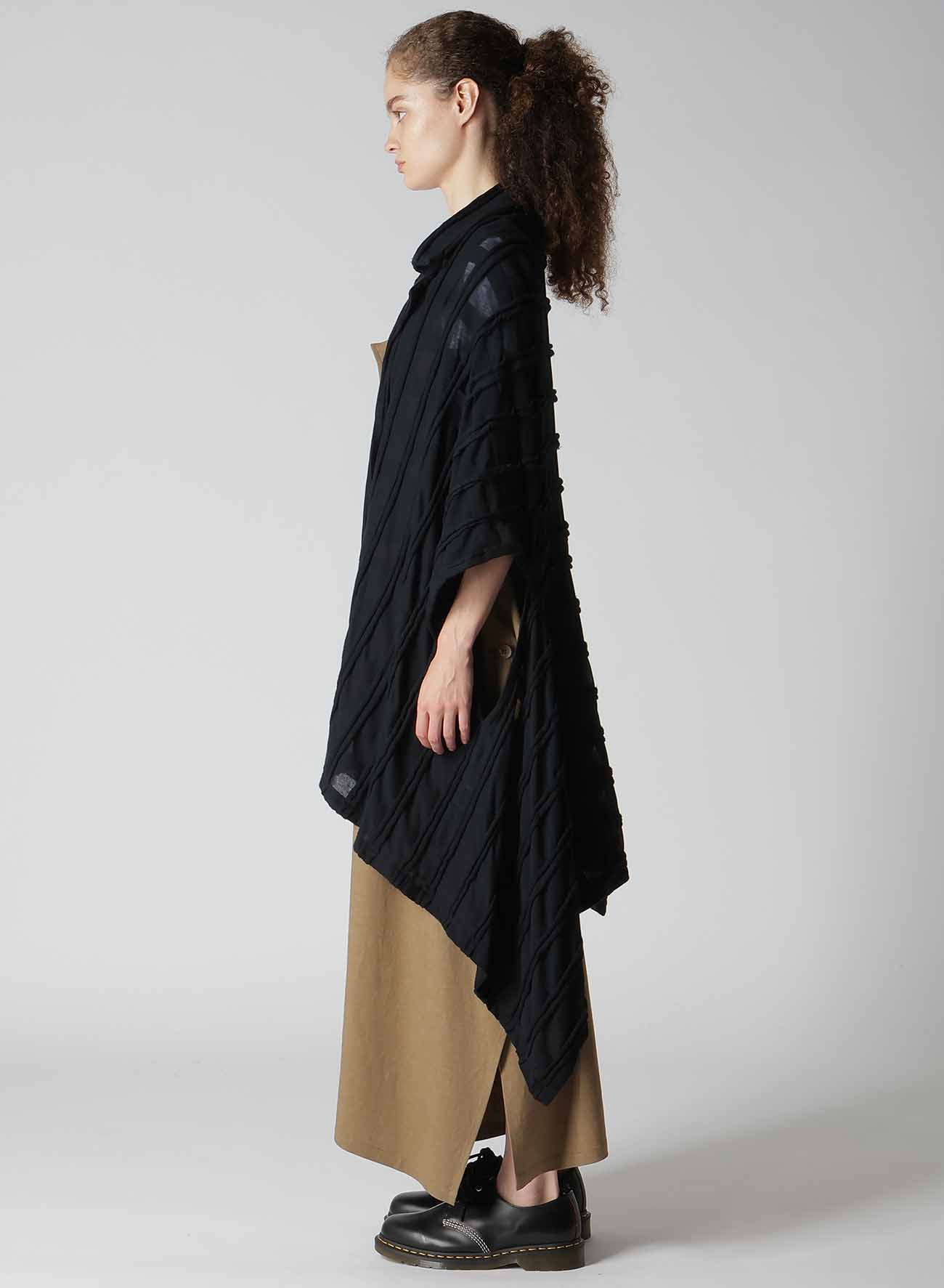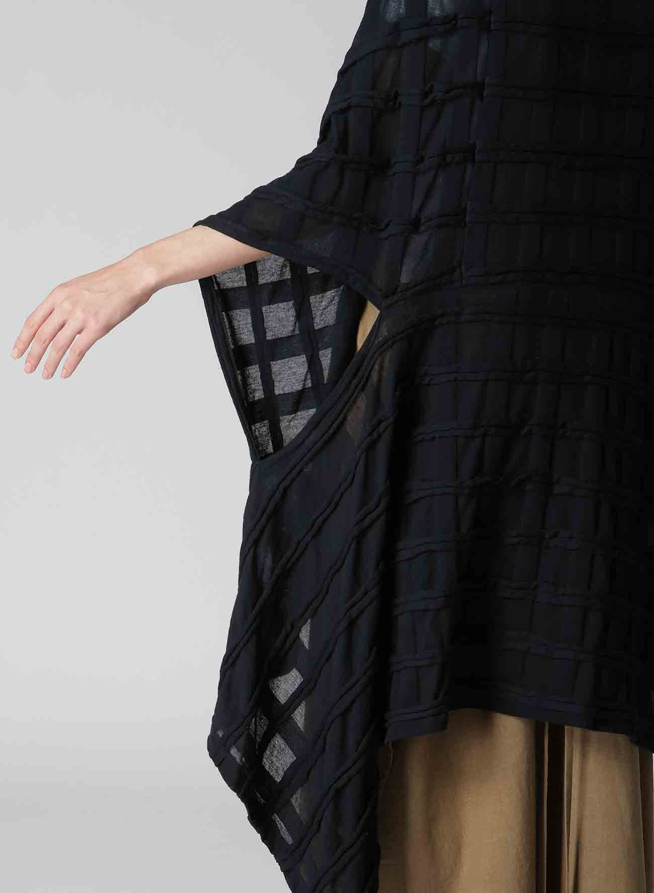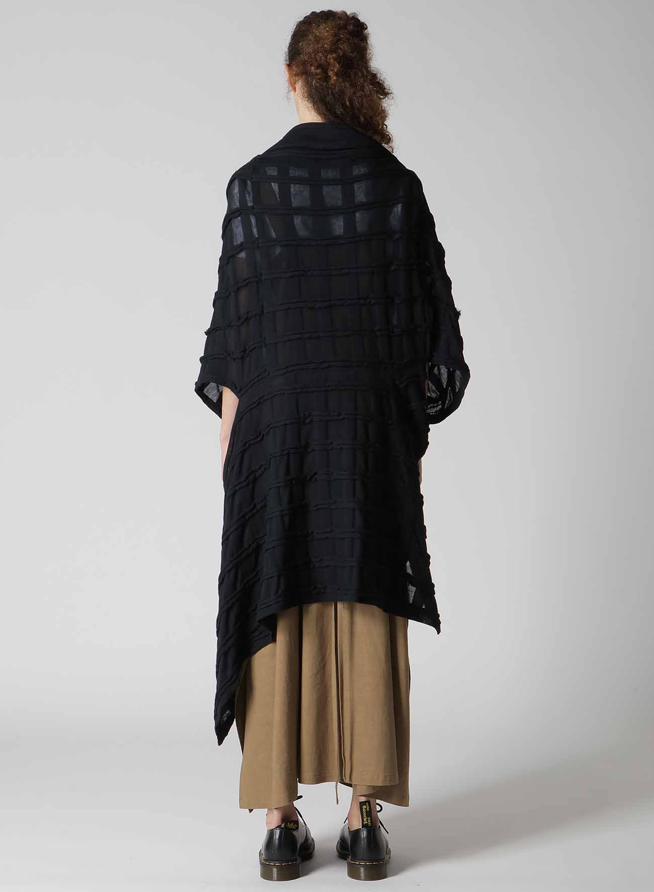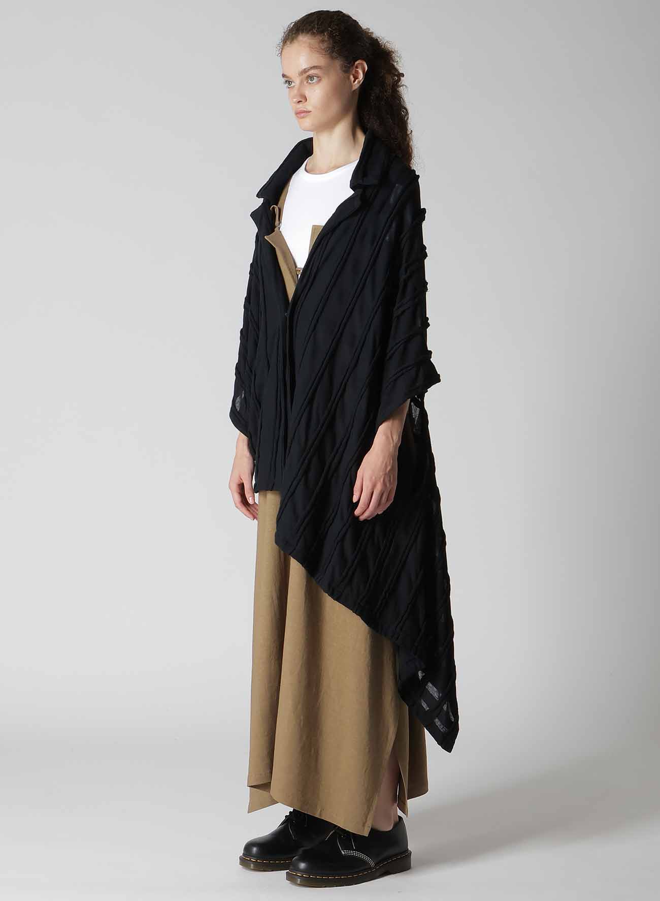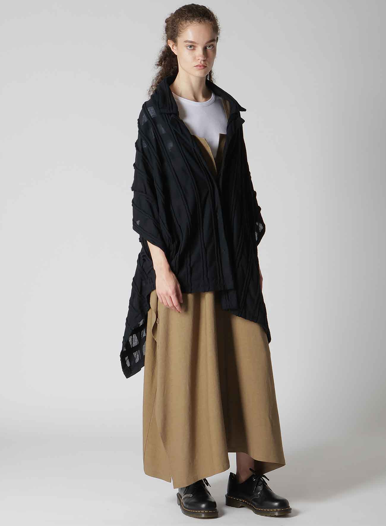 表面采用条纹状剪裁表现出立体的格子图案的独创面料。四角形图案构成的变形轮廓,前后的褶皱是其亮点。