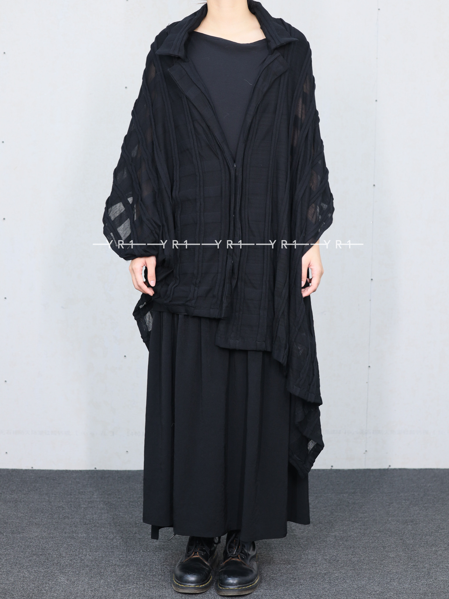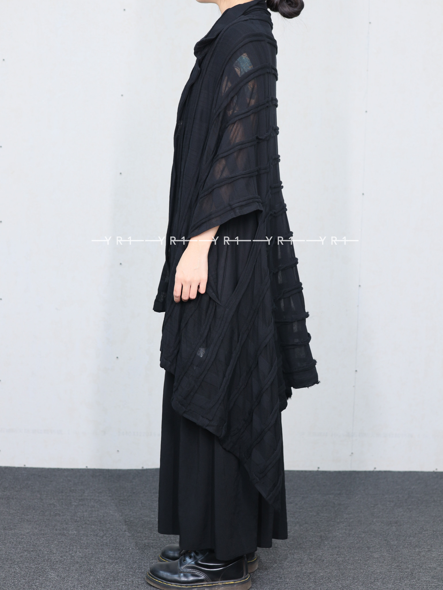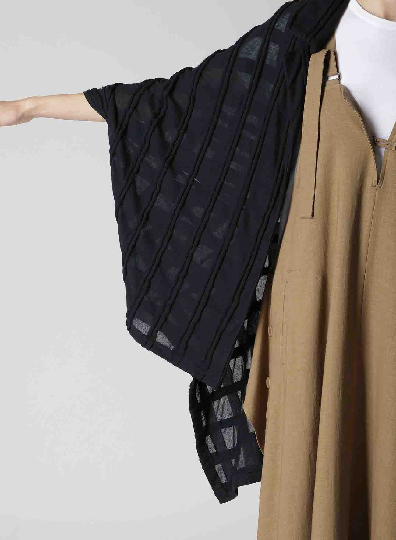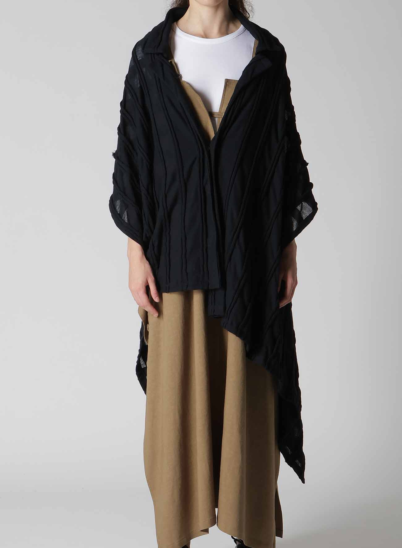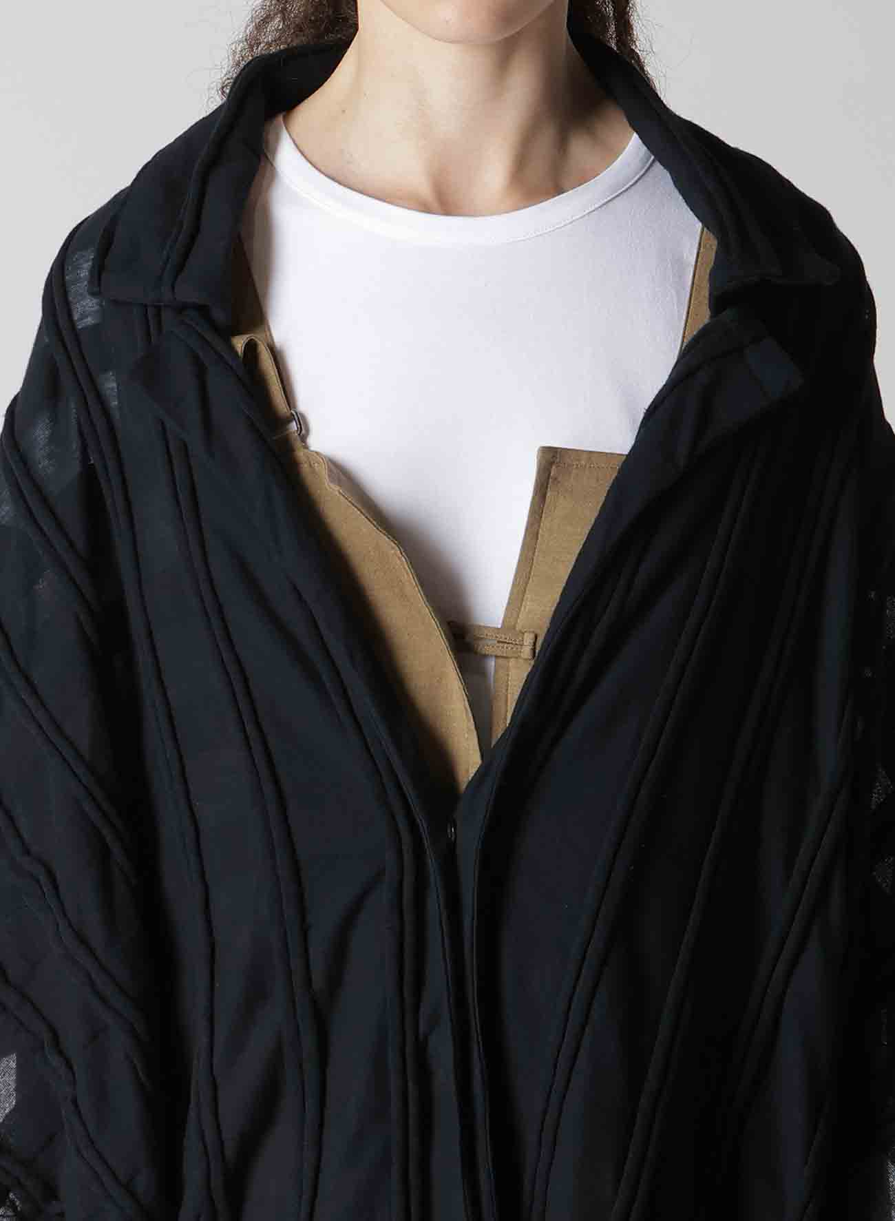 表面采用条纹状剪裁表现出立体的格子图案的独创面料。四角形图案构成的变形轮廓,前后的褶皱是其亮点。