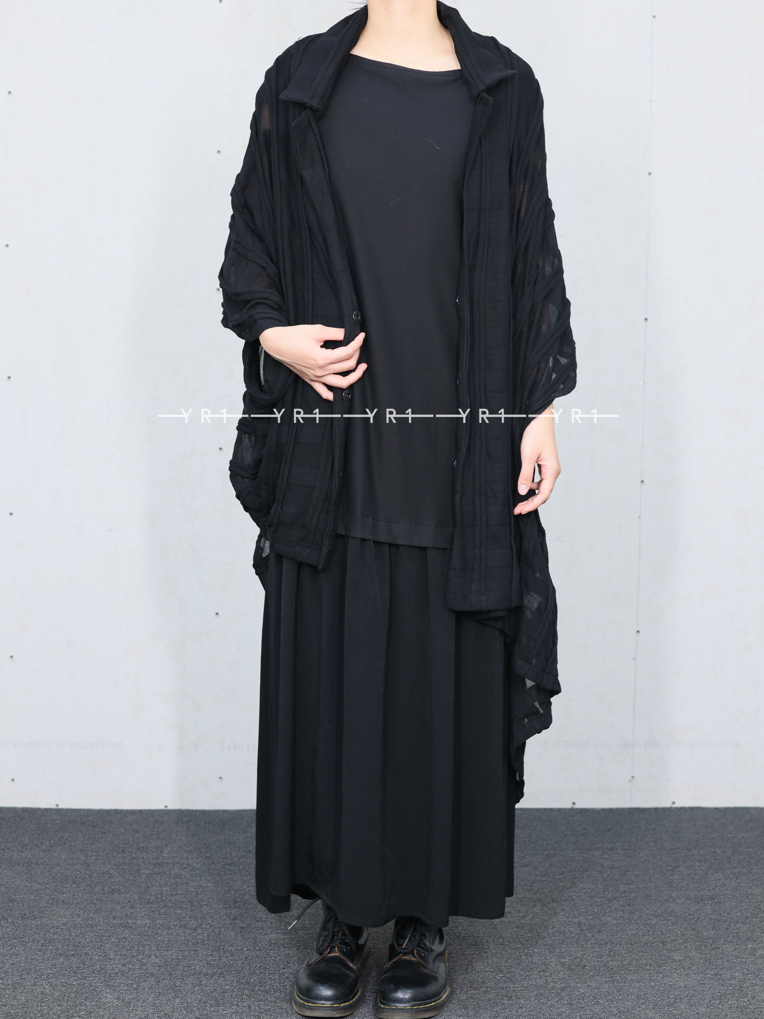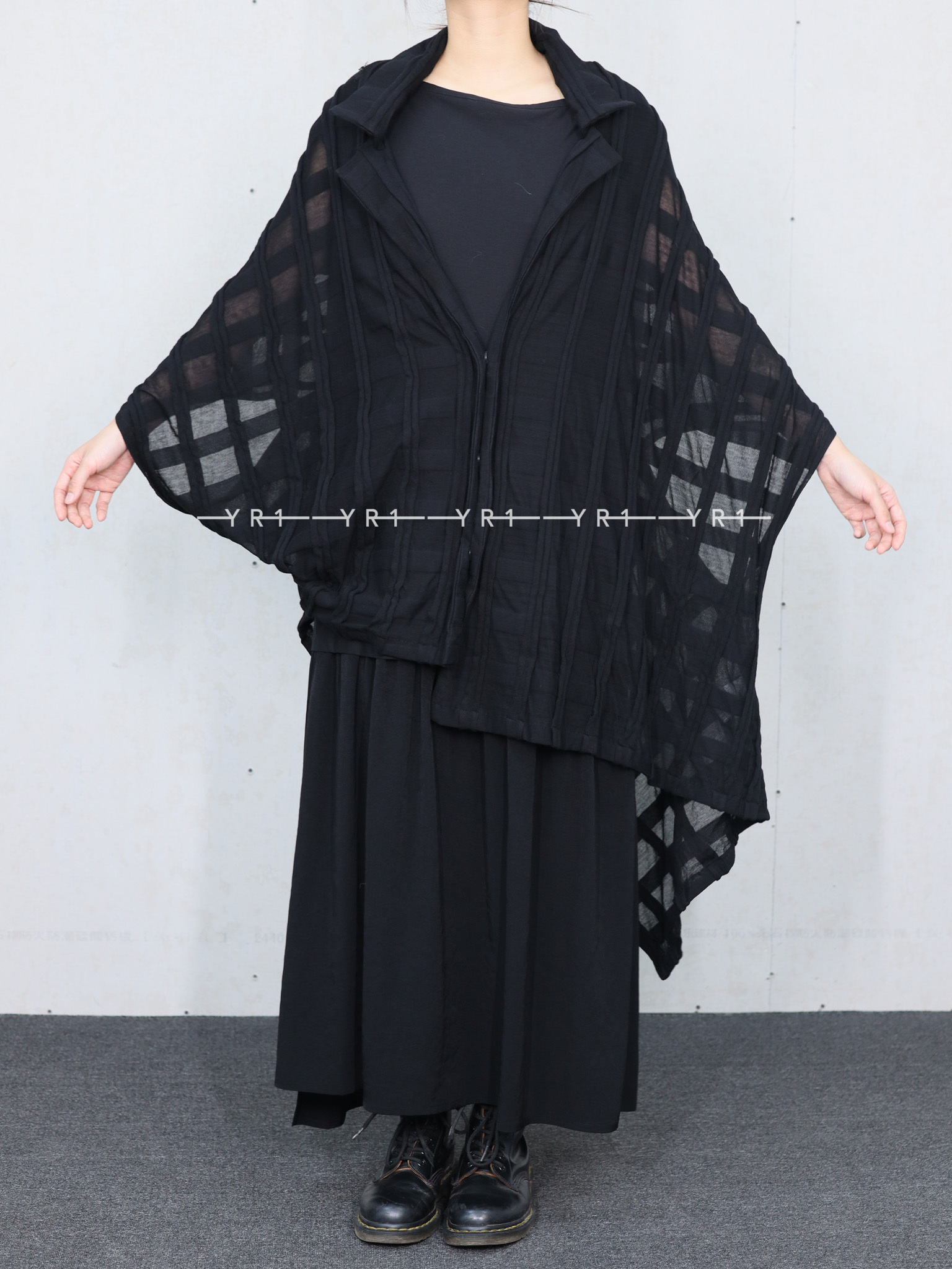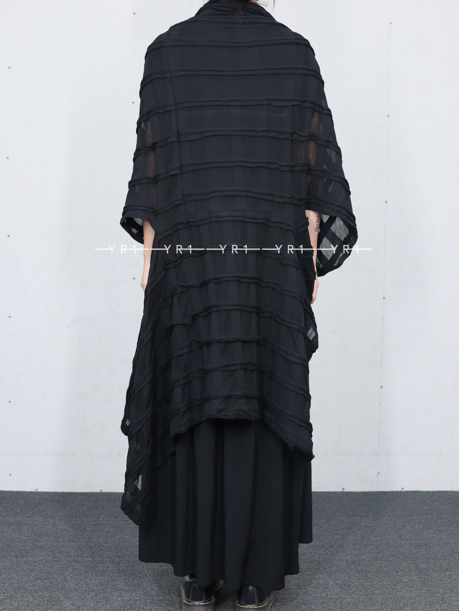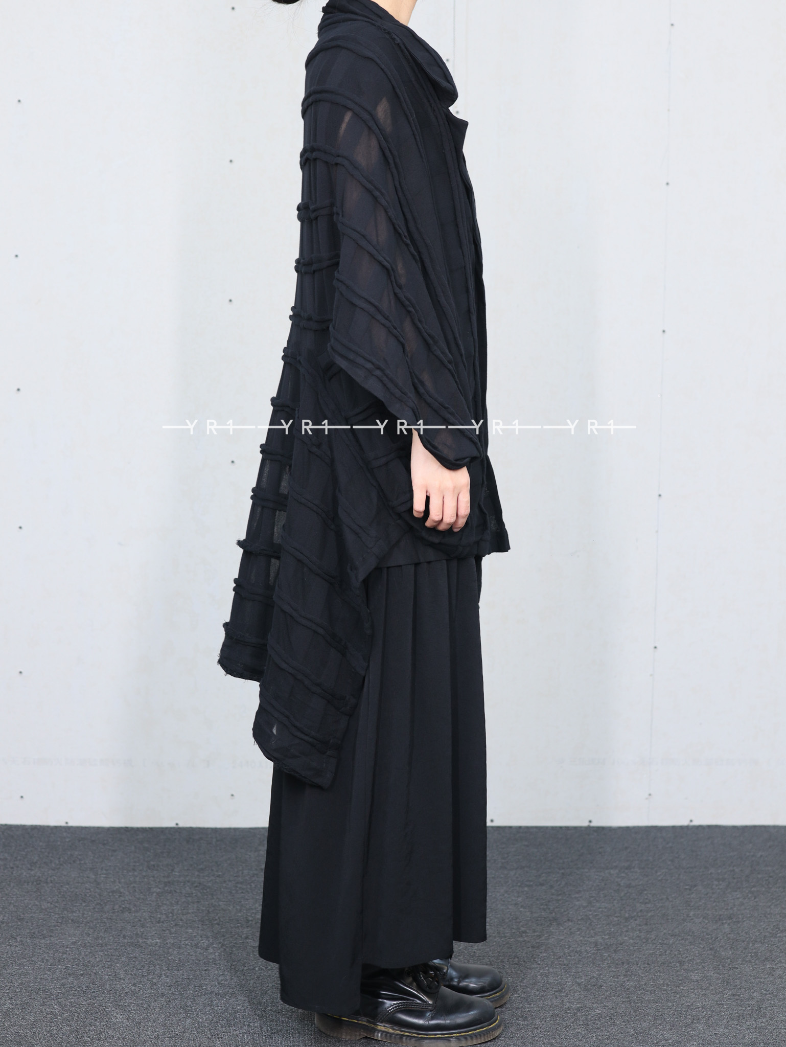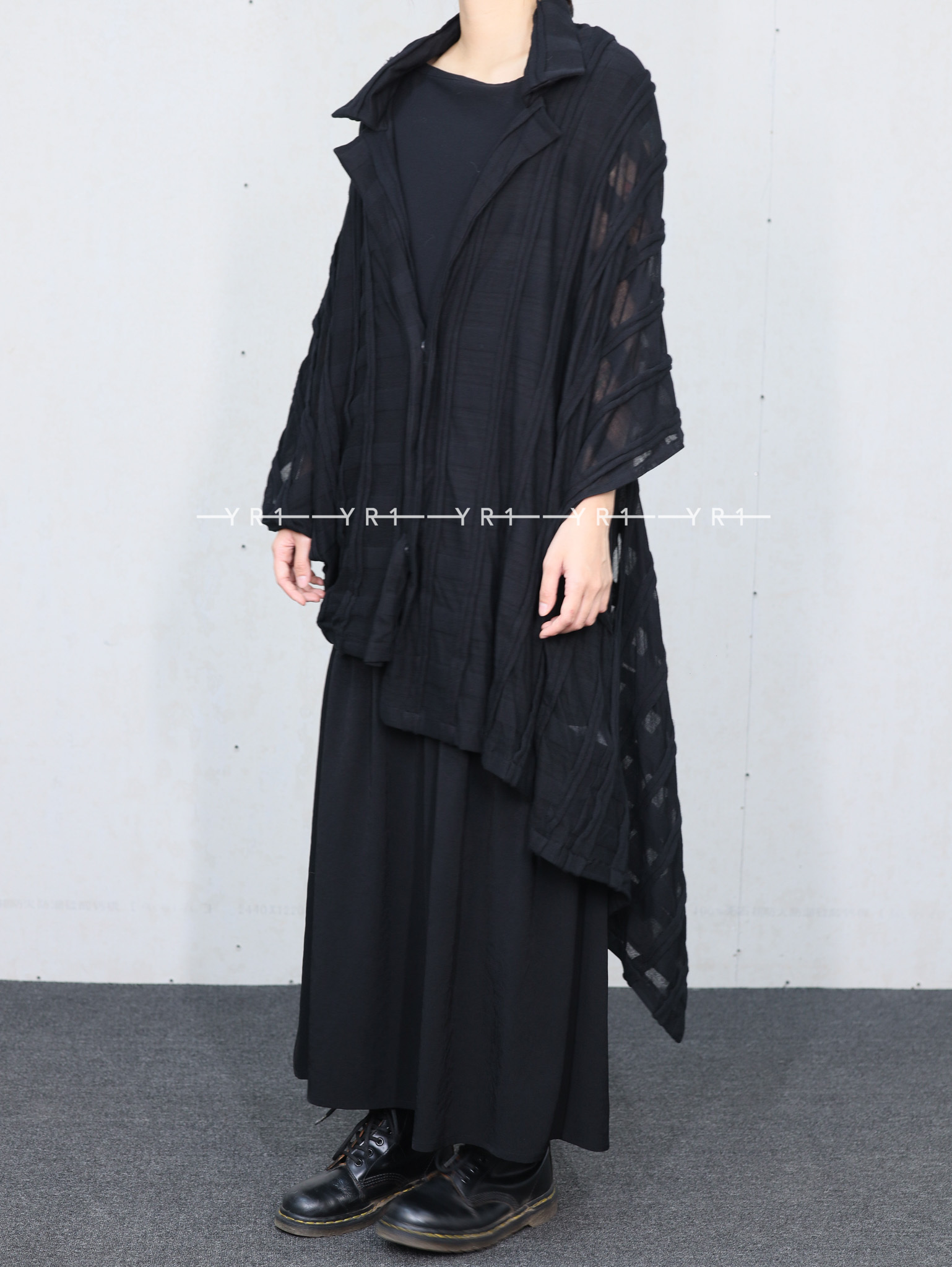 表面采用条纹状剪裁表现出立体的格子图案的独创面料。四角形图案构成的变形轮廓,前后的褶皱是其亮点。