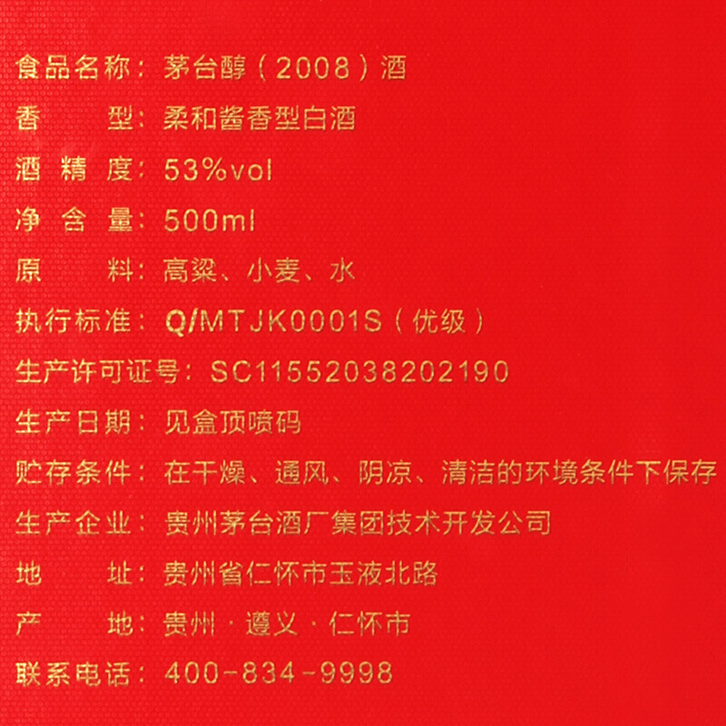 贵州茅台集团技开公司 茅台醇2008 53度酱香型白酒500ml
