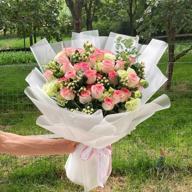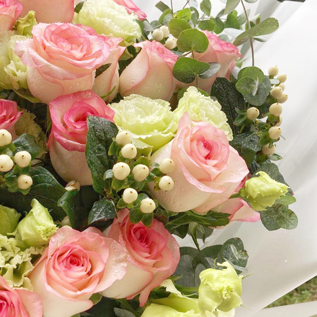 花材:精品爱莎玫瑰28支,绿色龙胆,白色火龙珠,尤加利叶等