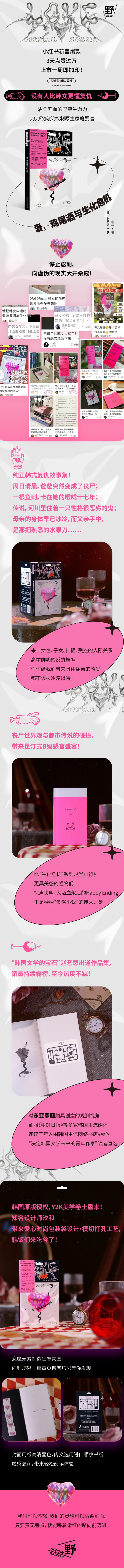 "搞复仇还得看韩国作家!别人爸爸中年危机,我的爸爸生化危机,丧尸袭击东亚“幸福家园”! ——纯正的韩式复仇故事,就算调低“西八”和“shake it”的音量,也不会让人失望。 一根卡在喉咙十七年的鱼刺、一缸巨蛇酿成的鸡尾酒、一处即将竣工的绿湖度假村、一把栖息着神秘恶魔的水果刀,引出四篇复仇物语:伪装成日常的暴力,以爱之名的操纵。 与能够选择性格相符的朋友并交往的学校,以及以工作为主的公司不同,家庭就是要把随机分配的关系坚持到底,长此以往,必然会在某一瞬间感到疲惫。来自女性、子女、拮据、受挫的家庭人际关系……种种阴暗潮湿的心情都被精细刻画。本书的四个故事都在高举一面鲜明的旗帜:那些感情有明确的实质,给我们带来具体实际的痛苦,它们不该被冷漠以待。 无限接近日常的末日感,漆黑的枪弹与利刃构成的梦境,惊声尖叫、大洒血浆后的Happy Ending,正是“低俗小说”的迷人之处。 ——B级元素致敬昆汀,丧尸世界观与都市传说的异想碰撞,带来超越常识的感官盛宴! 执掌时间回溯的谜之恶魔,古神病毒创造的新型丧尸,纯情的林中游魂、水中猛鬼,伴随恶女诞生复苏的“富江”,比“生化危机”系列、《釜山行》《僵尸100》的怪物们更具美感。 作者把心中所想和怪谈杂说混合起来进行创作,枪和刀、鲜血和尖叫声中透过那股热气……越是反复咀嚼残酷的场面,越能感受到奇妙的亲切。 “丧尸并不是《爱,鸡尾酒与生化危机》的中心,我希望可以透过超越常识的丧尸,激起读者对日常生活的感念。” 90后代表作家、“韩国文学的宝石”赵艺恩,出道作品集,销量持续霸榜、出版至今热度不减! ——连续三年入围韩国主流网络书店yes24“决定韩国文学未来的青年作家”读者直选! 对各种B级电影恐怖元素的信手拈来,对【东亚家庭】颇具首创性的观测视角,攻读金属工艺学期间与各种尖刀利器为伍的经历,是赵艺恩作家的创作核心,也成为征服《朝鲜日报》等多家韩国主流媒体、众多读者的决胜武器。 越热的天气,这样的故事就越受欢迎。——《朝鲜日报》 此仅凭这部小说出色的紧张感和新鲜感,就有充分的理由一睹为快。——Art Insight 韩国原版授权!知名设计师汐和、带来Goods陈列透明包装创意,模切打孔工艺,韩饭们来吃谷了! ——快来摘下一袋袋精心分装的爱,丧尸和鸡尾酒,分食甜美的杀戮、甘美的复仇! Y2K美学卷土重来!!!爱心时尚包装袋设计、静待拆启的玩具配件版、韩国原版封面授权的“爱与鸡尾酒”元素,内封、环衬、篇章页元素皆匠心独运,营造娱乐疯魔、怪诞狂想的阅读体验! 封面用纸高清显色,内文选用进口顺纹书纸,触感温润,带来轻松阅读体验。"