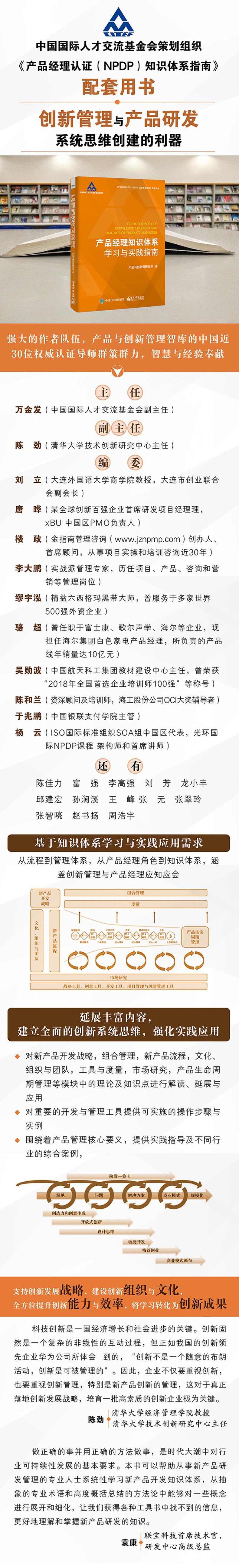 《产品经理知识体系学习与实践指南》一书为各位读者提供了新产品创新管理的较为完整 的知识体系,并配备了国内外的成功案例,这对于进一步学习新产品创新的管理体系,提升 新产品创新管理队伍的建设,培养更多的创新管理人才,将产生较高的价值。 陈劲 清华大学经济管理学院教授,清华大学技术创新研究中心主任 推荐序二 在这金秋送爽、硕果累累的时节,接到国际人才交流基金会的邀请为本书做序,深感荣 幸的同时亦觉得责任重大。消费电子行业诞生及发展至今的短短几十载峥嵘岁月,凝聚着国 内一代代产品研发人员的青春和激情。从最早的联想 1+1 家用电脑到现在百花齐放的智能电 子设备,从摸着石头过河搞产品到现在开始广泛传播 NPDP 理念,事物的发展总是有其内在 的规律的。正本溯源,做正确的事并用正确的方法做事,是时代大潮中对行业可持续性发展 的基本要求。成功的产品和成功企业告诉我们:新品研发道路千万条,思维意识转......