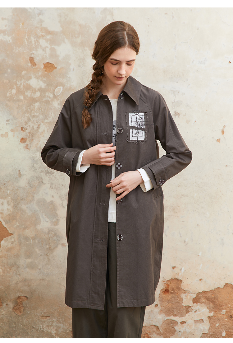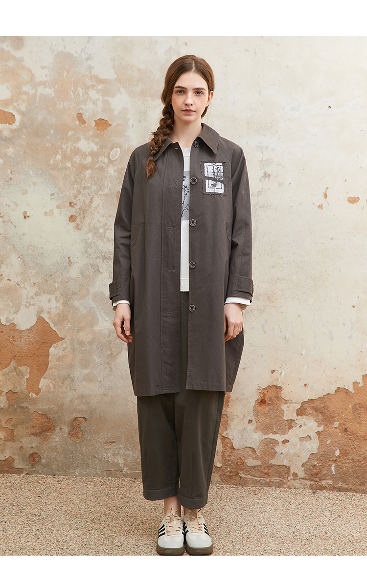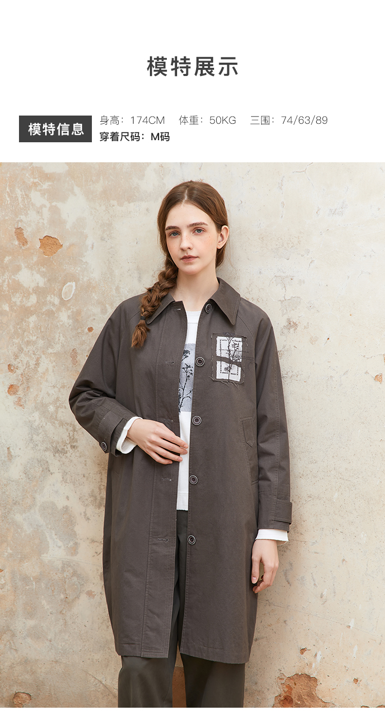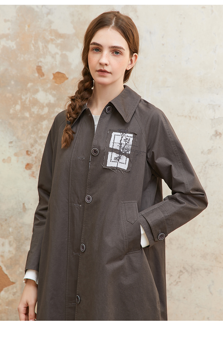 famecoco纯棉植物绣花贴布风衣中长款女宽松休闲外套FAC1AT008