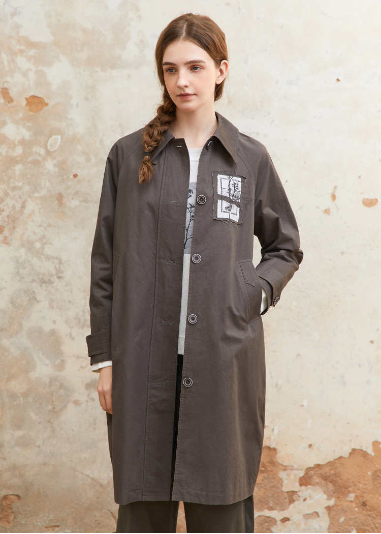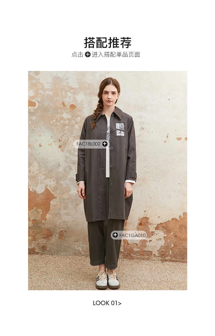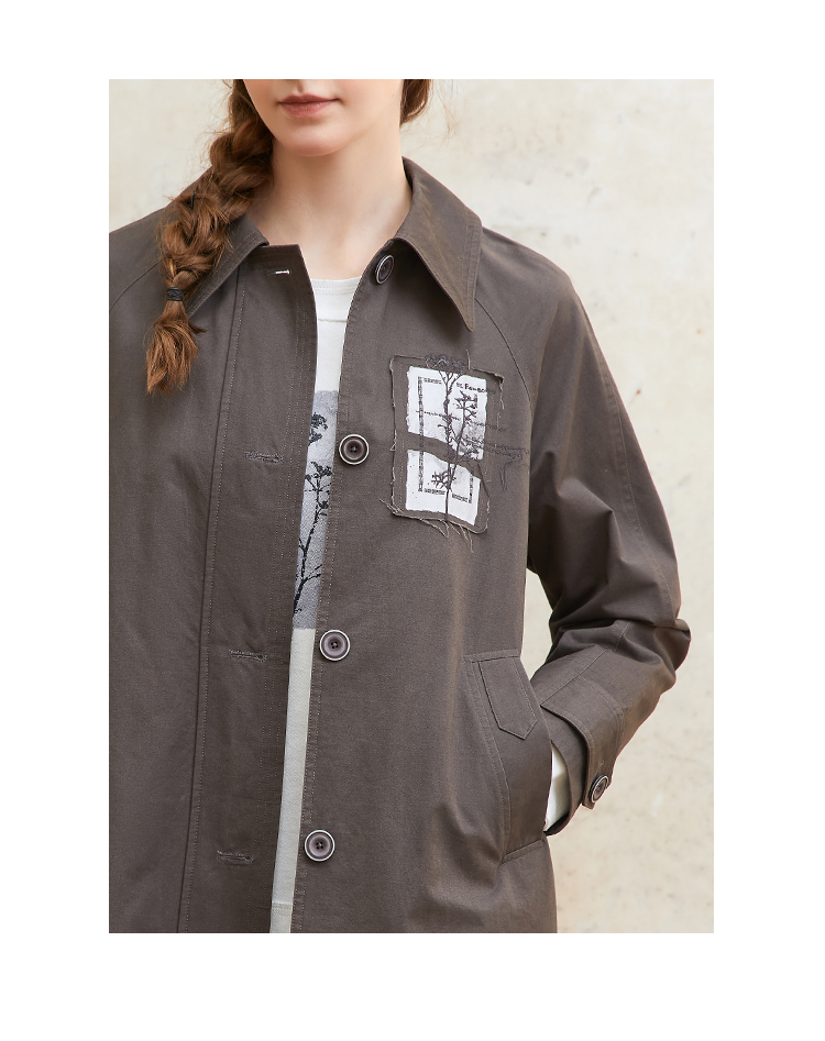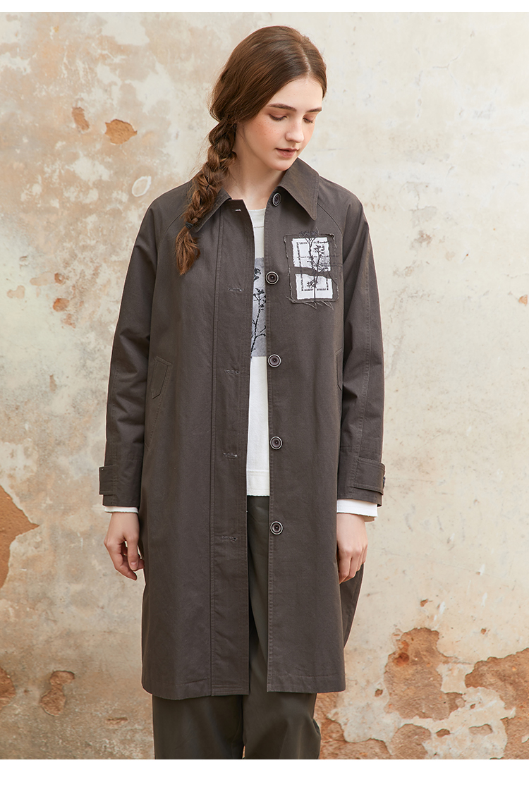 famecoco纯棉植物绣花贴布风衣中长款女宽松休闲外套FAC1AT008