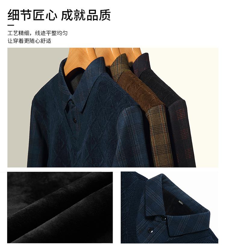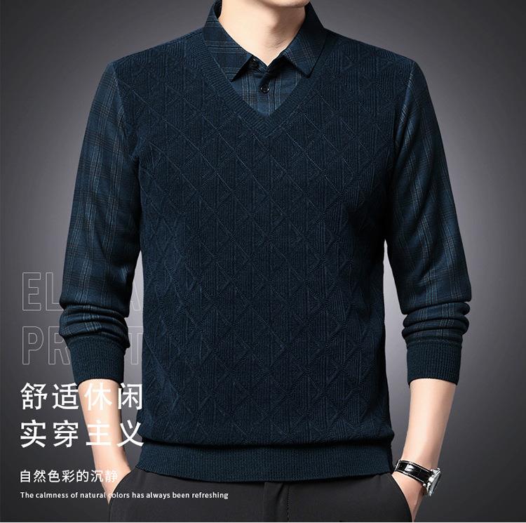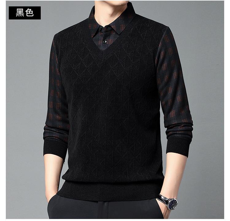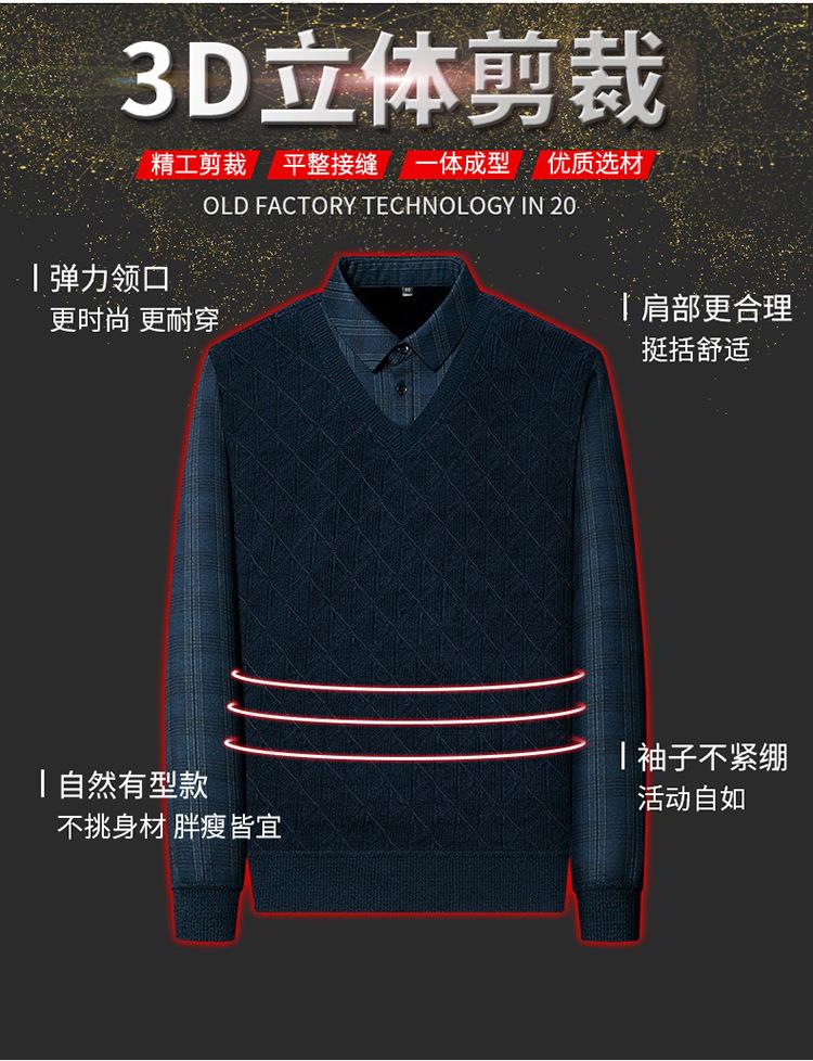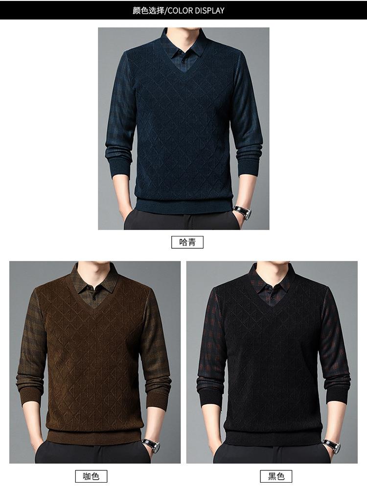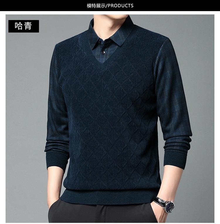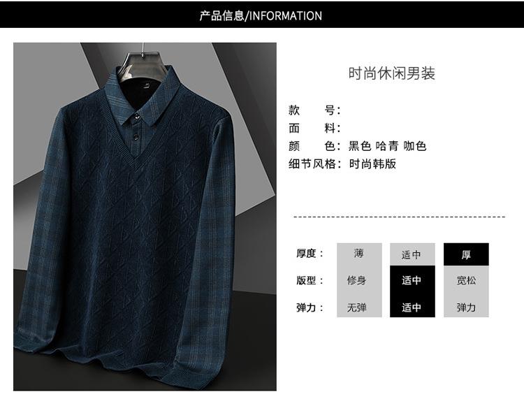 长袖加绒加厚假两件毛衣男士秋冬季新款衣提花打底衫