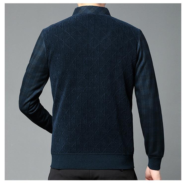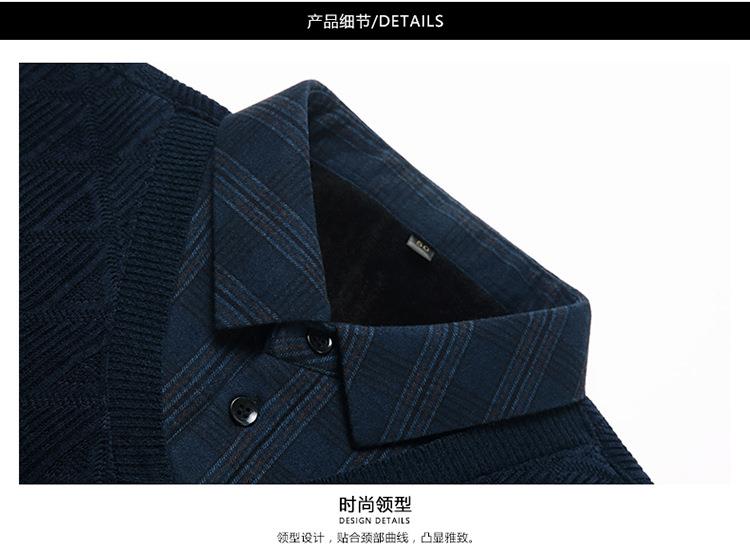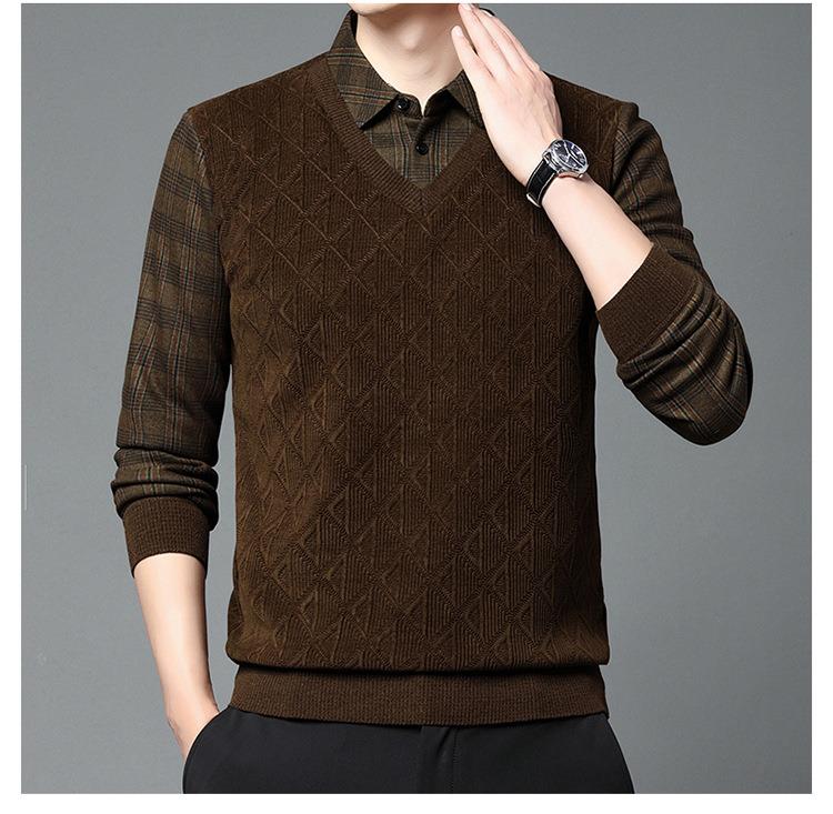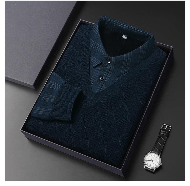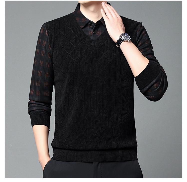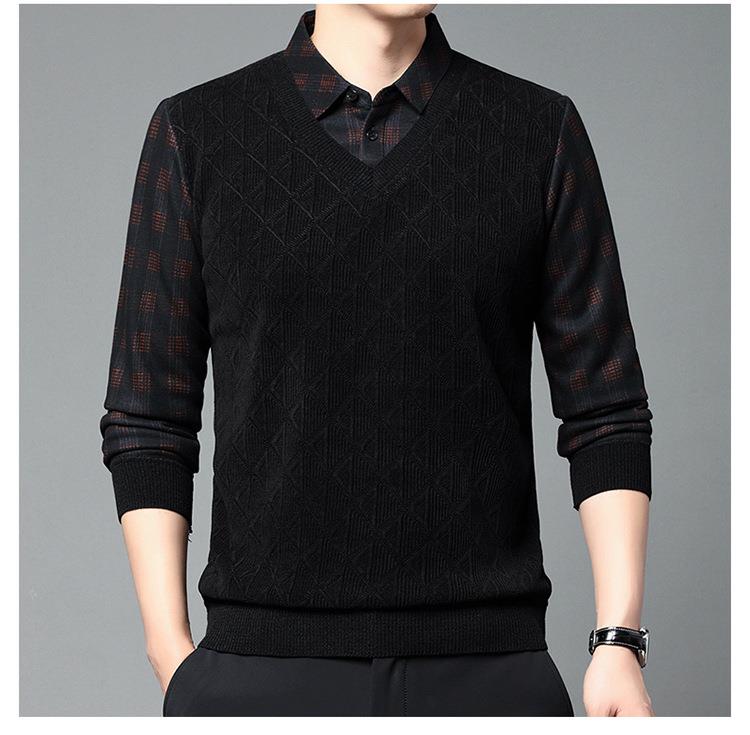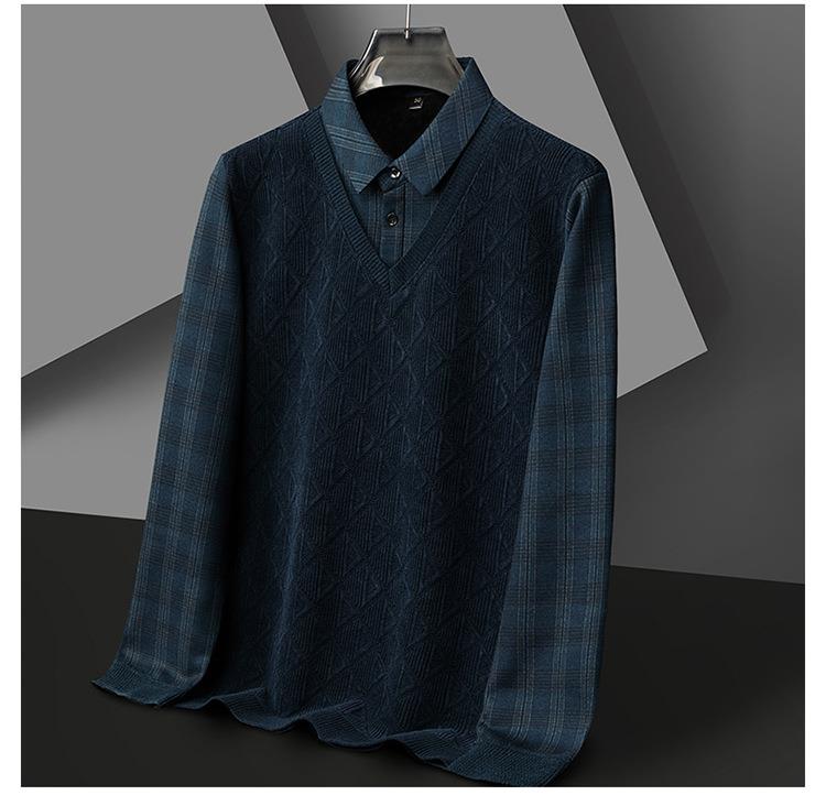 长袖加绒加厚假两件毛衣男士秋冬季新款衣提花打底衫