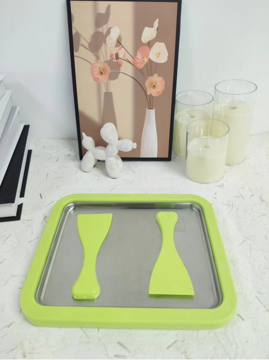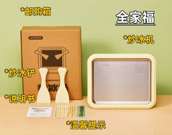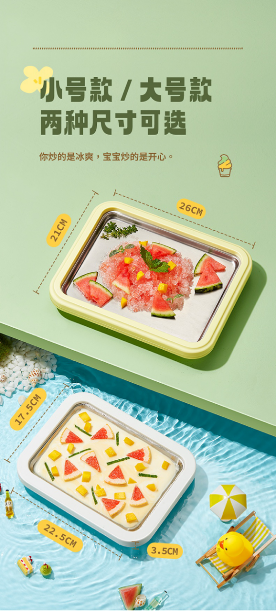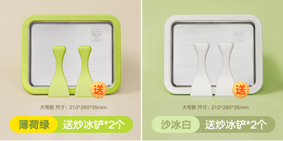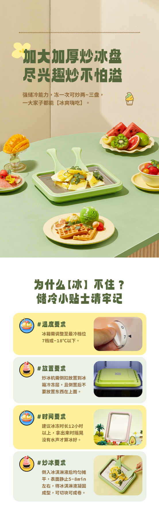 积米免插电炒冰机制冷小贴士: ①、家里冰箱需调整至最冷档位(❻~❼档)或-❶❽℃以下; ②、炒冰盘需倒扣并平放置到冰箱冷冻层,且倒置后不可再放置任何东西在炒冰机上面(以免冷冻不佳)。 ③、建议至少冰冻时长约❶❷小时以上,拿出来摇晃时没有听到水声才算完全冰好炒冰机。 ④、然后再倒入自备的酸奶或冰淇淋粉或饮料(倒入容量大概在80到100克左右最佳),需均匀摊平(不可铺太厚),摊平后表面需完全静止❸~❺分钟左右(等表面的酸奶水果冻硬成型)再拿炒冰铲切块装入杯中,即可品尝。 为什么没冻住,基本以下几种原因导致: ①、冰箱的冷冻层的温度没设置对 ②、没倒放炒冰机并且表面上有其他肉类(科普肉类在-1℃就可以冻硬,但炒冰机是液体,并不是说肉都硬了自然炒冰机也冻硬,这说法是错误的,同时炒冰机要在最冷档位(❻~❼档)或-❶❽℃才可以冻硬,摇晃没声音才算可以的) ③、倒入的酸奶或冰淇淋粉份量太多(建议80~100克),导致无法冻硬,同时使用倒牛奶去冻硬是错误的 1、炒冰机是无需插电 2、冷冻好后可炒冰1到3次 第1次使用的时候,将炒冰机金属面清洗一下后套上食品袋 操作一:将金属面朝下放到冰箱的冷冻室。 温馨提示(一定是冷冻室) 操作二:将冰箱的调温旋钮开关温度调的最大(数字6或7)(一般是零下-18度左右),放置12个小时以上 温馨提示(尽量不要和其它食物混放在一起避免产品吸收的冷度凝固点不够) 第四、从冰箱里面拿出来之后摇晃一下听不到里面的水声响,可证明这个产品已经冷冻好了 第五:那我们再把准备好的80~100克左右酸奶和水果粒铺在产品的金属面上。 用配置的铲刀将酸奶铺平静止3-5分钟左右。当食物凝固之后,可以用铲刀翻炒和食用了