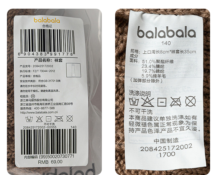 巴拉巴拉balaOne儿童袜子秋冬女童袜套中大童含羊毛堆堆袜套绞花