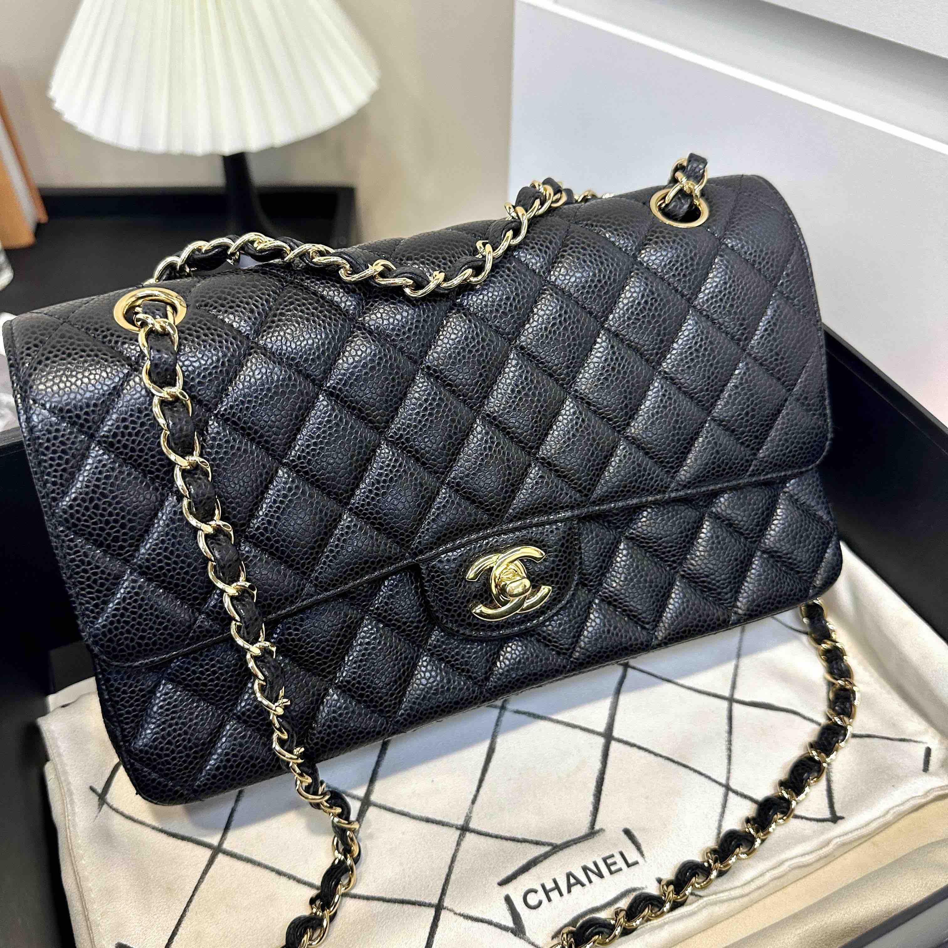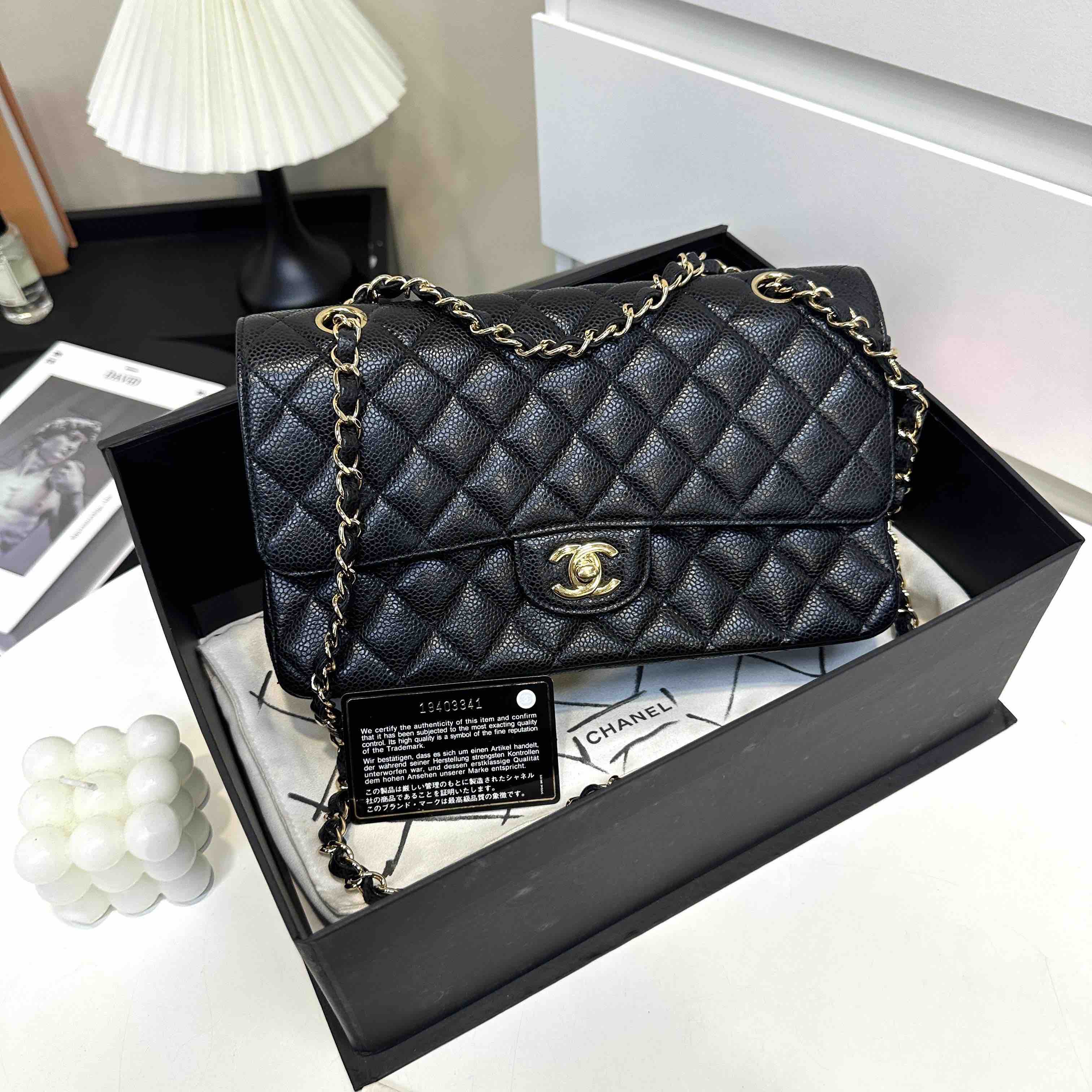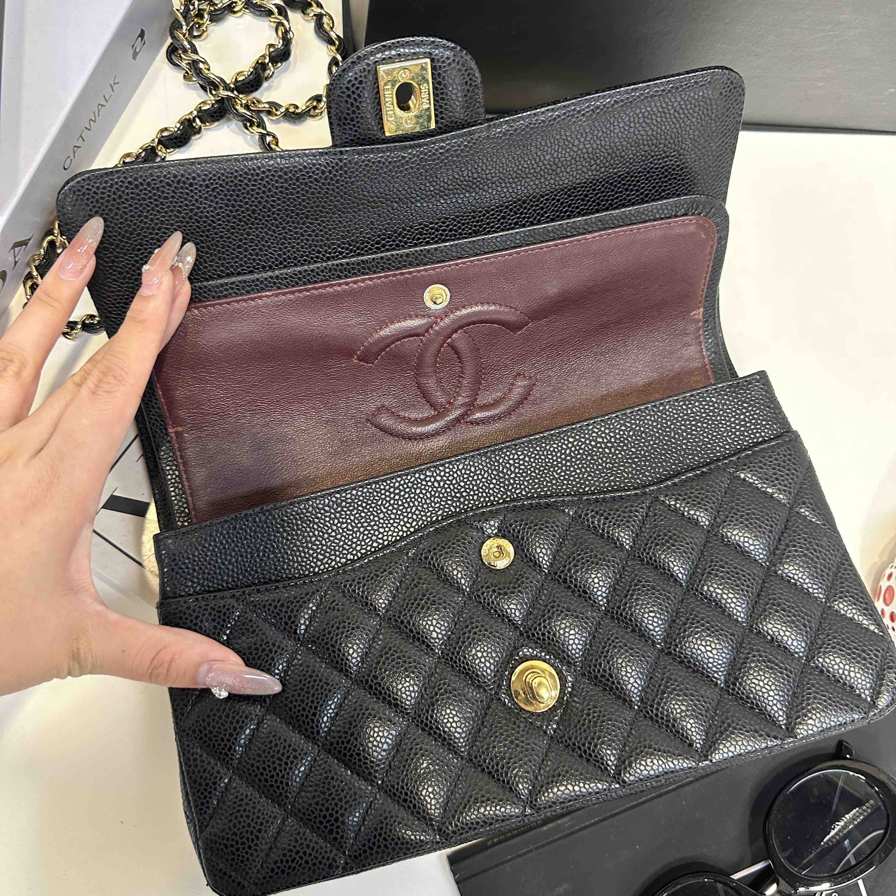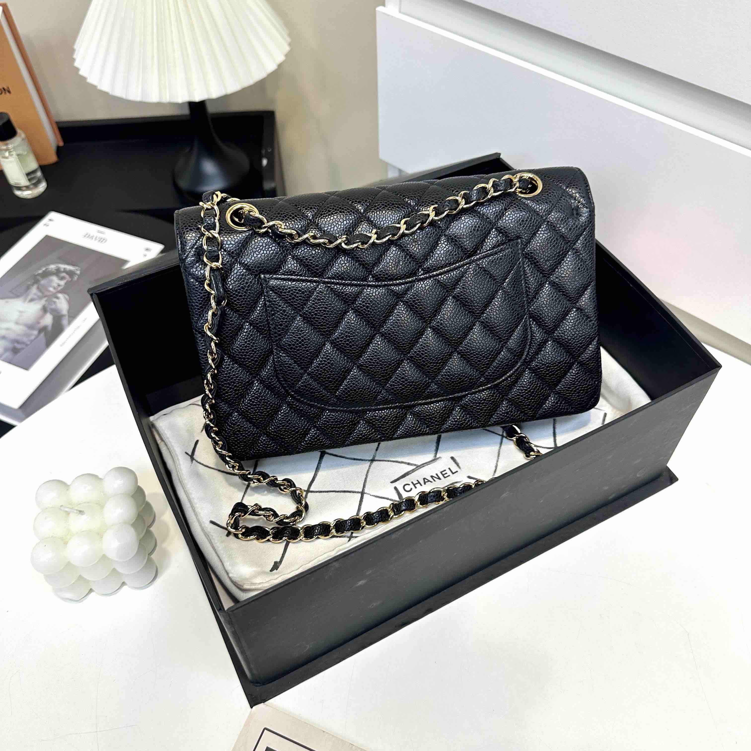 【商品详情】正品二手 CHANEL cf 中号 黑金 荔枝纹牛皮 斜挎包🧚🏻♀️97新 25x15 镭射19开 配件:卡、盒、防尘袋。包身轻微使用感 内翻盖轻微使用磨损 整体状态好