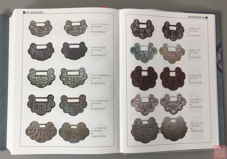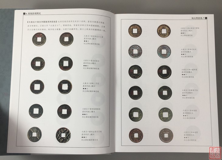 三、全书共分八个章节,第一章钱文类套花按历史年代排列,其余章节均按钱币的尺寸由小到大排列,方便读者阅读查询。