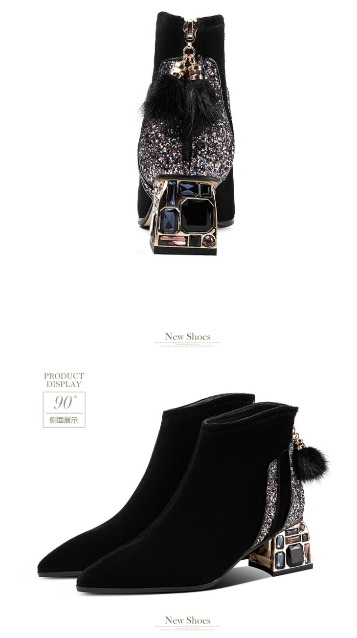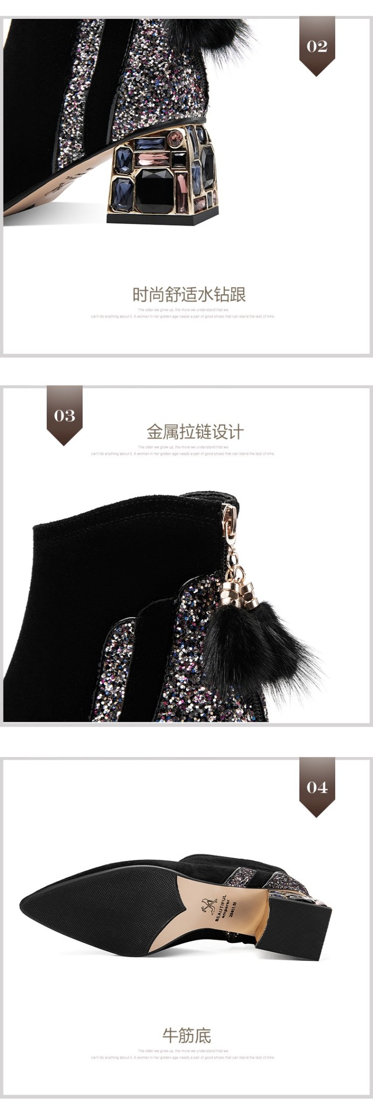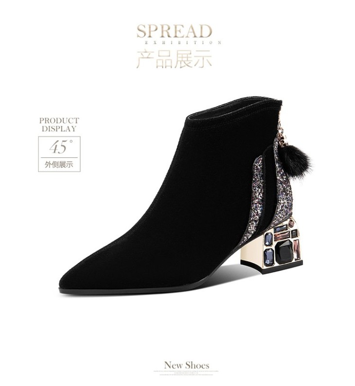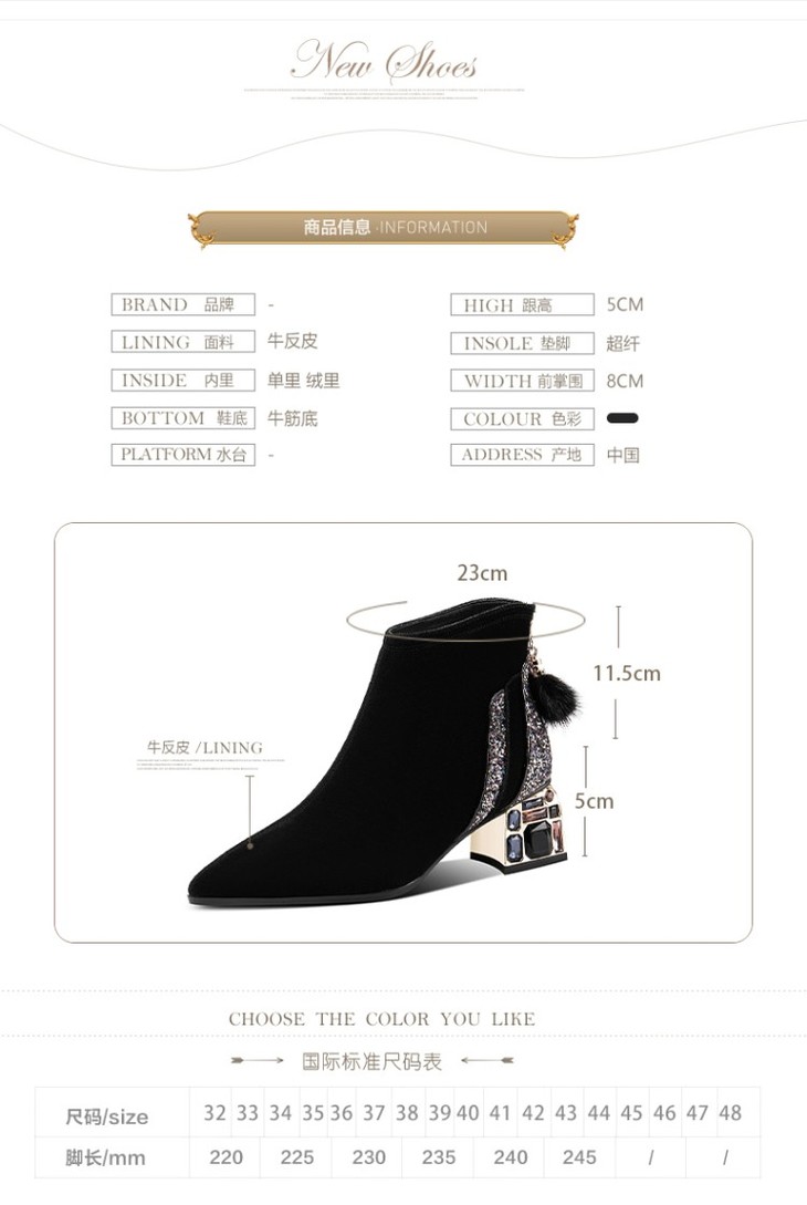 【预售5天】大小码时装靴拼色电镀跟水钻中跟鞋秋冬季新款女鞋尖头粗跟短靴子XME&w9211