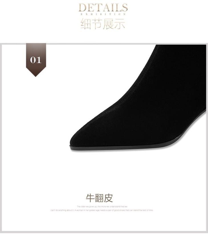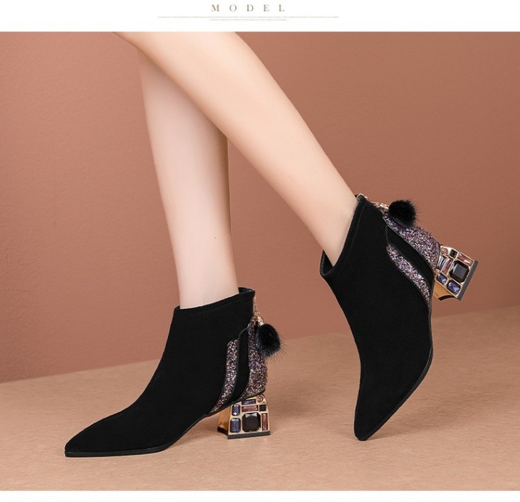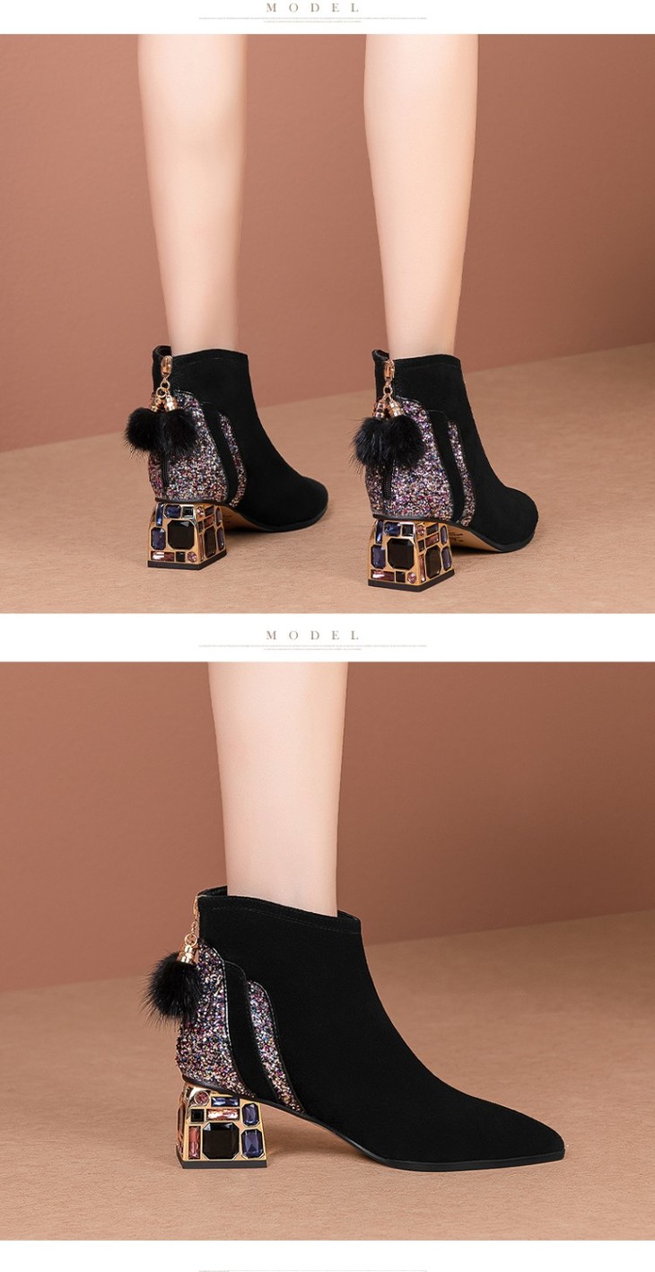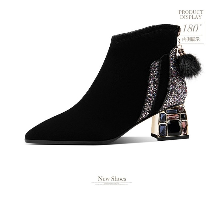 【预售5天】大小码时装靴拼色电镀跟水钻中跟鞋秋冬季新款女鞋尖头粗跟短靴子XME&w9211