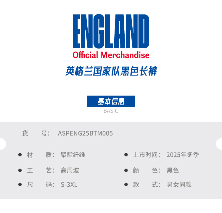 【官方正版】英格兰国家队 | 秋冬新款黑色长裤运动休闲裤卫裤