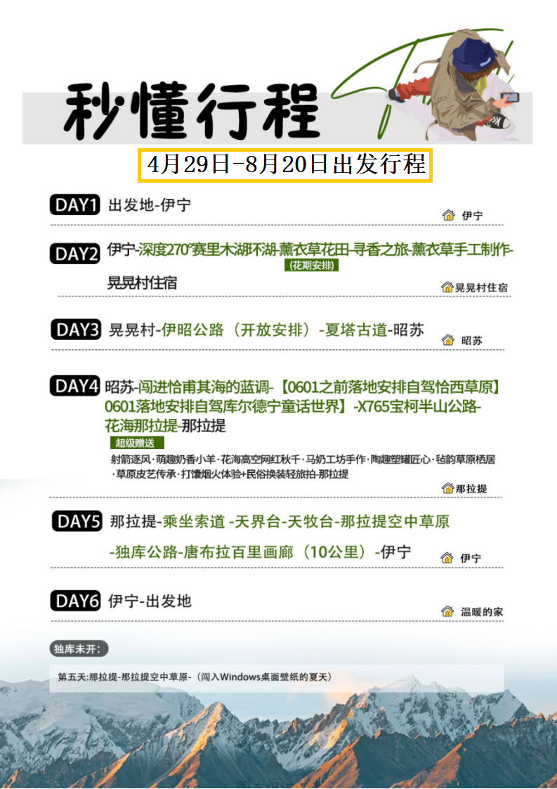 3、季节限定:薰衣草花海(6月)、吐尔根杏花(4月初)开放则安排,美景不错过。