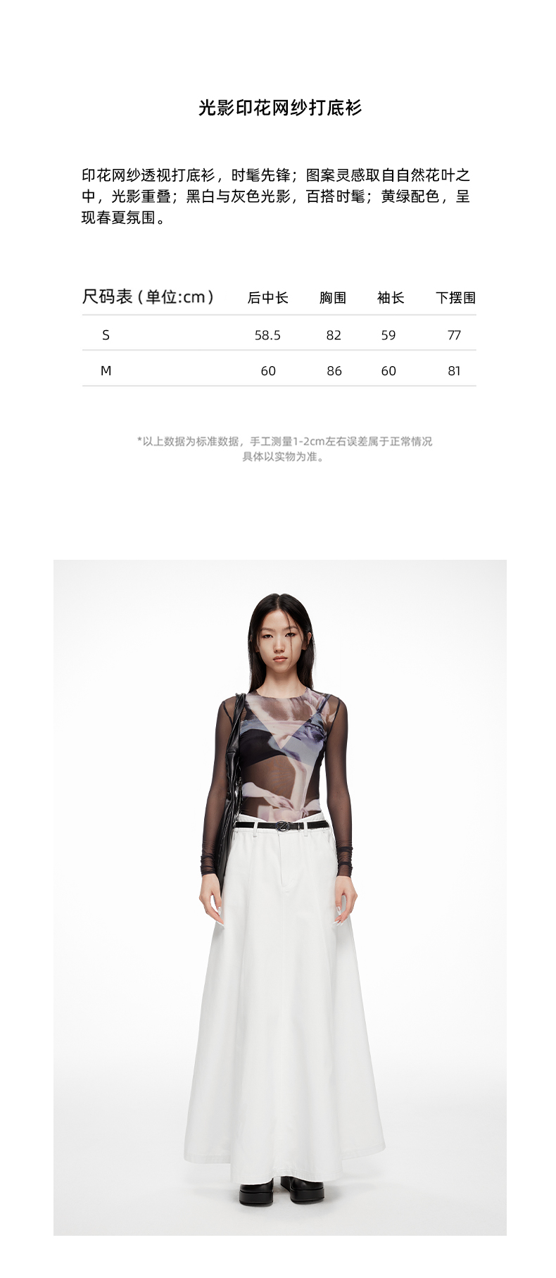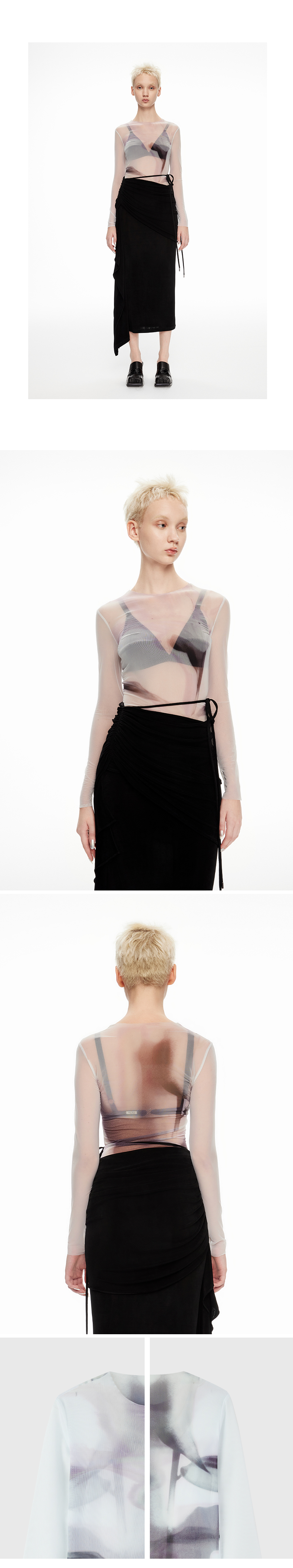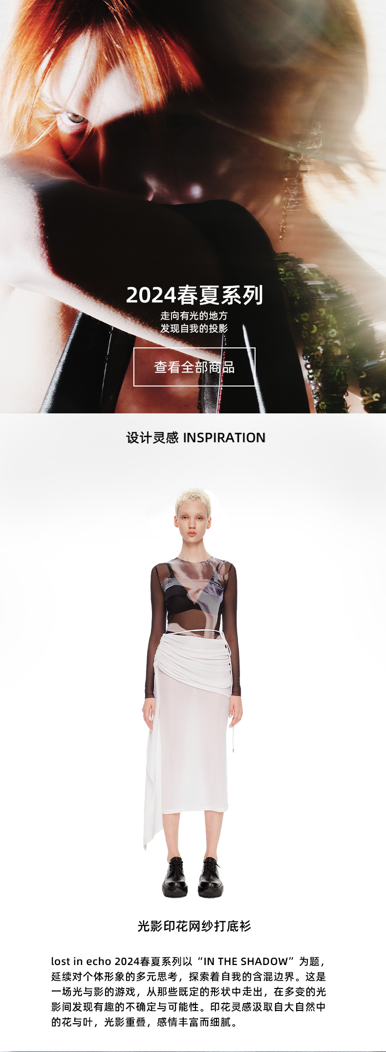 lost in echo2024春季新款设计师品牌光影独特印花网纱透视打底衫