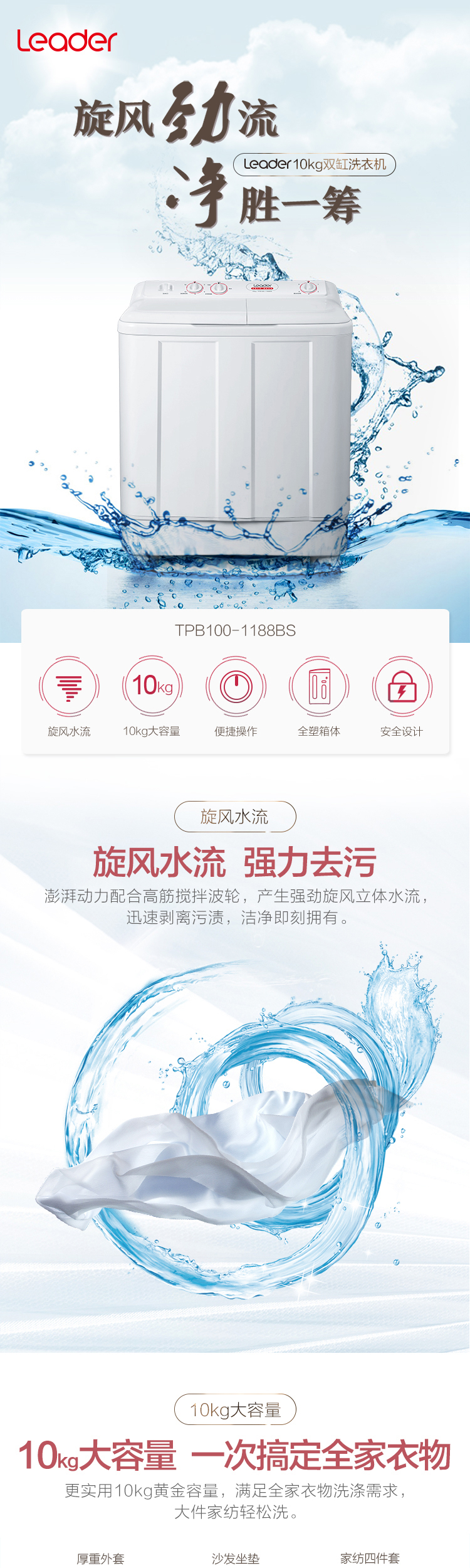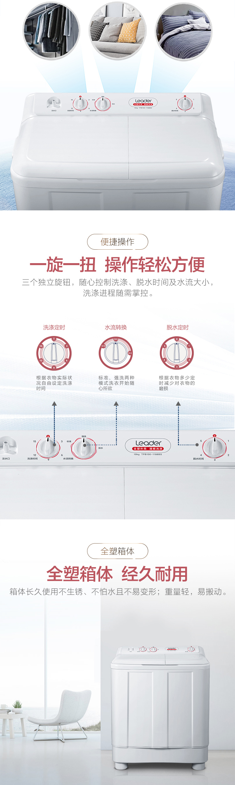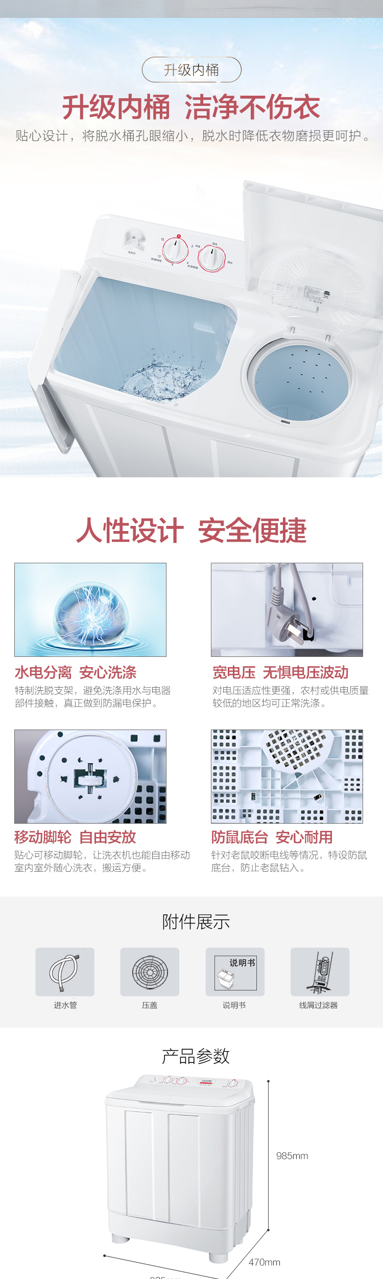海尔统帅10kg大容量双缸半自动洗衣机 强力去污