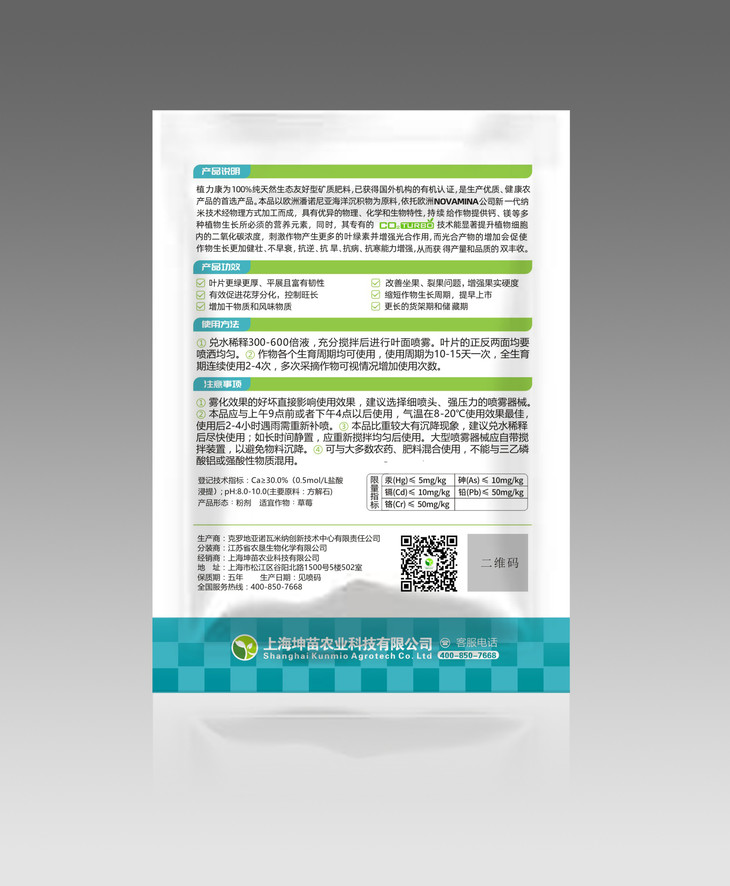 本产品采用欧洲纳米研究所的技术,将沉积岩破解为微纳米粒子,粒径可达8000目,可以具备很好的悬浮性、吸附性,通过兑水喷施到叶片后,能够快速通过气孔进入植株体内,持续释放CO2和其它各种元素,显著增强植株的健壮度。
