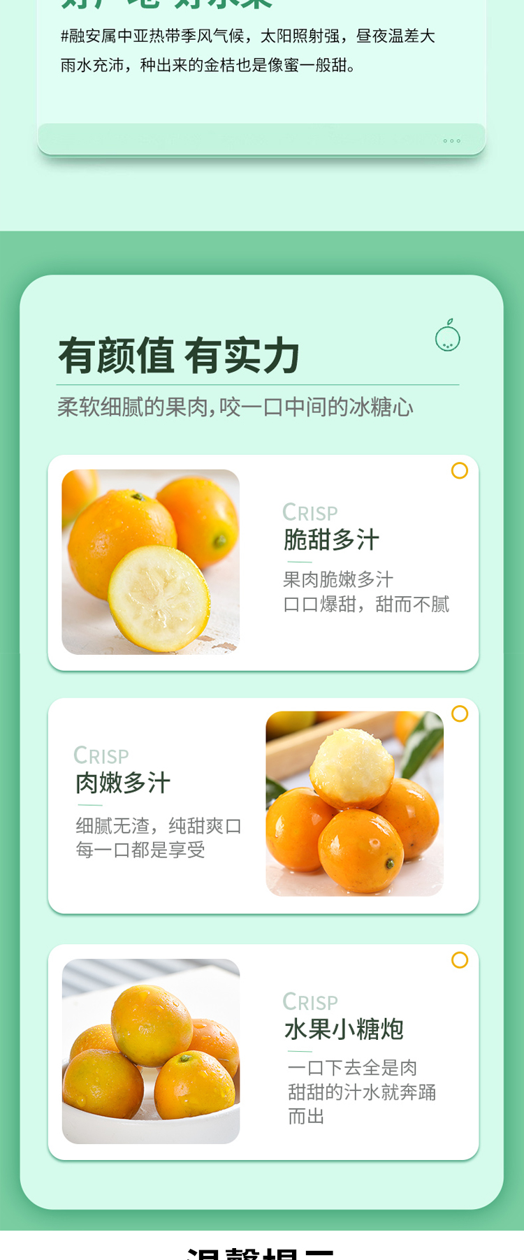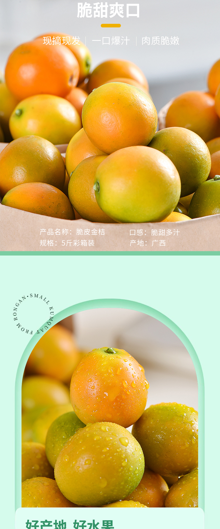 脆皮小金桔 身材娇小 从皮甜到芯里 一口一个果肉脆嫩 有独特香味 表皮青黄相间 清甜可口 老人小孩都爱吃