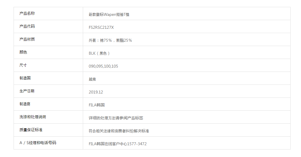 韩国F家斐乐韩国新款徽标Wapen短袖T恤FS2RSC2127X_BLKJPY带授权招加盟代理