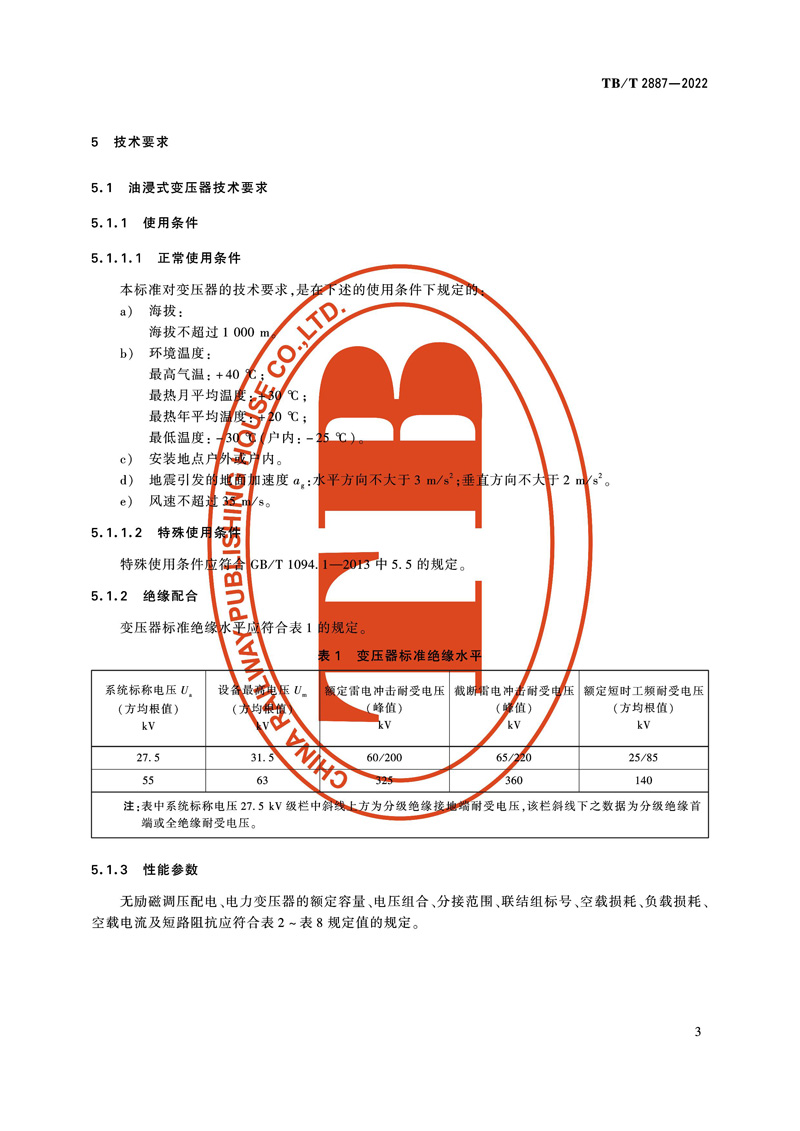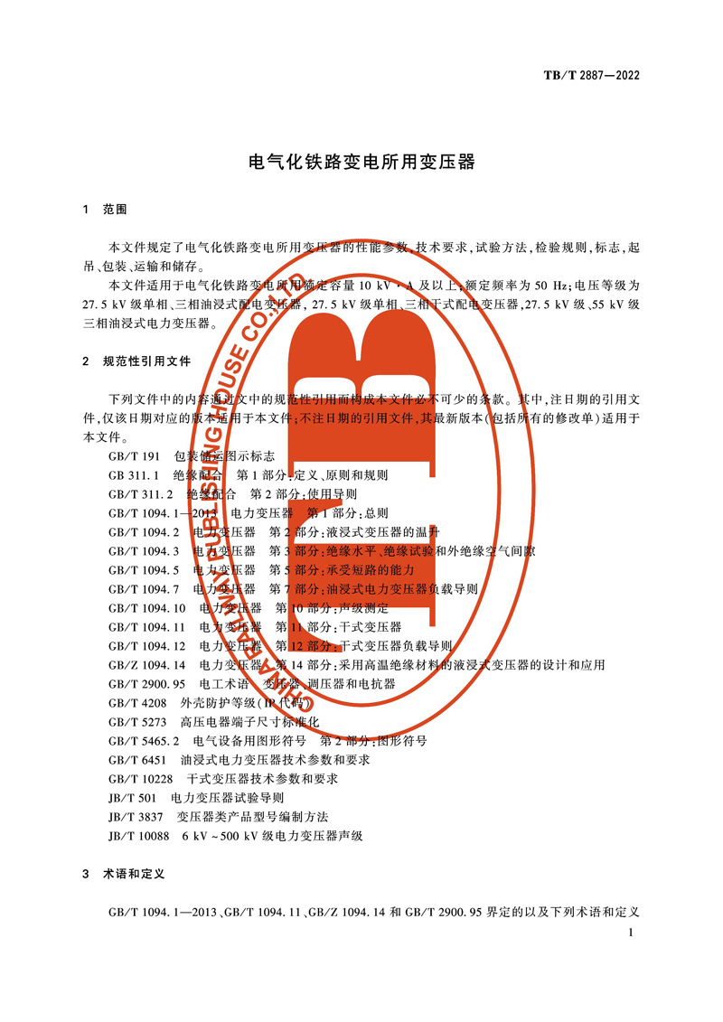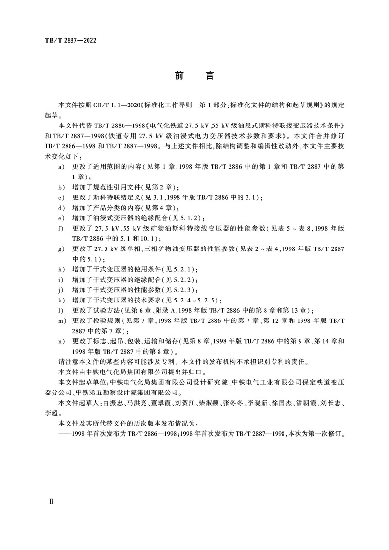 本标准为国家铁路局发布的中华人民共和国铁道行业标准,电气化铁路变电所用变压器 TB/T 2887-2022。本文件按照 GB/T 1.1—2020《标准化工作导则 第1部分:标准化文件的结构和起草规则》的规定起草。本文件代替TB/T 2886-1998《电气化铁道27.5kV、55kV级油浸式斯科特联接变压器技术条件》和TB/T 2887-1998《铁道专用27.5kV级油浸式电力变压器技术参数和要求》,本文件合并修订TB/T 2886-1998和TB/T 2887-1998。本文件规定了电气化铁路变电所用变压器的性能参数、技术要求、试验方法、检验规则、标志、起吊、包装、运输和储存。本文件适用于电气化铁路变电所用额定容量10kV•A及以上;额定频率为50Hz;电压等级为27.5kV级单项、三相油浸式配电变压器,27.5kV级单向、三相干式配电变压器,27.5kV级、55kV级三相油浸式电力变压器。