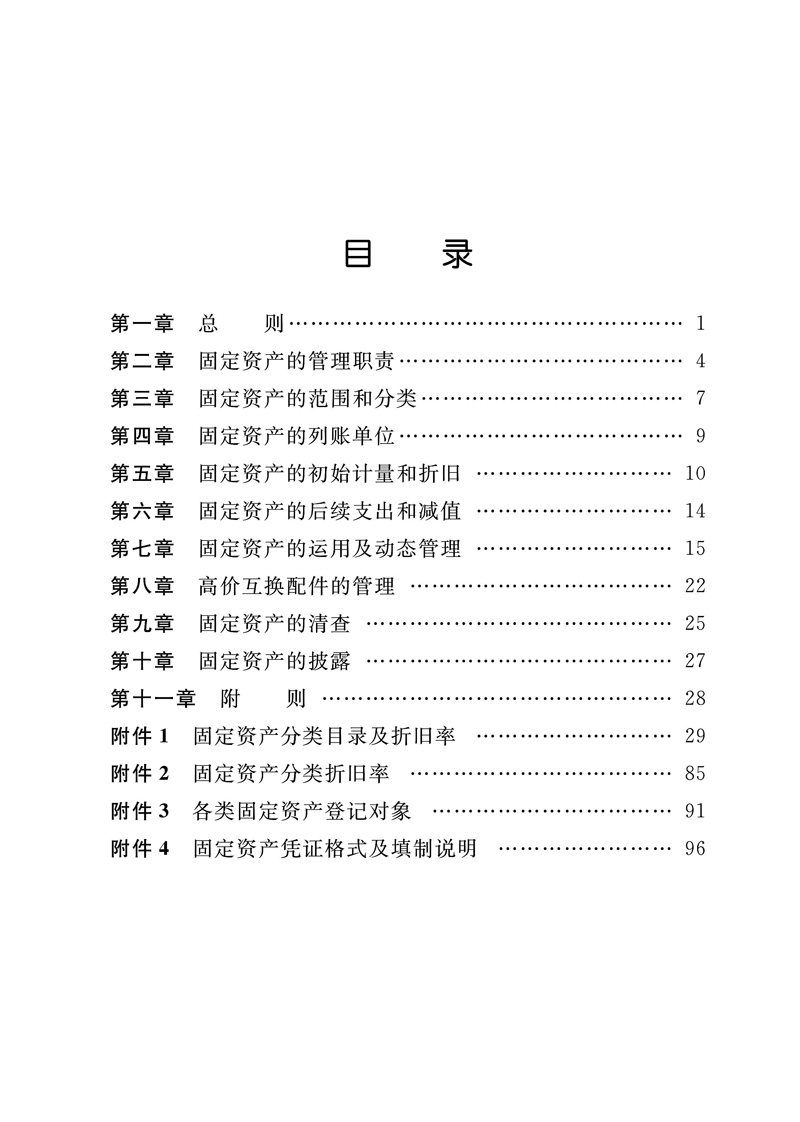 本办法主要内容包括十一章:第一章总则,第二章固定资产的管理职责,第三章固定资产的范围和分类,第四章固定资产的列账单位,第五章固定资产的初始计量和折旧,第六章固定资产的后续支出和减值,第七章固定资产的 运用及动态管理,第八章高价互换配件的管理,第九章固定资产的清查,第十章固定资产的披露,第十一章附则。另有附件:固定资产分类目录,固定资产分类折旧率、高价互换配件分类折旧率,各类固定资产登记对象,固定资产凭证格式和填制说明。