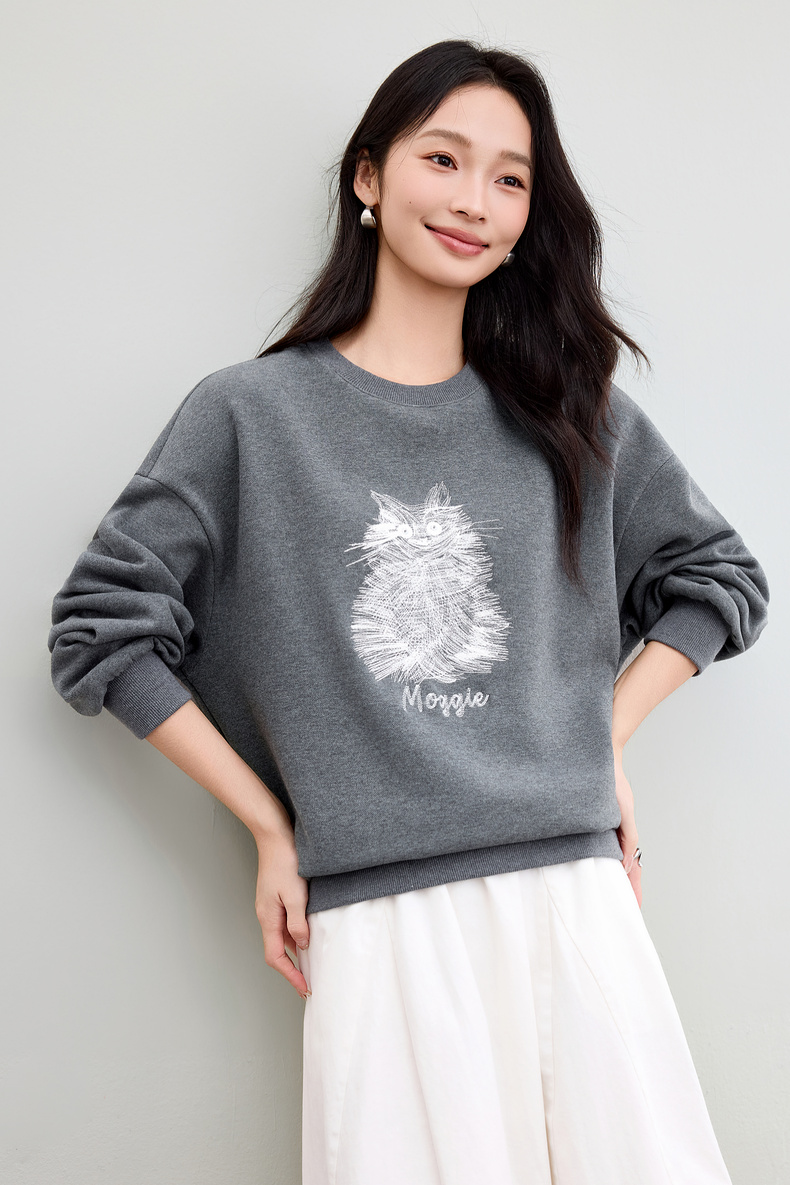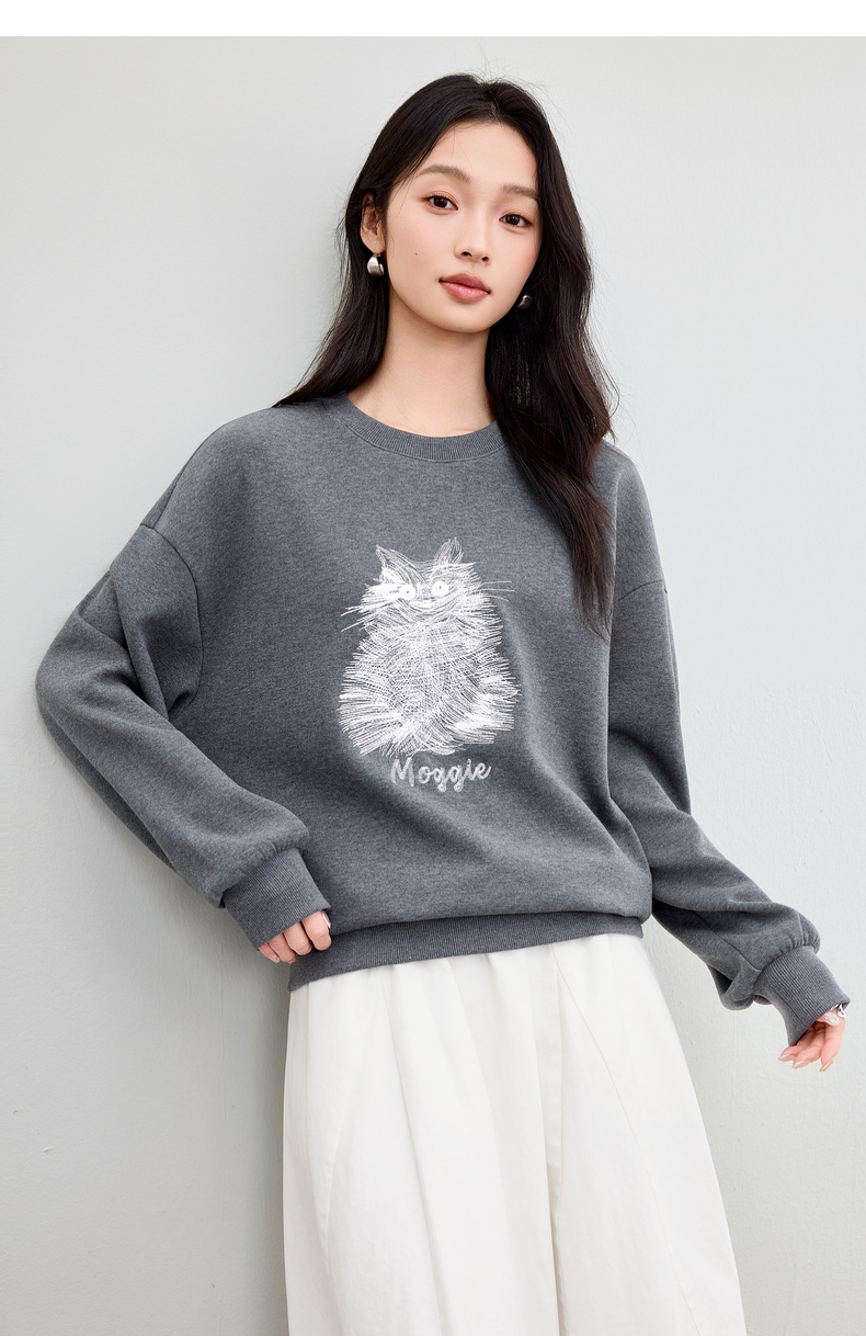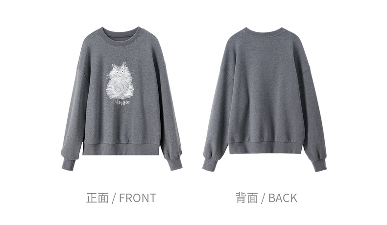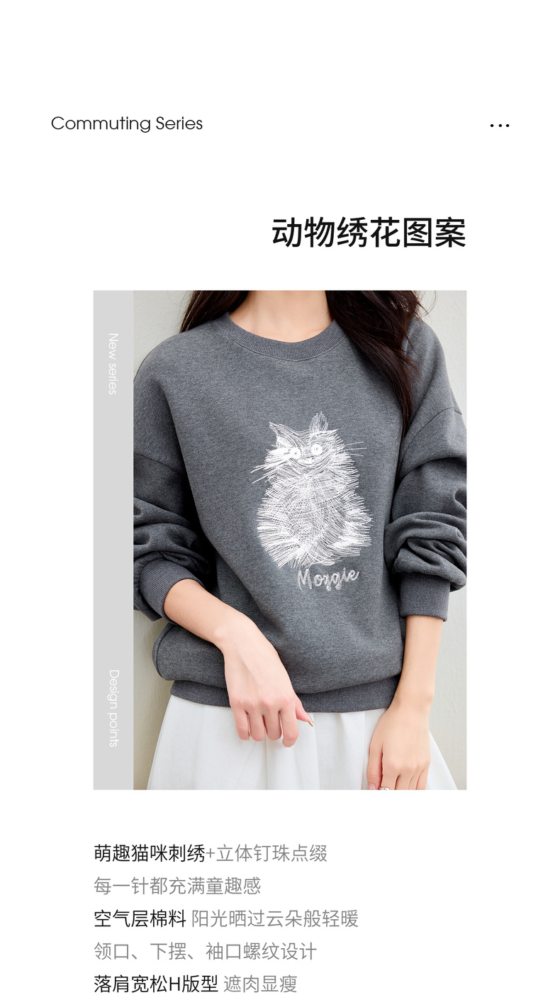 【内购】【猫咪字母刺绣】猫咪和字母刺绣钉珠点缀H型圆领棉料卫衣-153AF3658