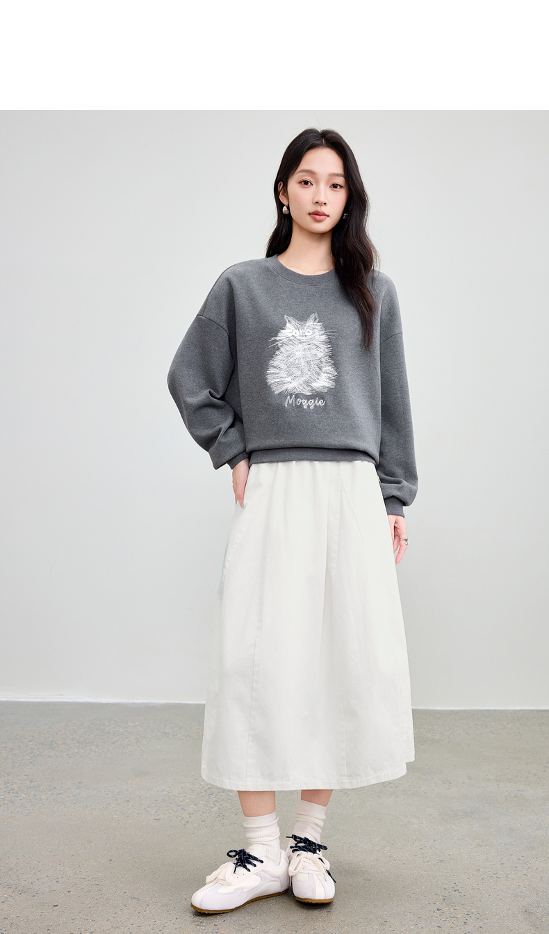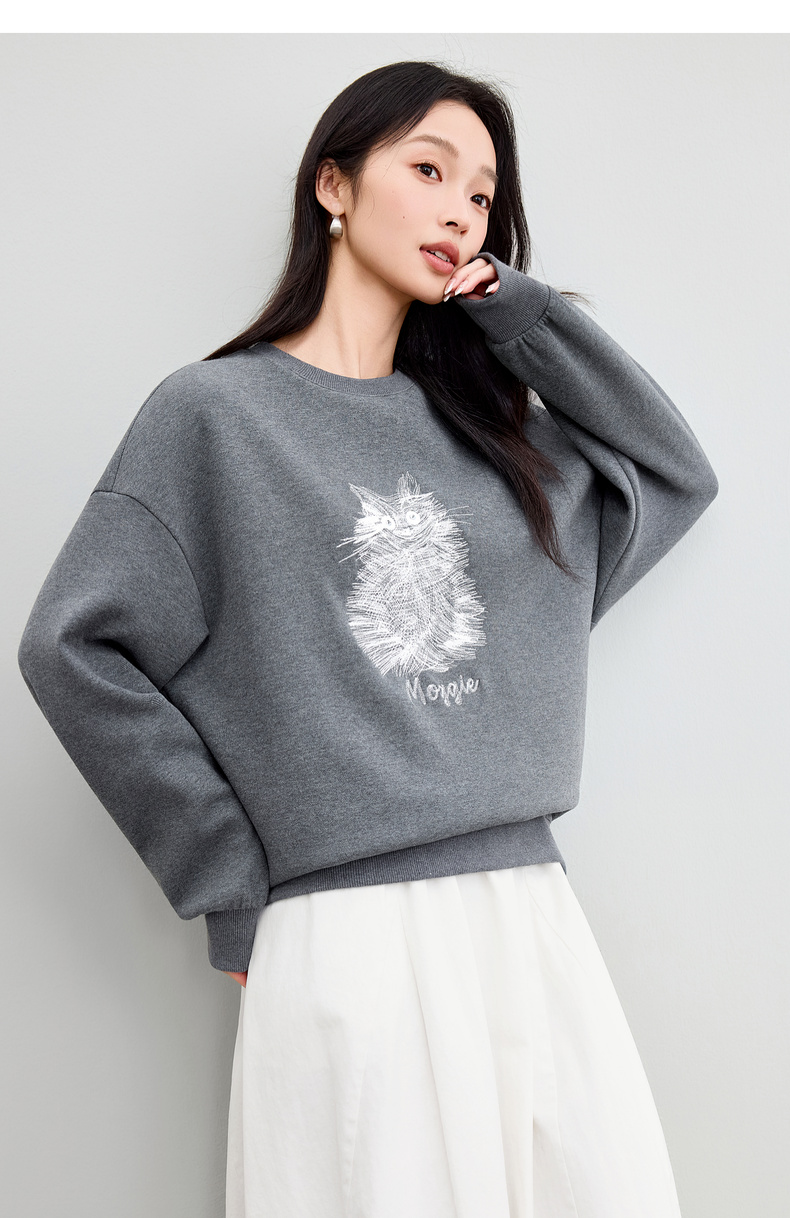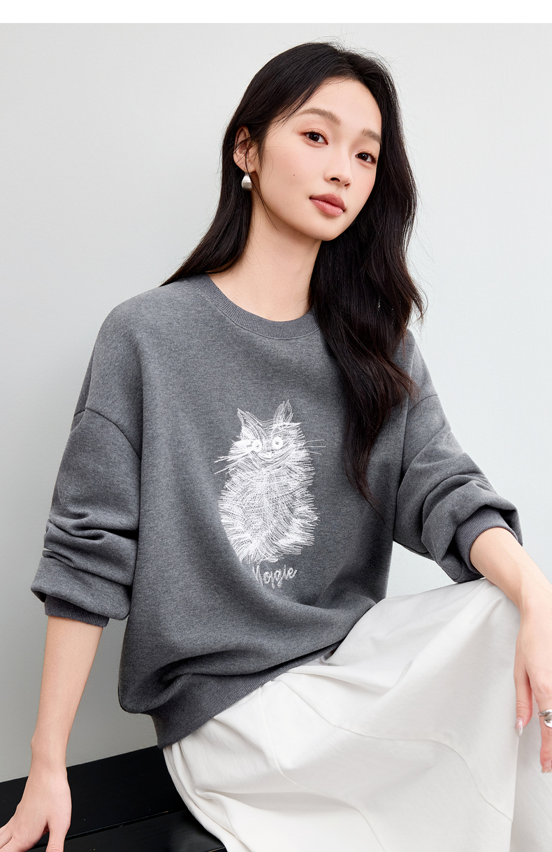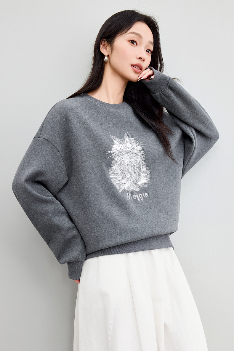 【内购】【猫咪字母刺绣】猫咪和字母刺绣钉珠点缀H型圆领棉料卫衣-153AF3658