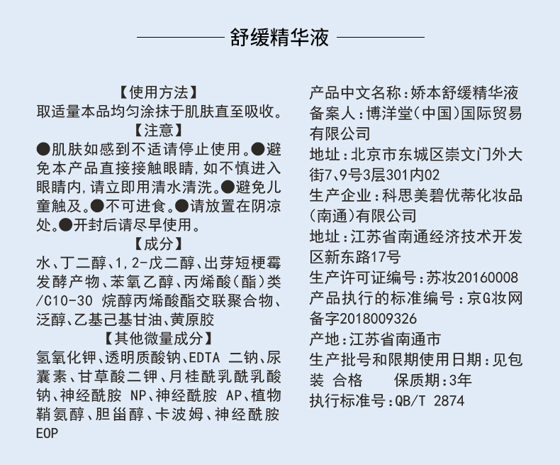 | 京G妆网备字2018009326 | 娇本舒缓精华液 |