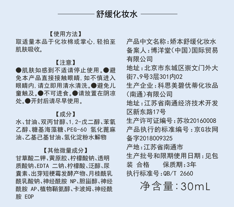 | 京G妆网备字2018009325 | 娇本舒缓化妆水 |