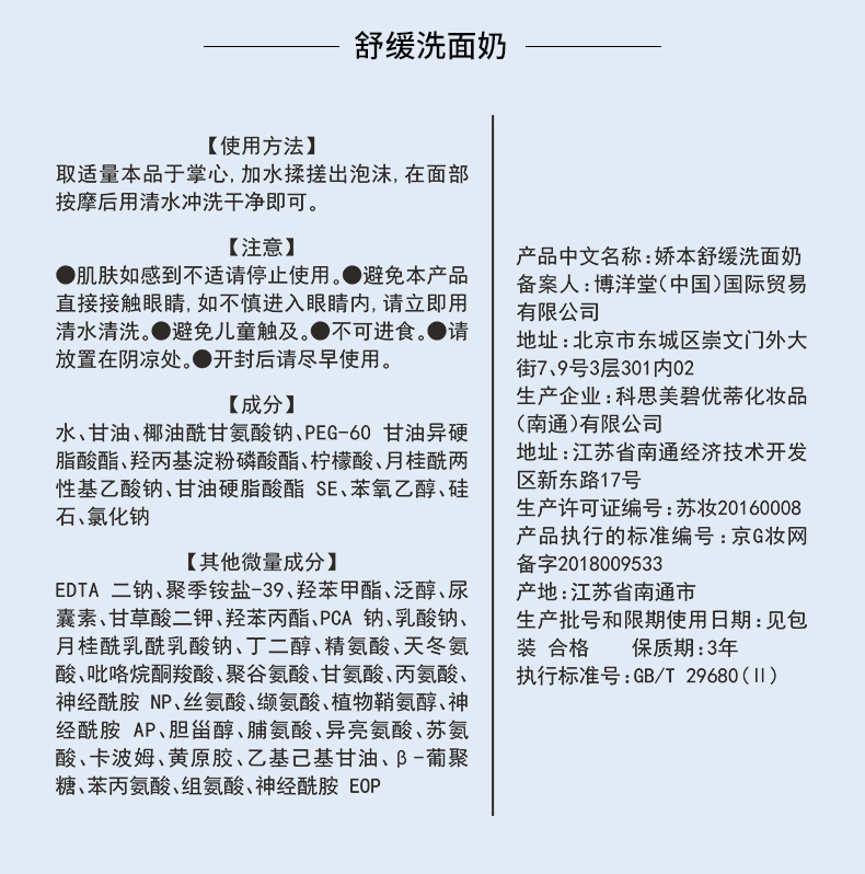 | 京G妆网备字2018009533 | 娇本舒缓洗面奶 |