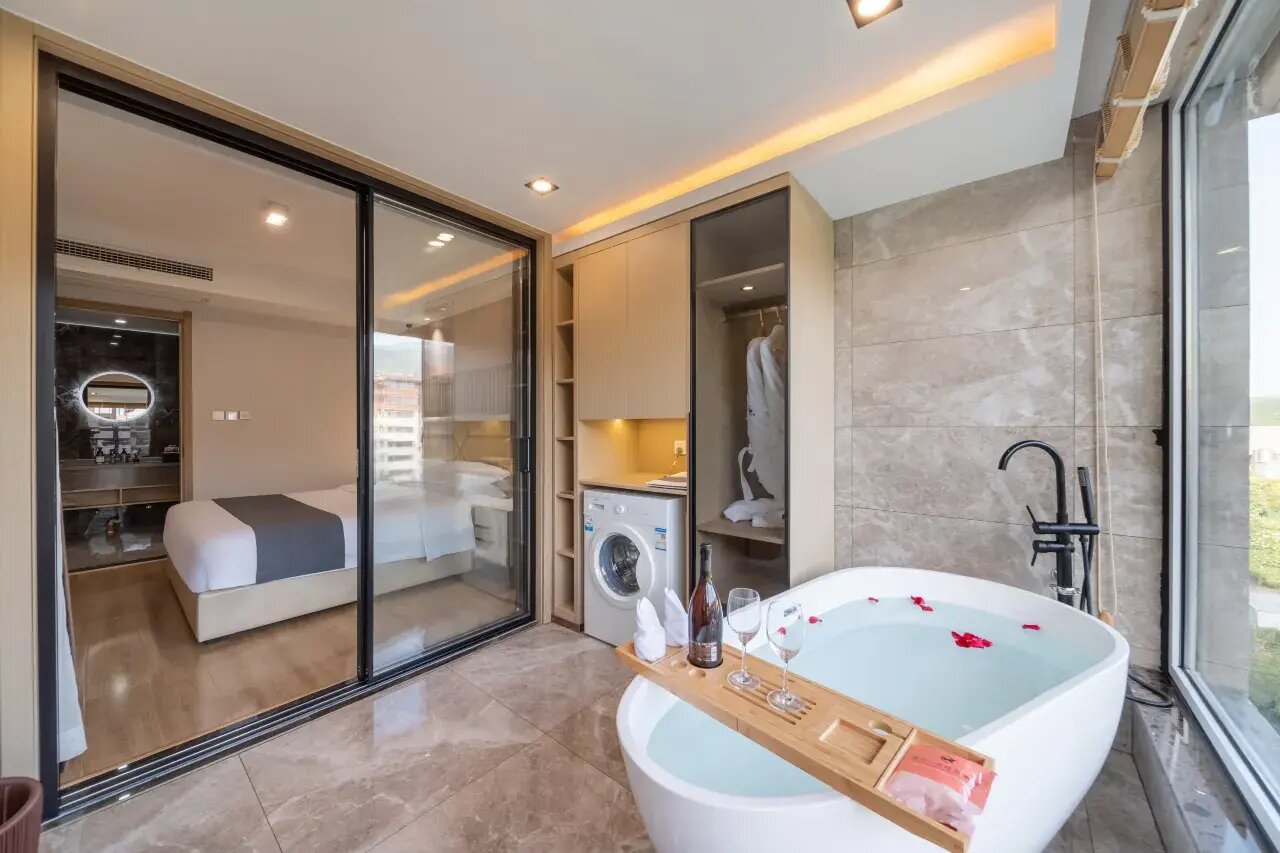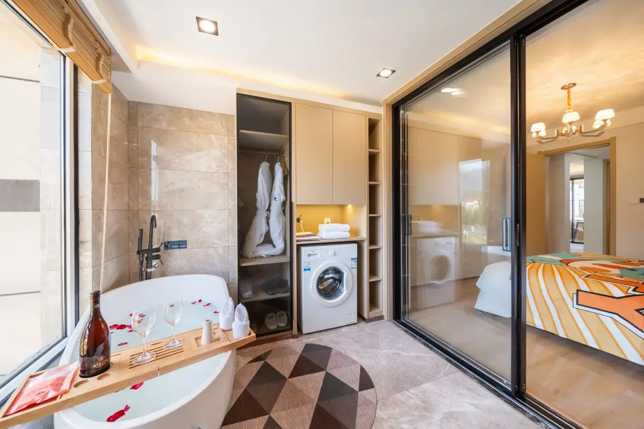 1张1.8大床 及 1张1.5米大床,85–90平方米(2个卧室+1个客厅+1个洗手间+厨房+浴缸+洗衣机)