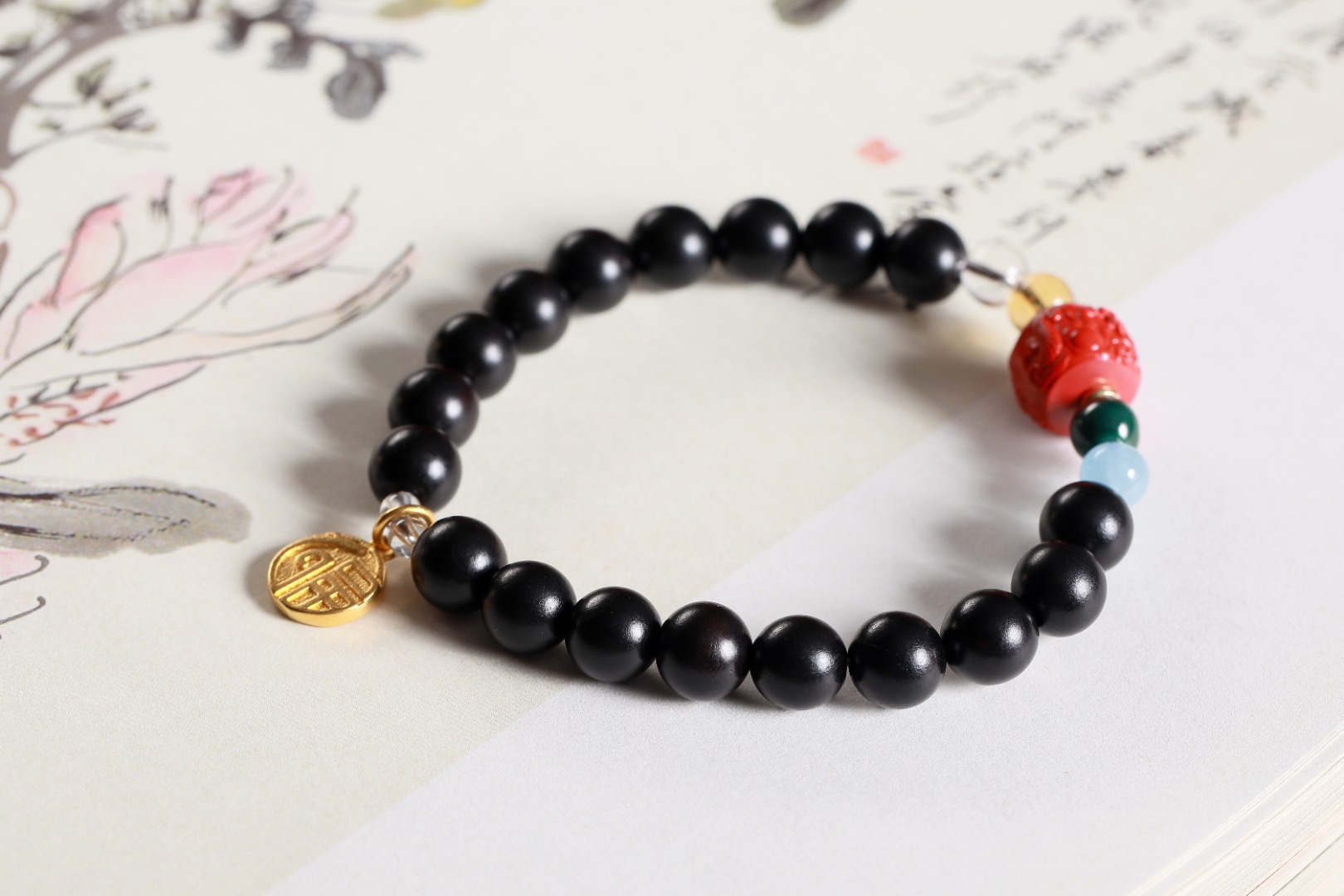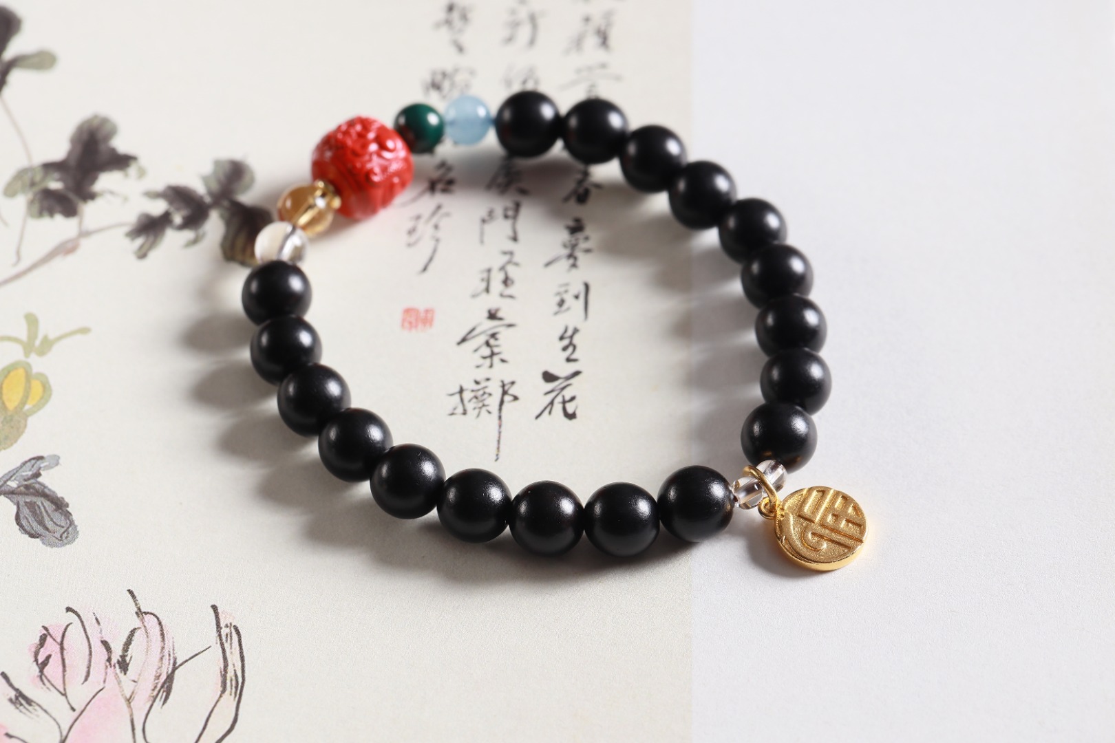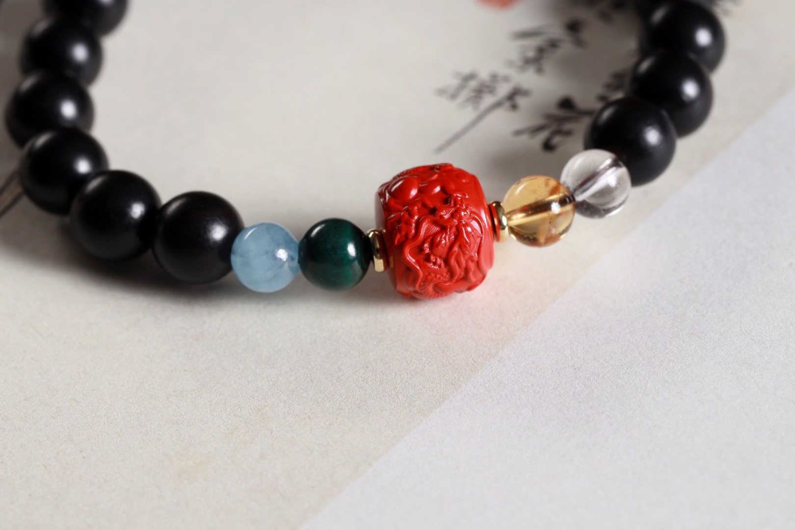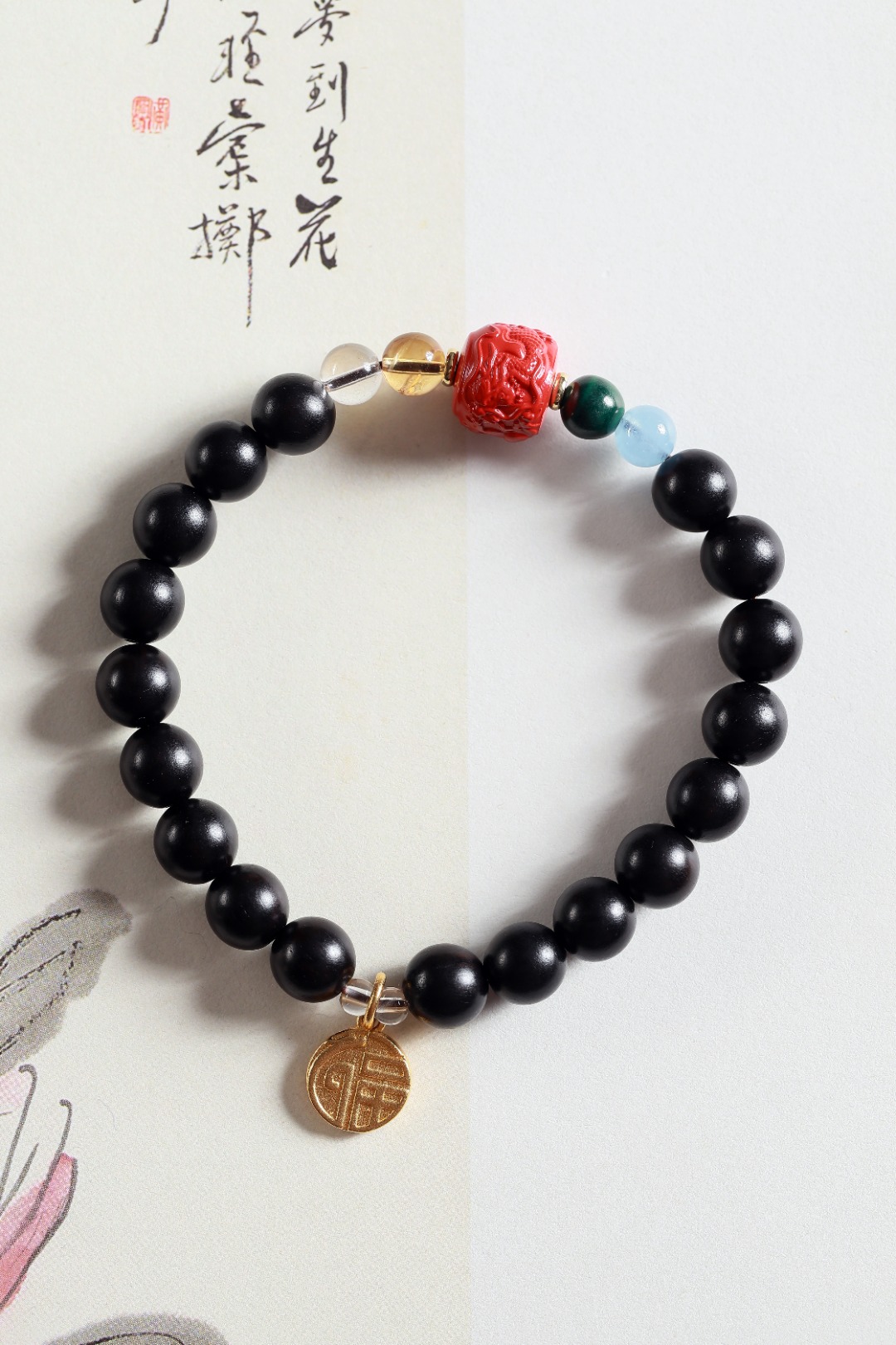 【设计理念】新中式风是独有的东方古典美,百看不厌,爆红朱砂龙桶珠与醒沙金龙福吊坠搭配,散发出浓厚的春节氛围,手串中还串联了白水晶与海蓝宝等多彩矿石,有着温暖的色彩和光泽,让你在新的一年里闪闪发光,更加自信。