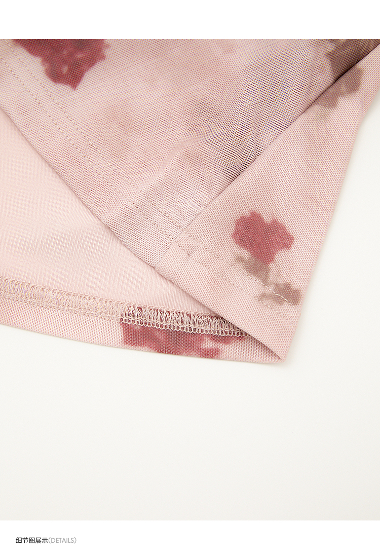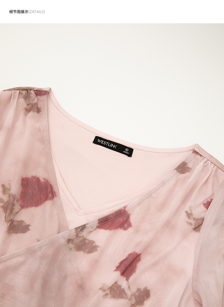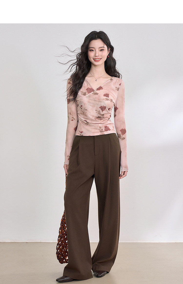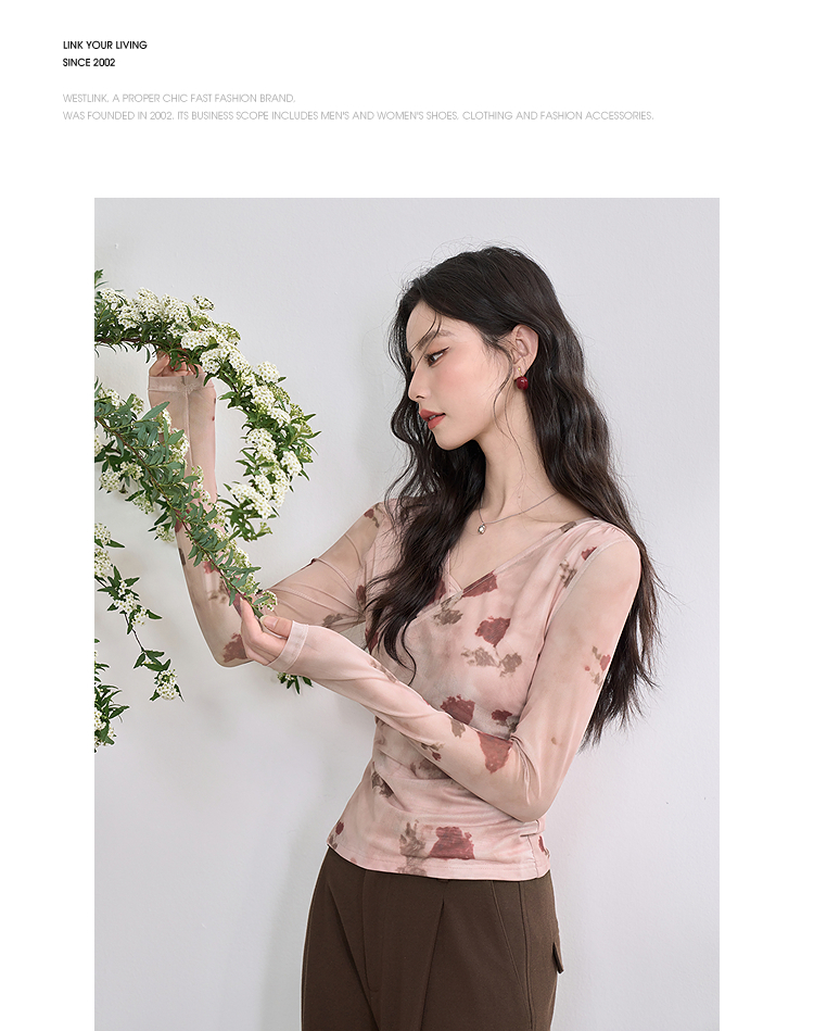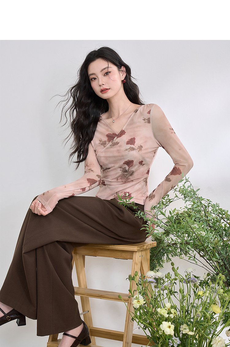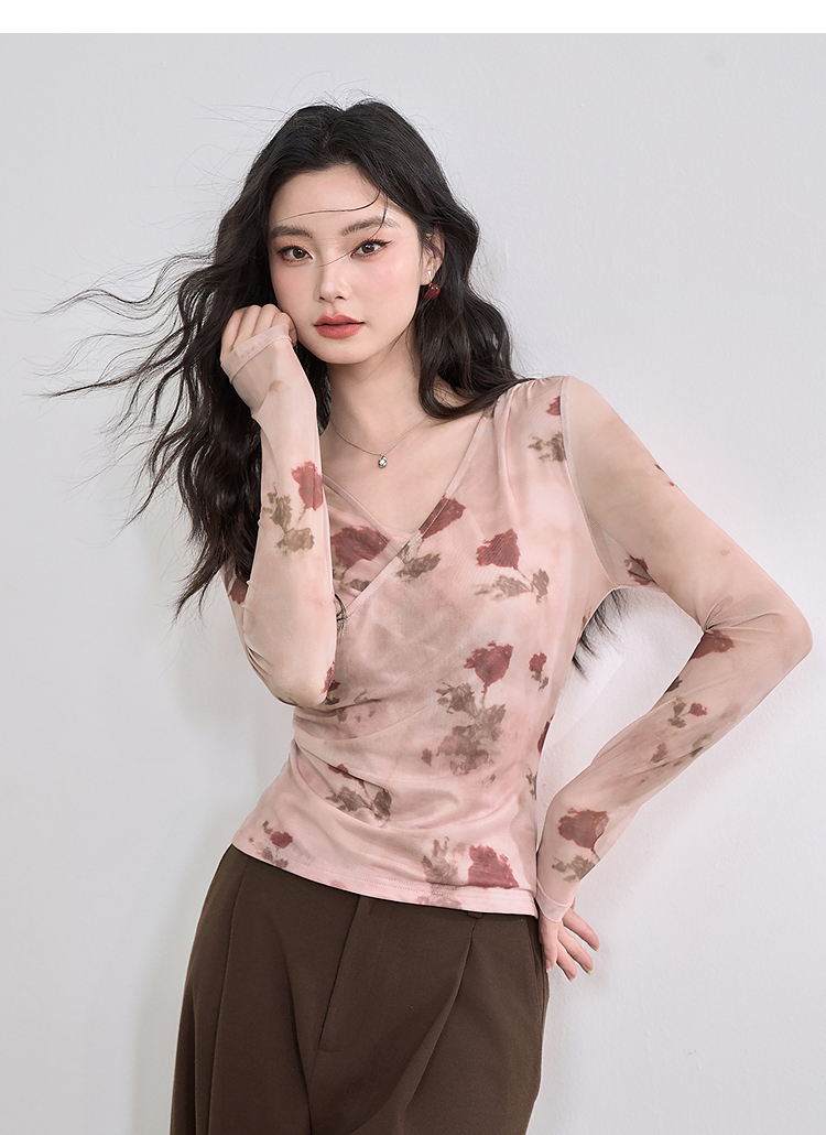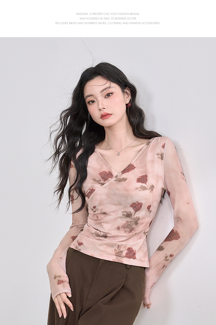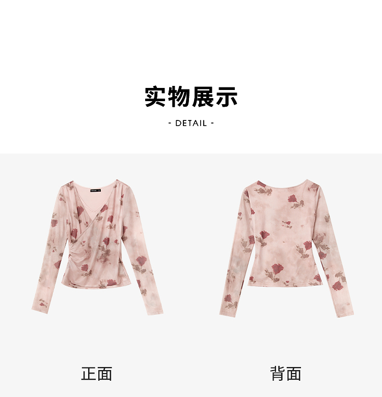 纯欲辣妹风玫瑰印花V领长袖T恤女2025春夏收腰修身上衣V0550223